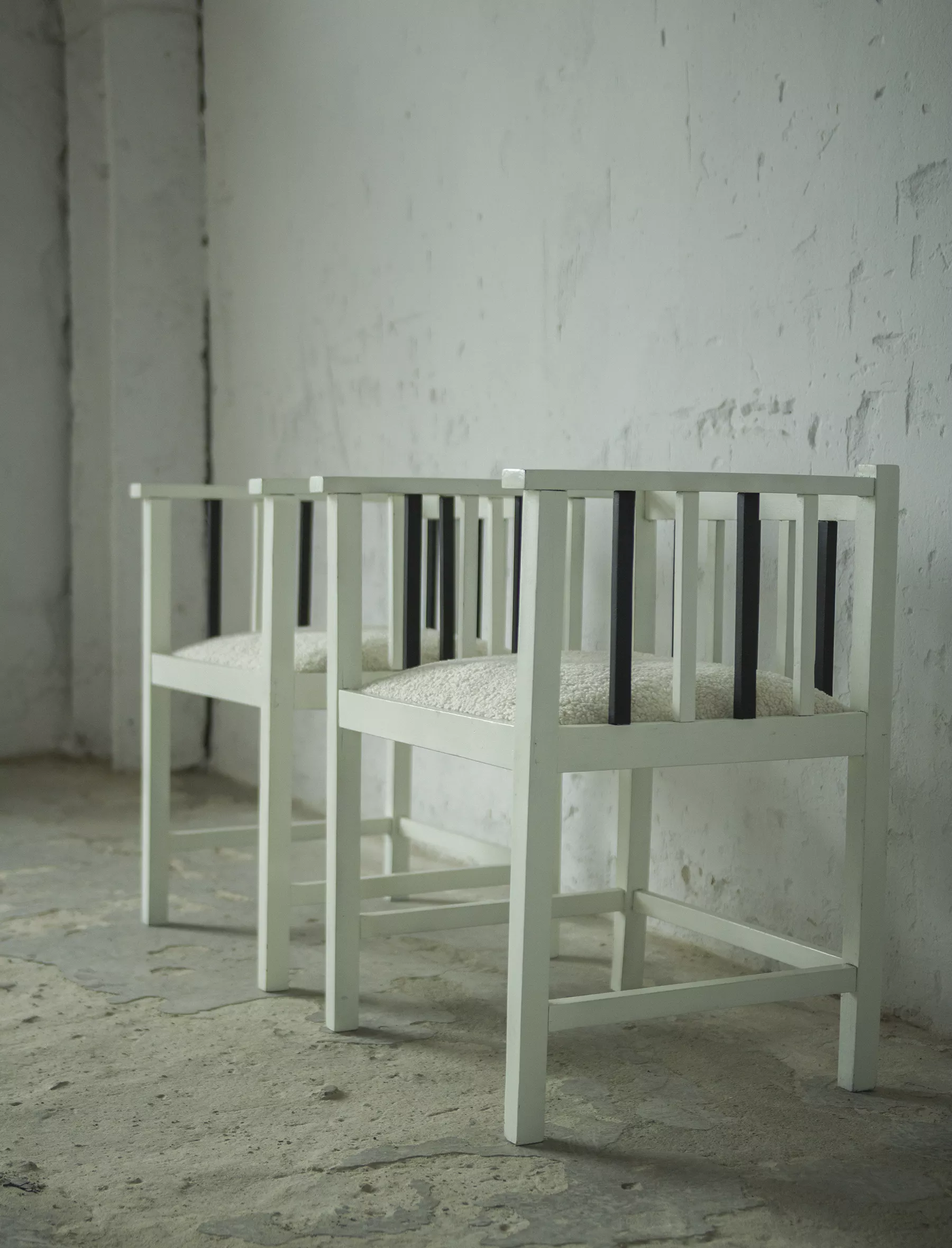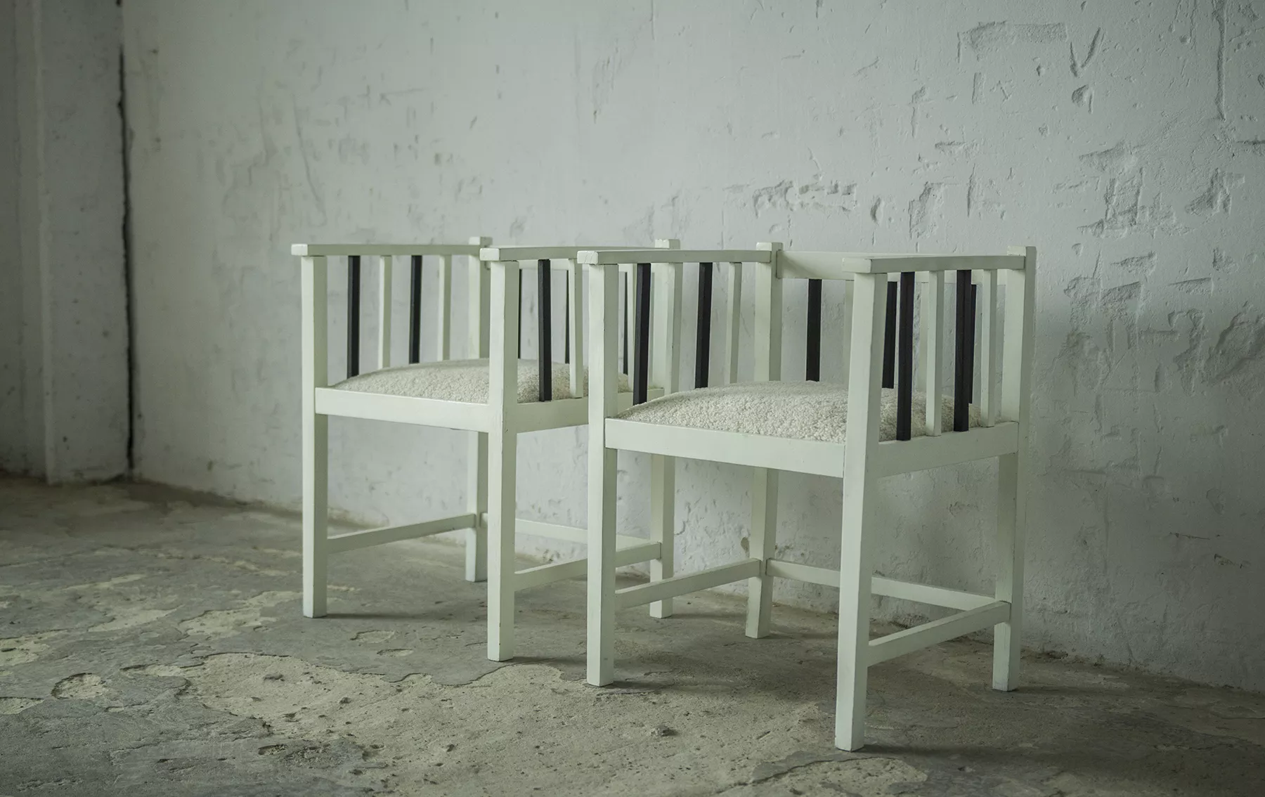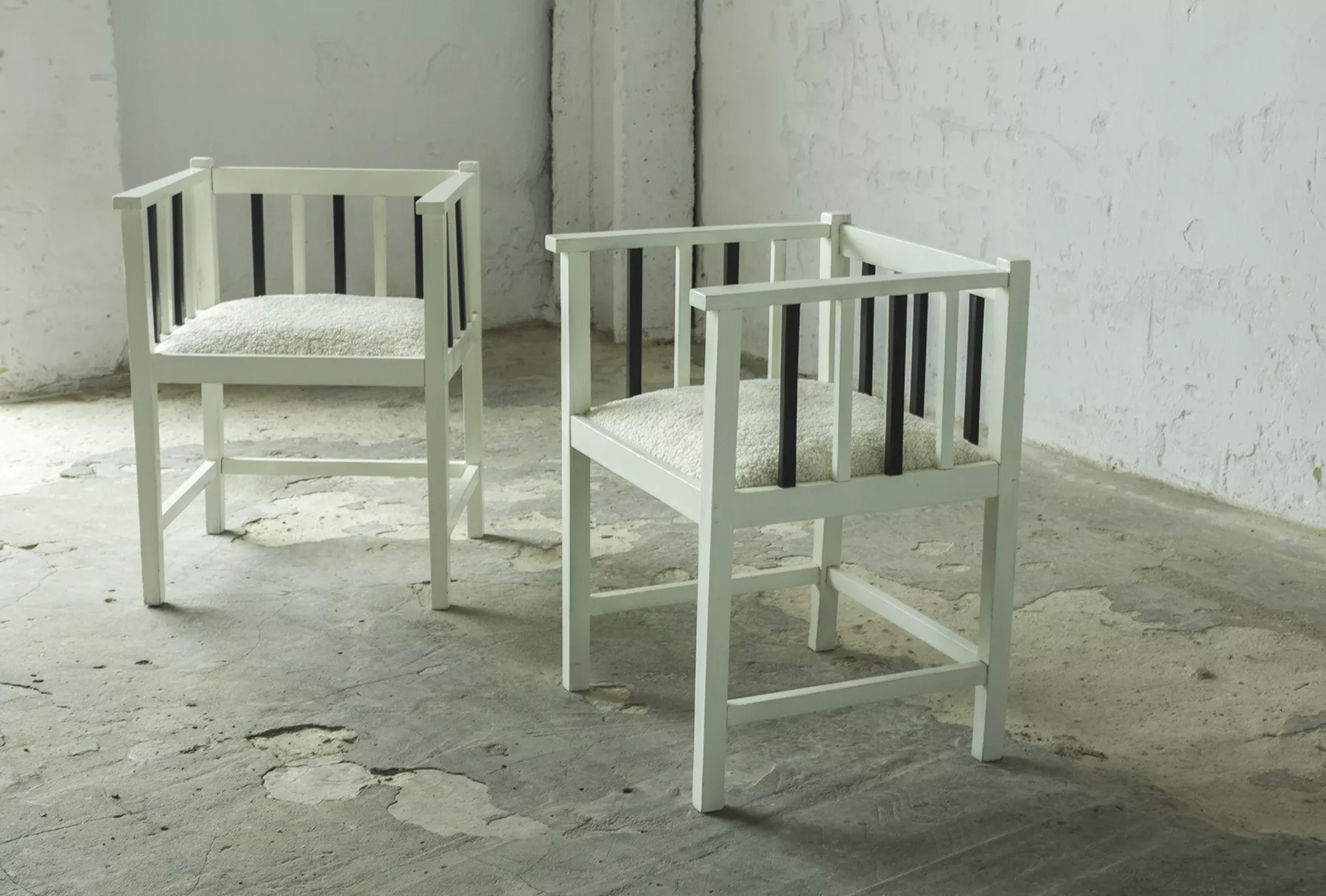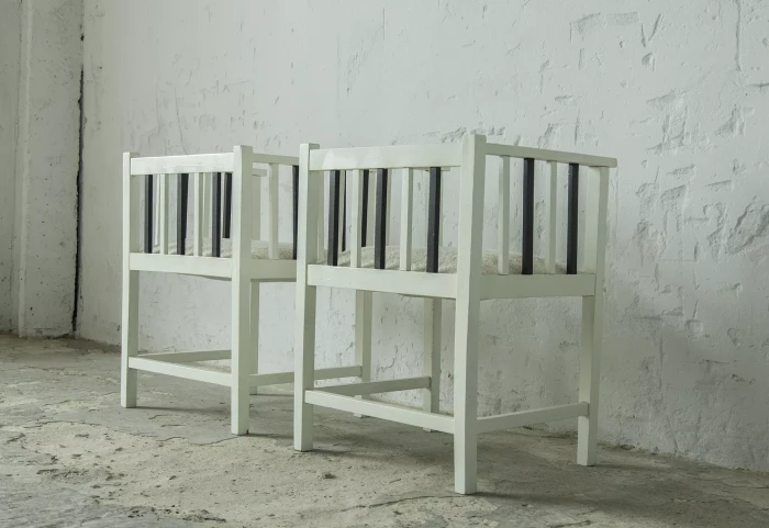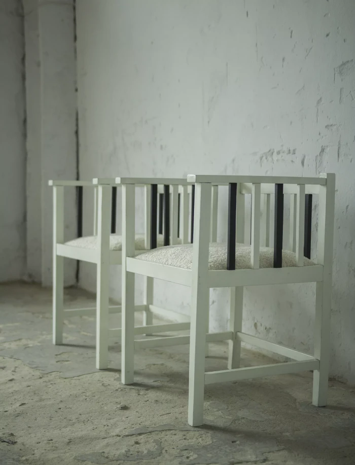 Unikatowe krzesła (fotele) o geometrycznych czystych liniach. Pochodzą z początku XX wieku i najprawdopodobniej zostały wyprodukowane w Europie środkowej około 1905 - 1920 r. Jest to solidna drewniana konstrukcja, charakteryzująca się pionowymi szczebelkami w oparciu oraz podłokietnikach i stonowaną formą architektoniczną. Krzesła zachowane są w bardzo dobrym stanie vintage, wraz z biało-czarnym malowaniem, na którym widać delikatne ślady zużycia i patyny, oraz kolejne warstwy farby. Siedziska posiadają jeszcze oryginalny system sprężyn i są wyciągane. Została wymieniona tylko tapicerka na nową. Całość jest stabilna i gotowa do użytkowania.
