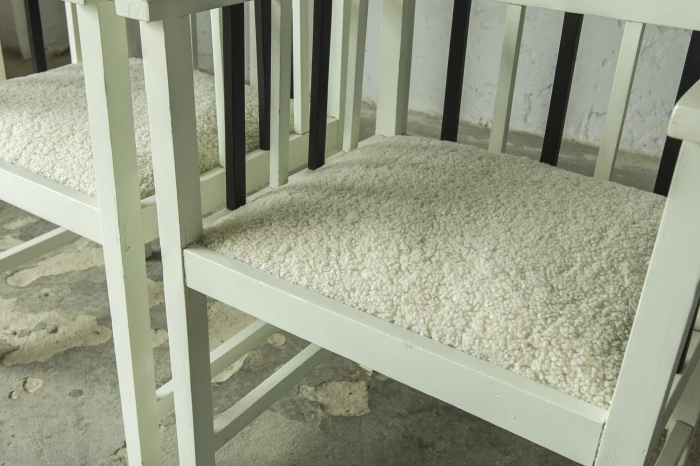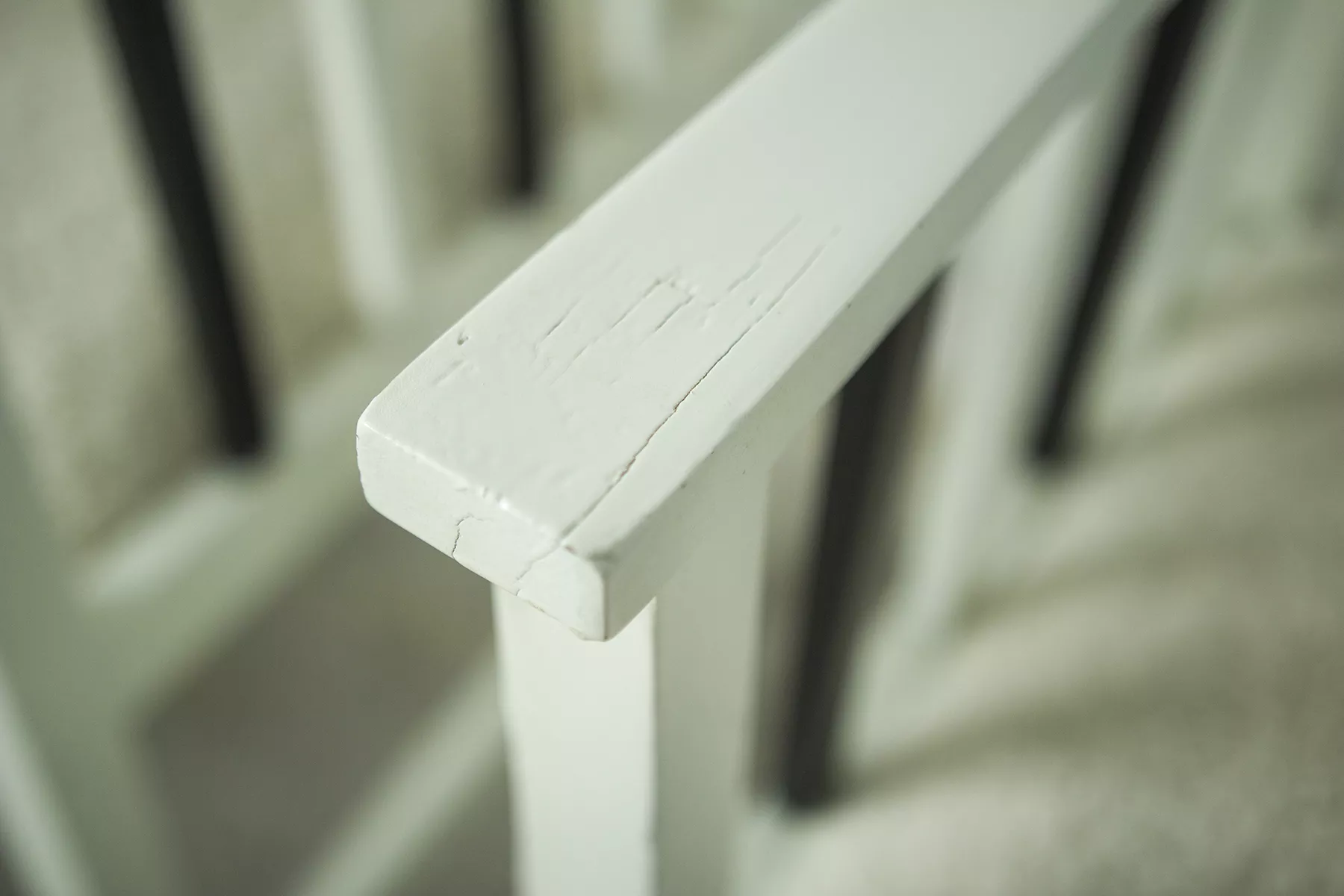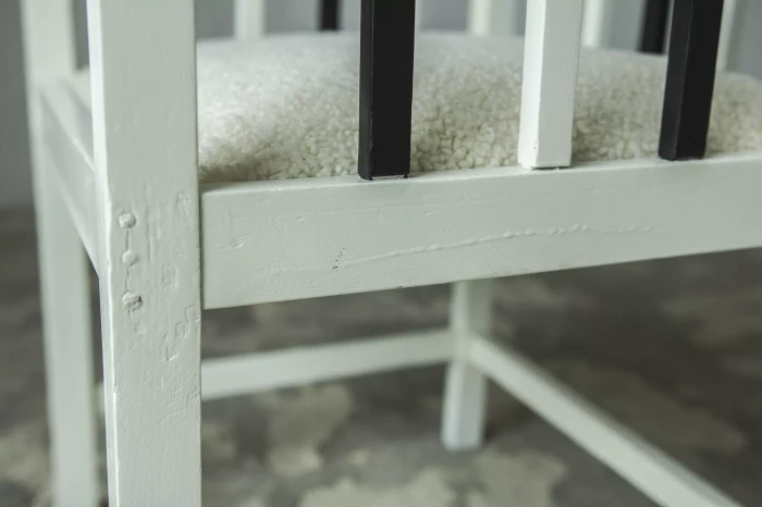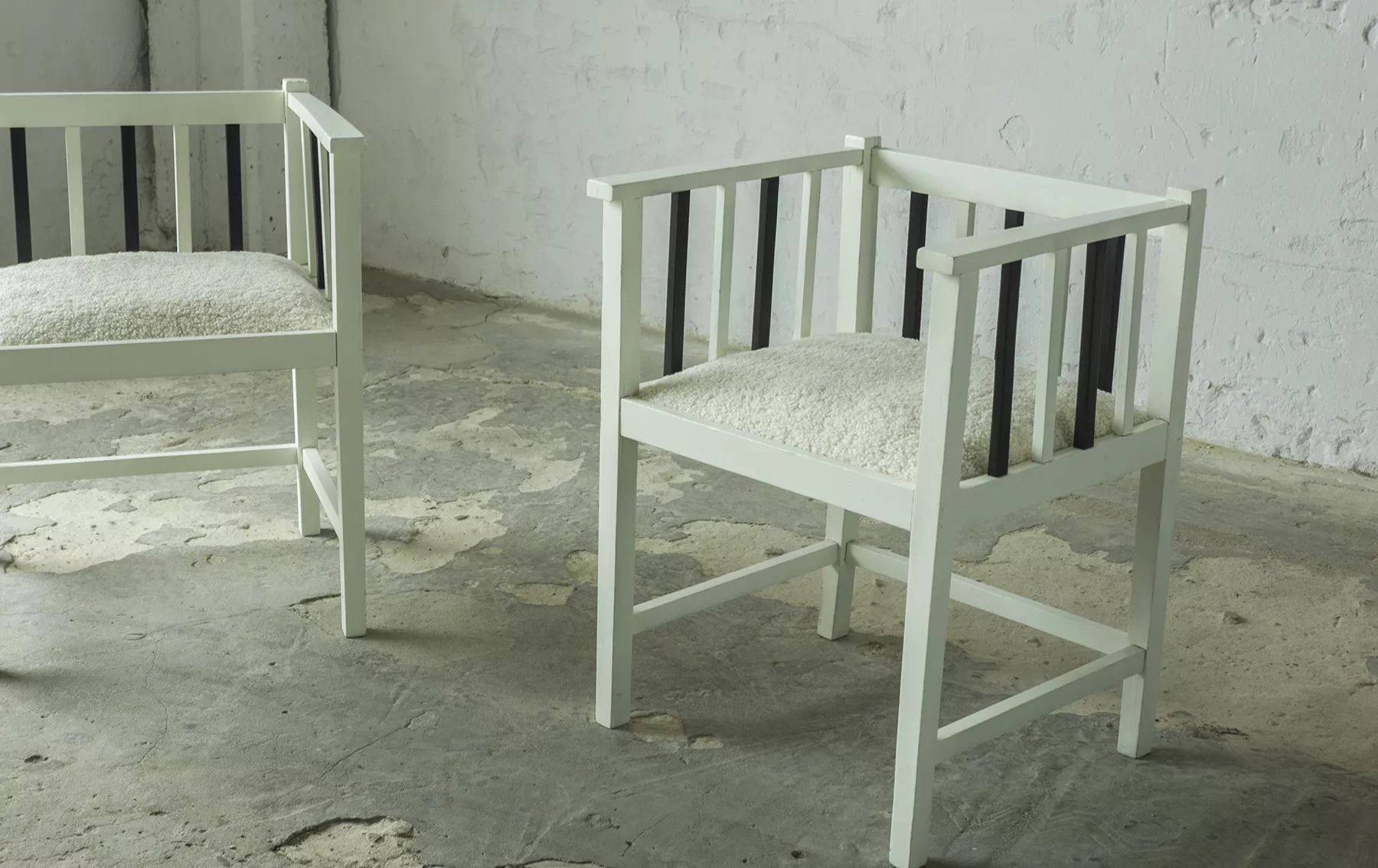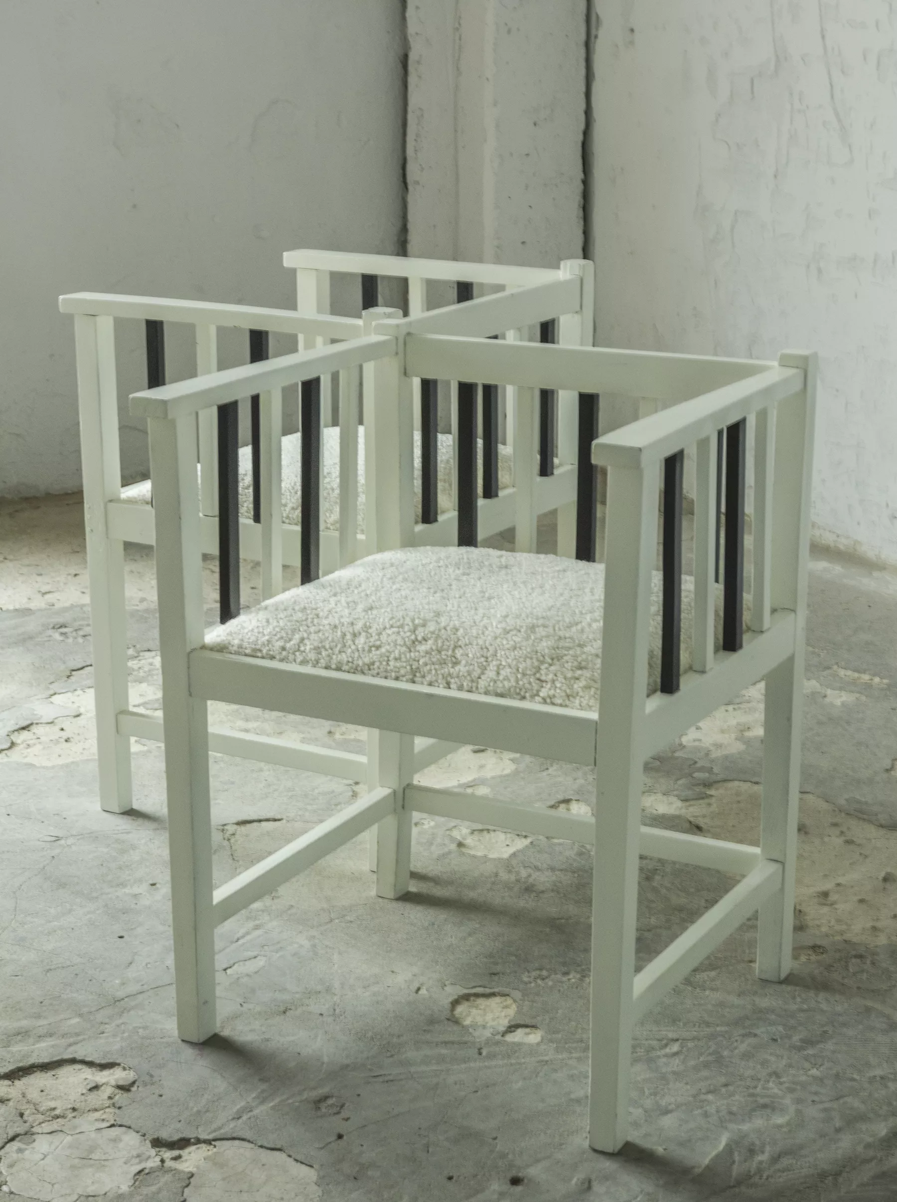 Unikatowe krzesła (fotele) o geometrycznych czystych liniach. Pochodzą z początku XX wieku i najprawdopodobniej zostały wyprodukowane w Europie środkowej około 1905 - 1920 r. Jest to solidna drewniana konstrukcja, charakteryzująca się pionowymi szczebelkami w oparciu oraz podłokietnikach i stonowaną formą architektoniczną. Krzesła zachowane są w bardzo dobrym stanie vintage, wraz z biało-czarnym malowaniem, na którym widać delikatne ślady zużycia i patyny, oraz kolejne warstwy farby. Siedziska posiadają jeszcze oryginalny system sprężyn i są wyciągane. Została wymieniona tylko tapicerka na nową. Całość jest stabilna i gotowa do użytkowania.