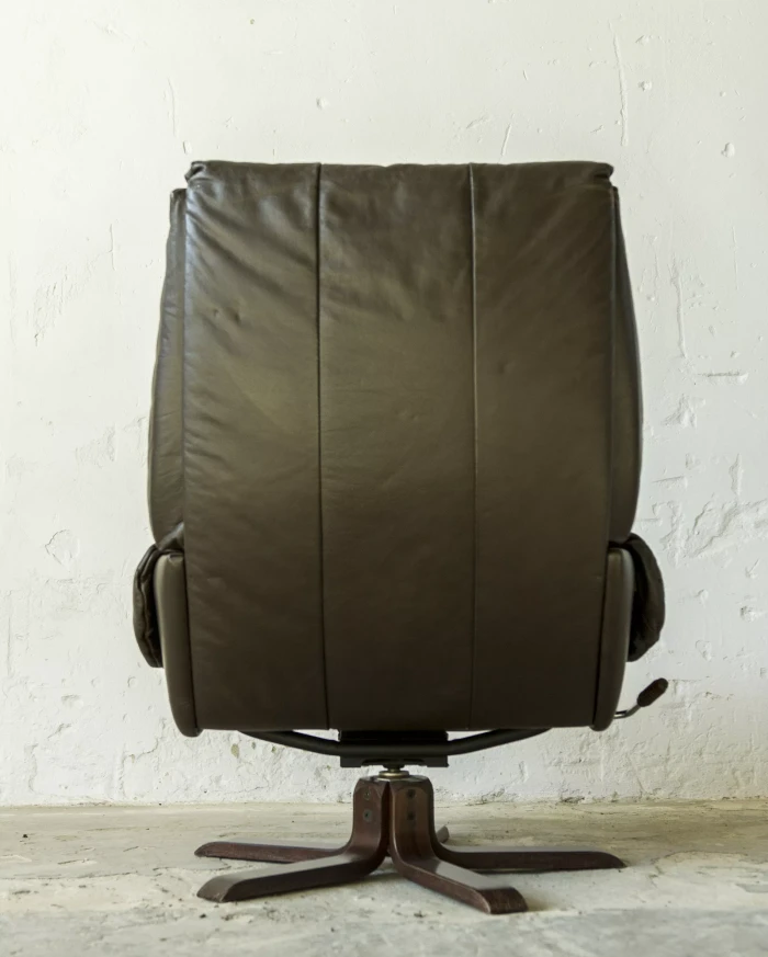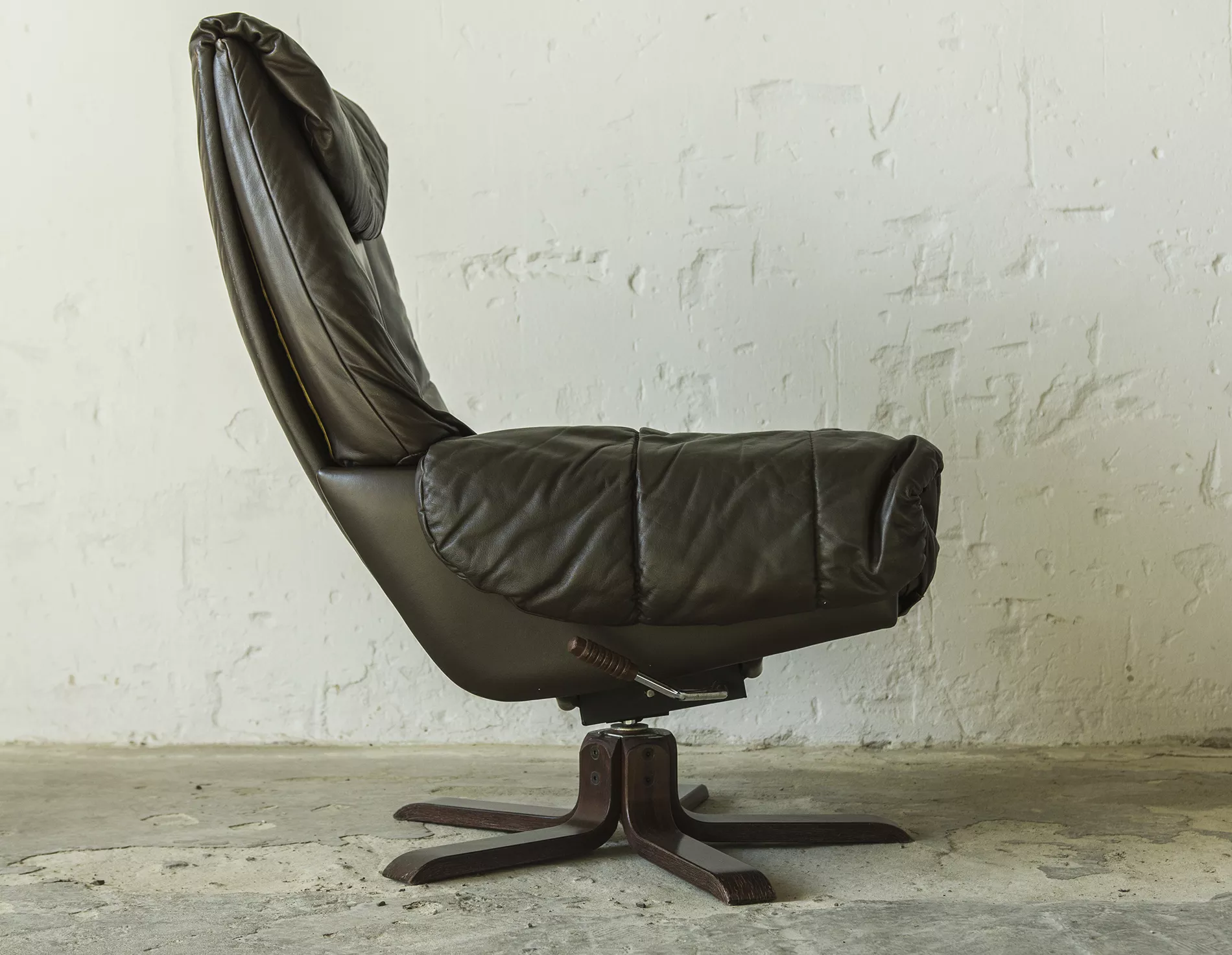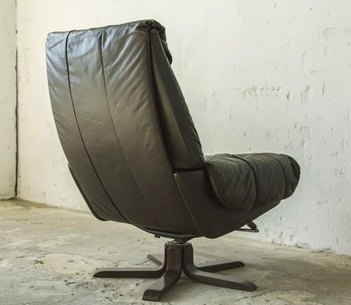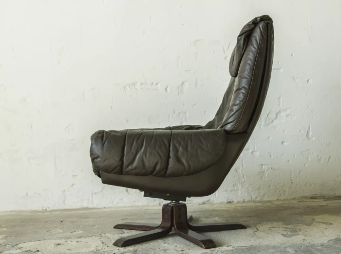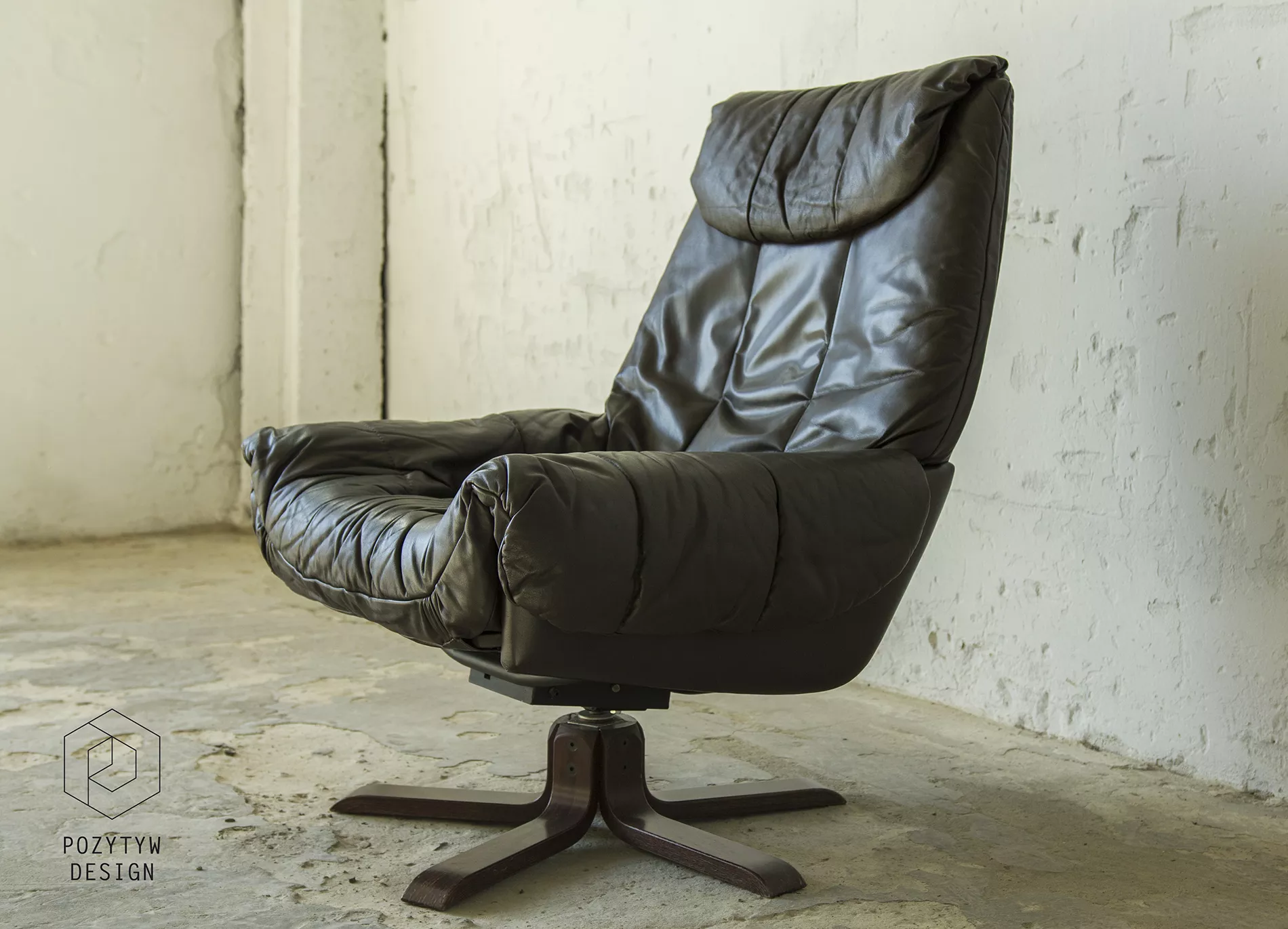 Duński obrotowy fotel wypoczynkowy z lat 70-tych, projektu HW Klein. Tapicerowany jest naturalną skórą w kolorze brązowym, która przez te wszystkie lata nabrała przepięknej patyny. Fotel wyróżnia się ergonomicznym designem, siedzisko jest głębokie i nisko osadzone co w połączeniu z miękką skórą daje uczucie komfortu i wygody na wysokim poziomie. Konstrukcja to drewniana rama, osadzona na metalowej obrotowej podstawie, która posiada regulację odchylania do tyłu z blokadą pozycji.