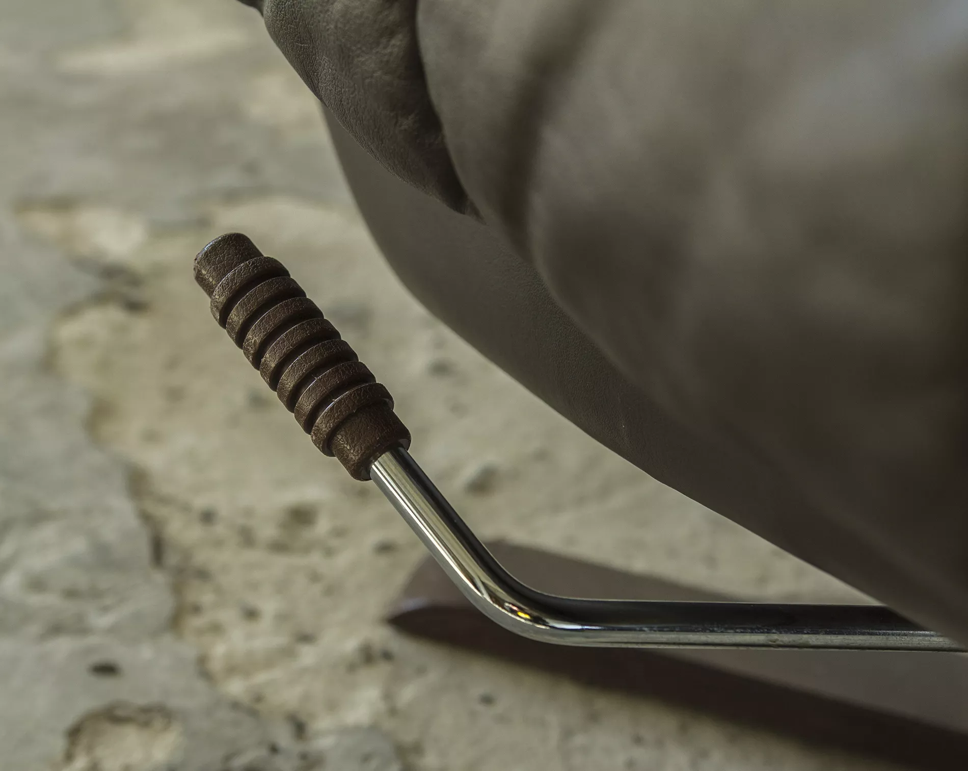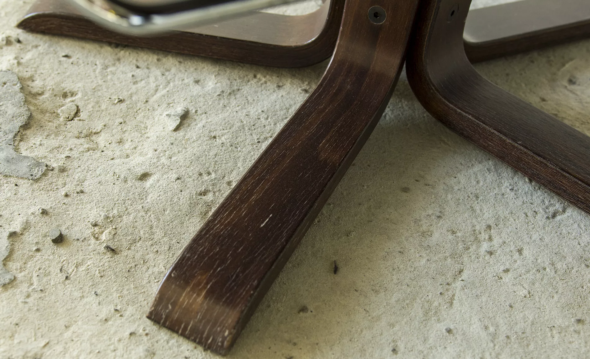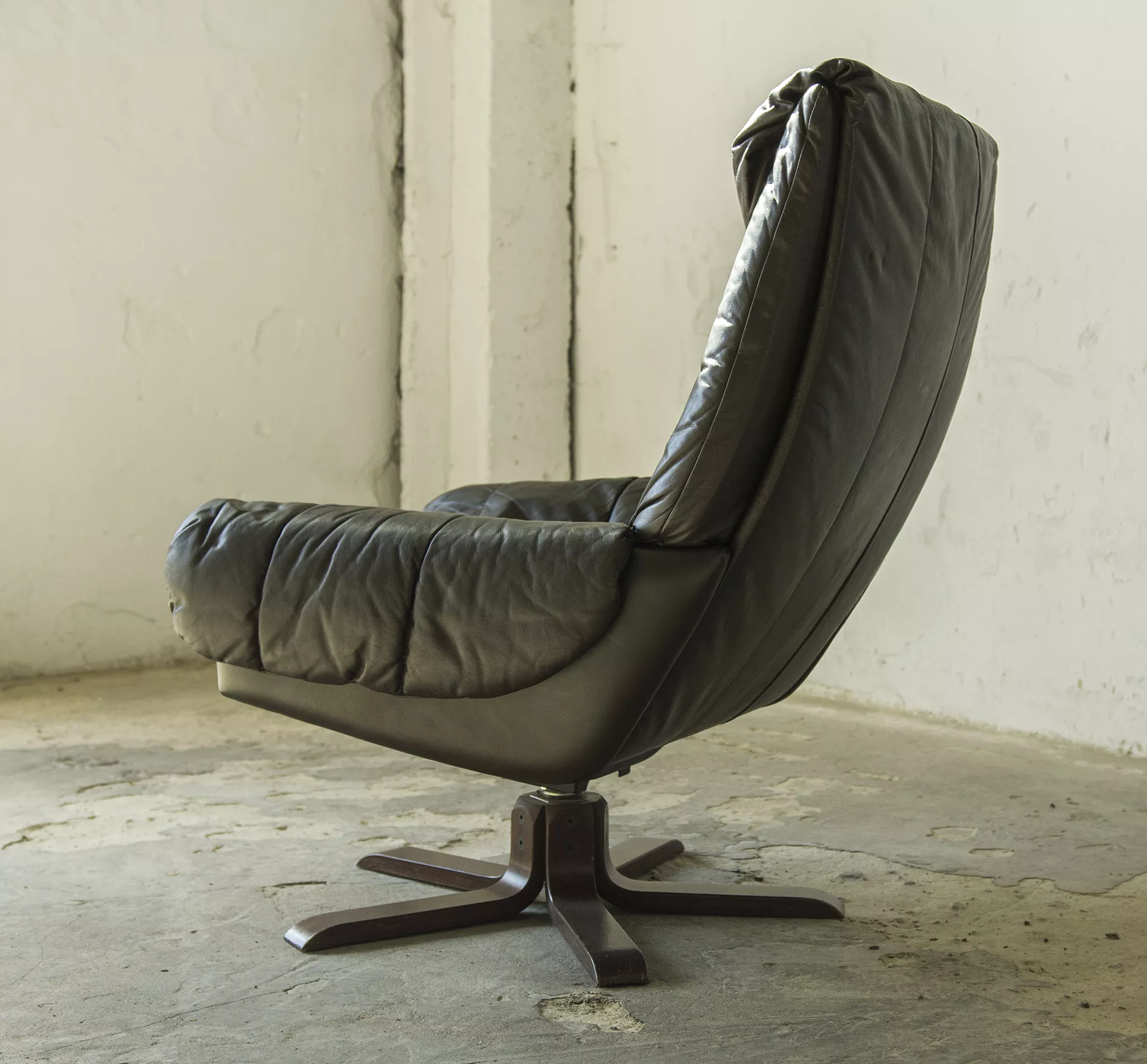 Duński obrotowy fotel wypoczynkowy z lat 70-tych, projektu HW Klein. Tapicerowany jest naturalną skórą w kolorze brązowym, która przez te wszystkie lata nabrała przepięknej patyny. Fotel wyróżnia się ergonomicznym designem, siedzisko jest głębokie i nisko osadzone co w połączeniu z miękką skórą daje uczucie komfortu i wygody na wysokim poziomie. Konstrukcja to drewniana rama, osadzona na metalowej obrotowej podstawie, która posiada regulację odchylania do tyłu z blokadą pozycji.