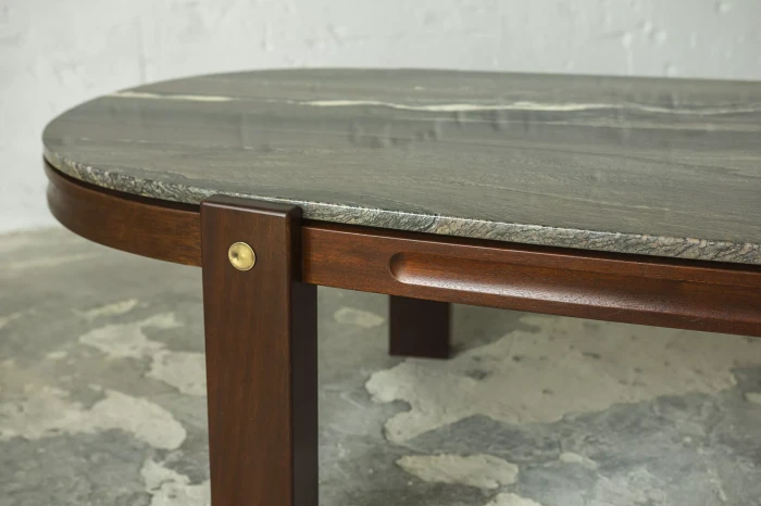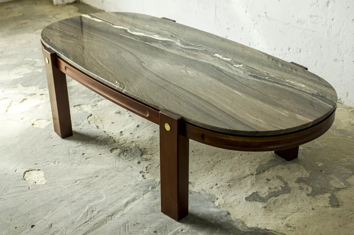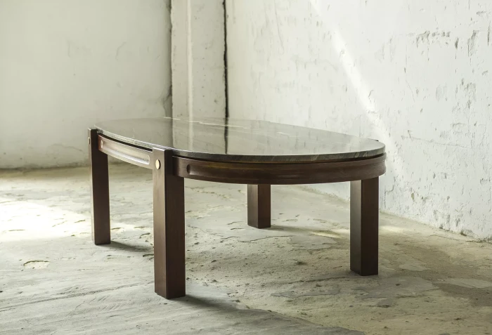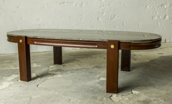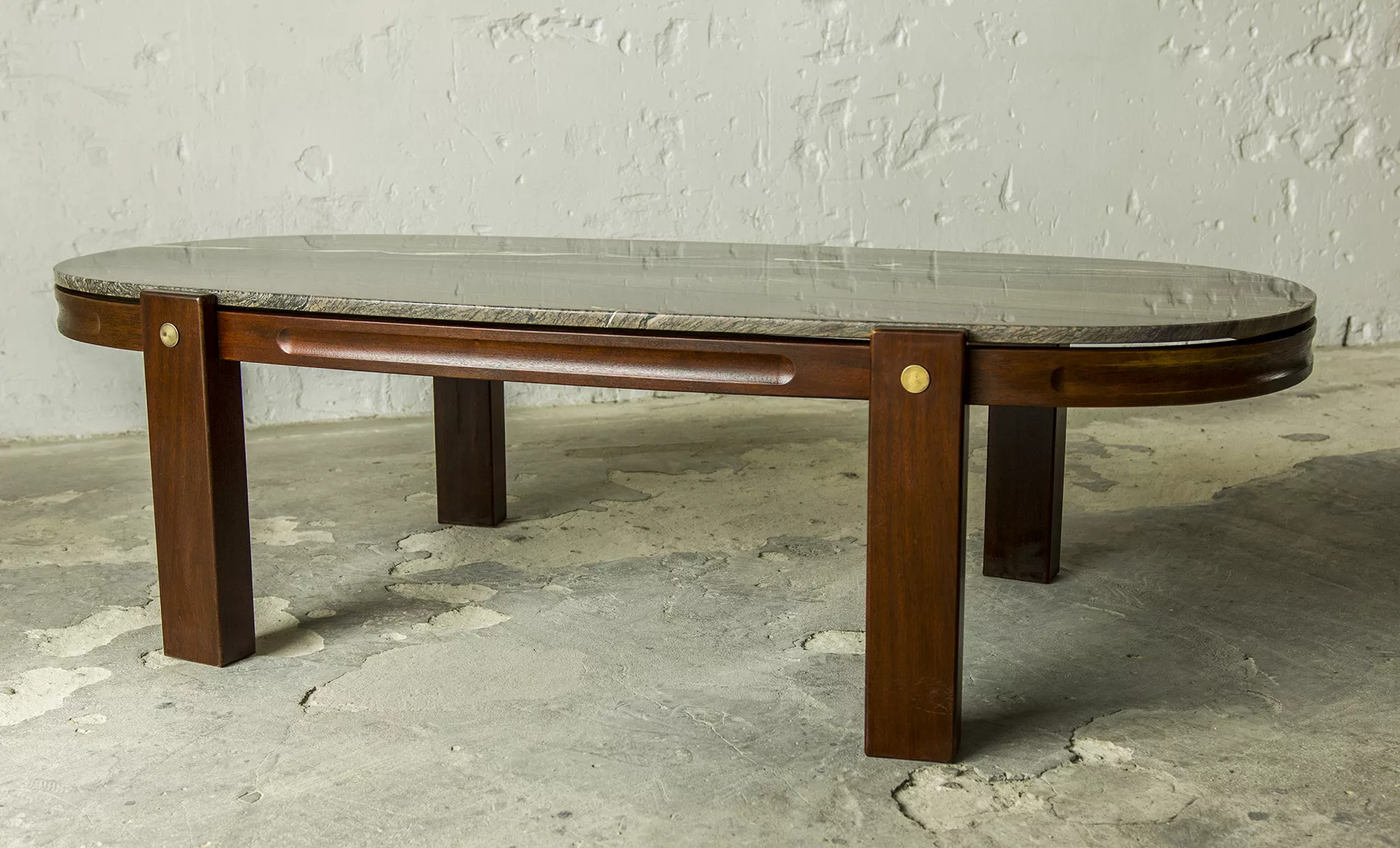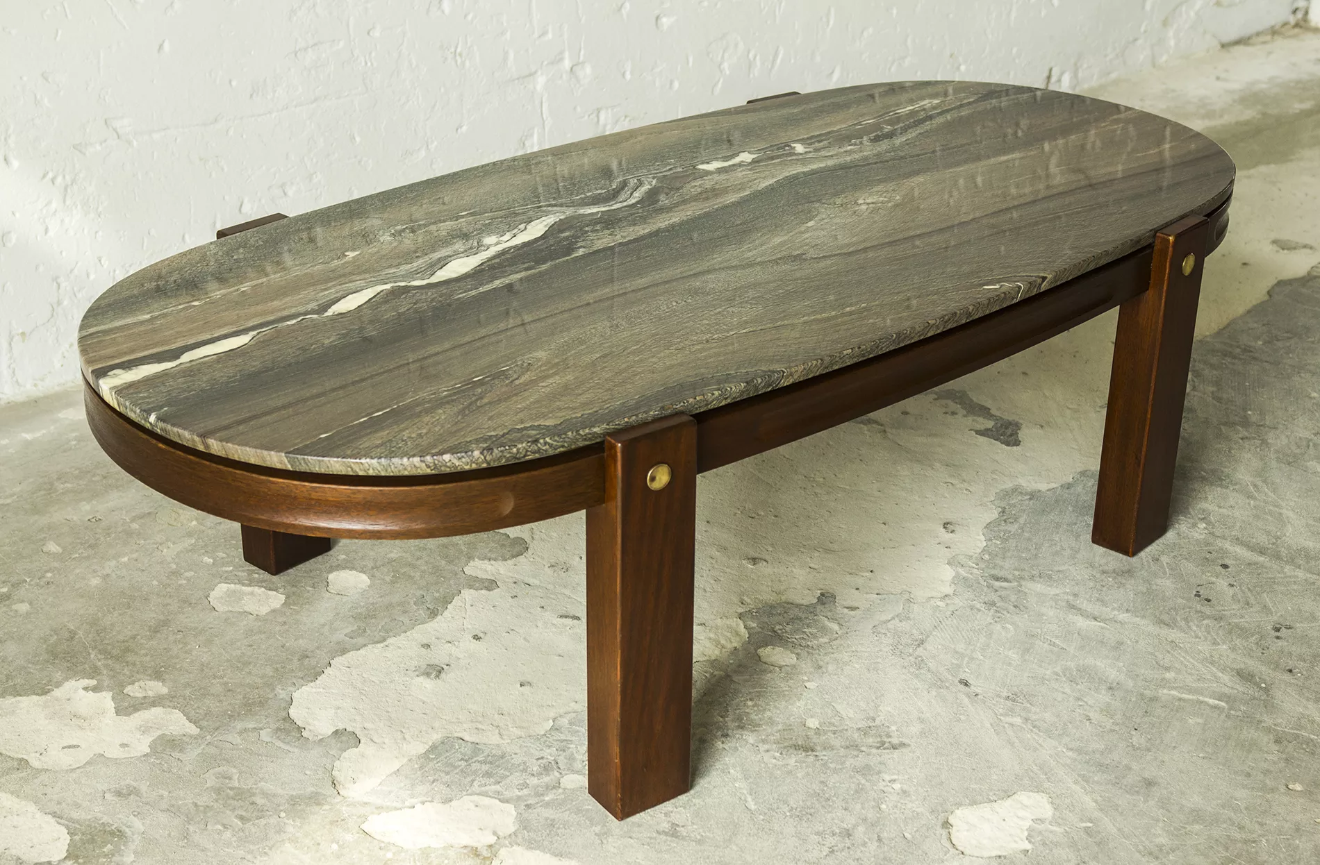 Marmurowy stolik kawowy z lat 70. Blat wykonany został z wysokiej jakości naturalnego marmuru, podstawa to masywne lite drewno tekowe. Jest to klasyczny projekt o minimalistycznej formie, co sprawia że całość prezentuje się bardzo elegancko. Stolik zachowany jest w oryginalnym i bardzo dobrym stanie.