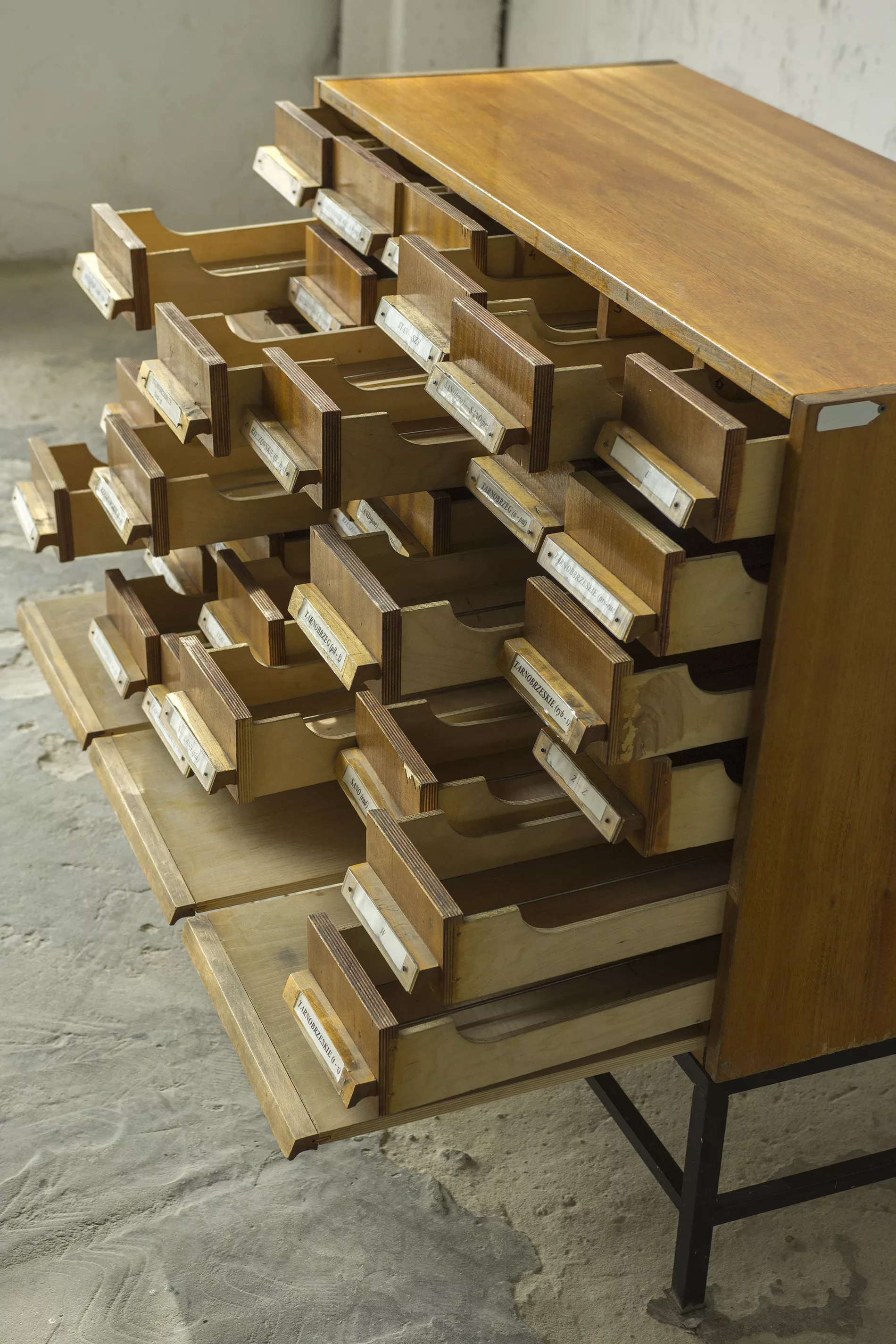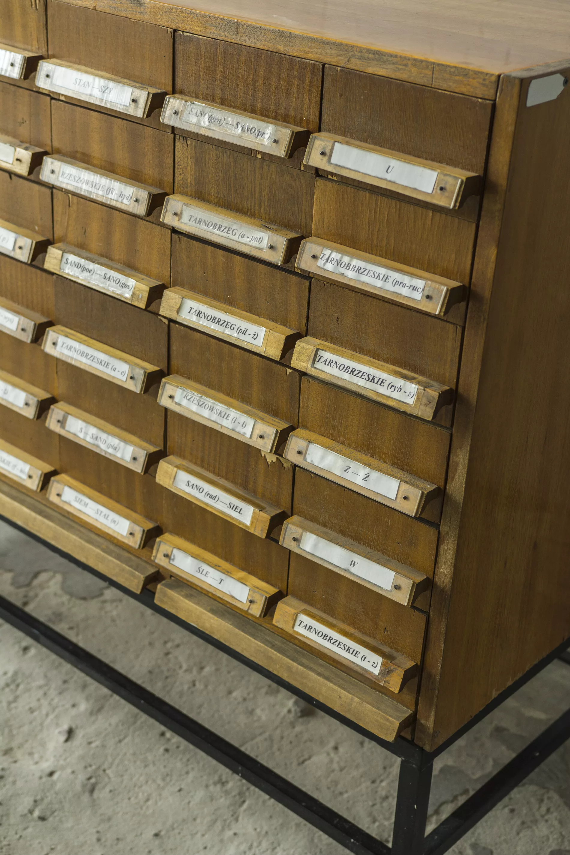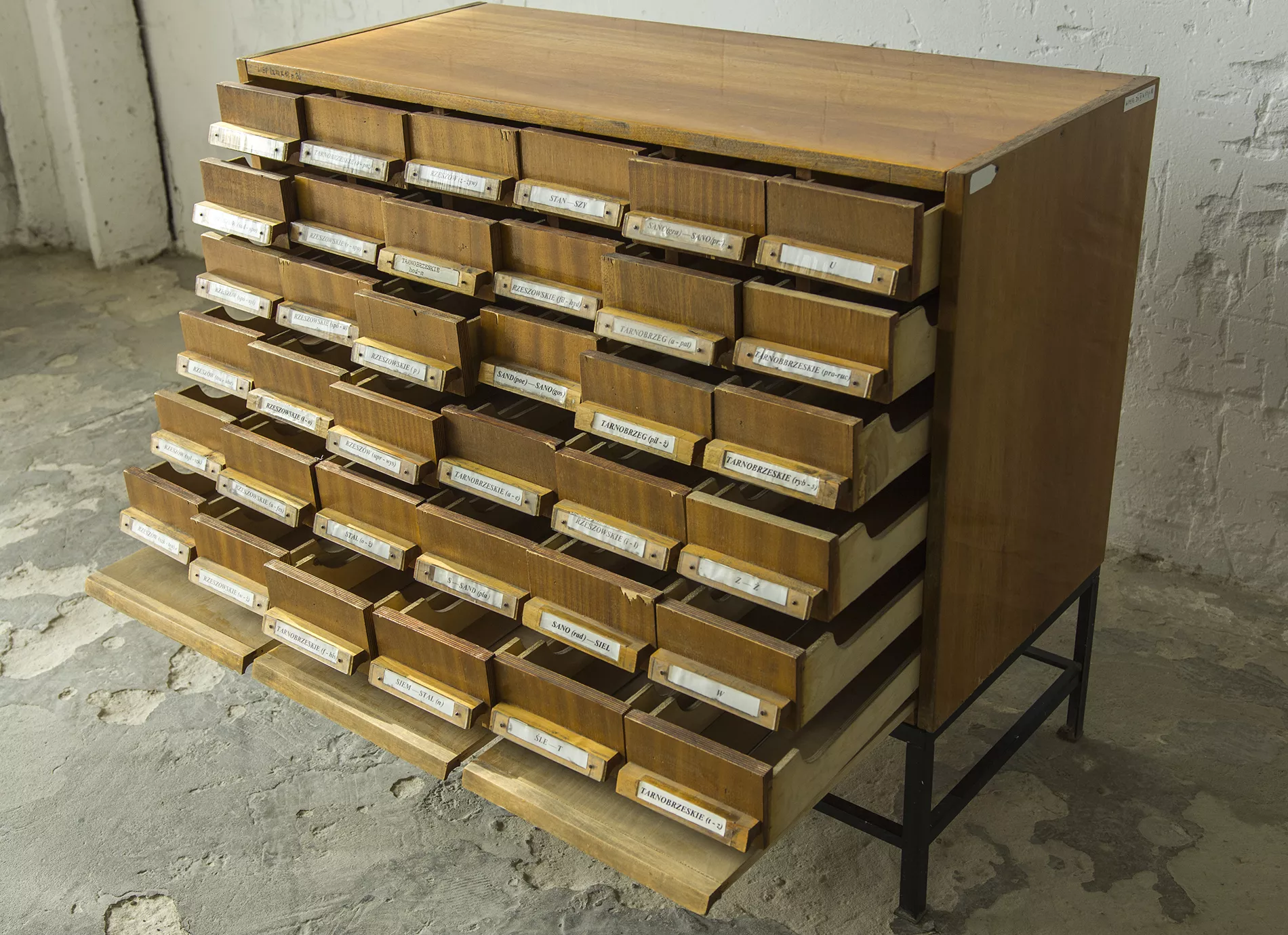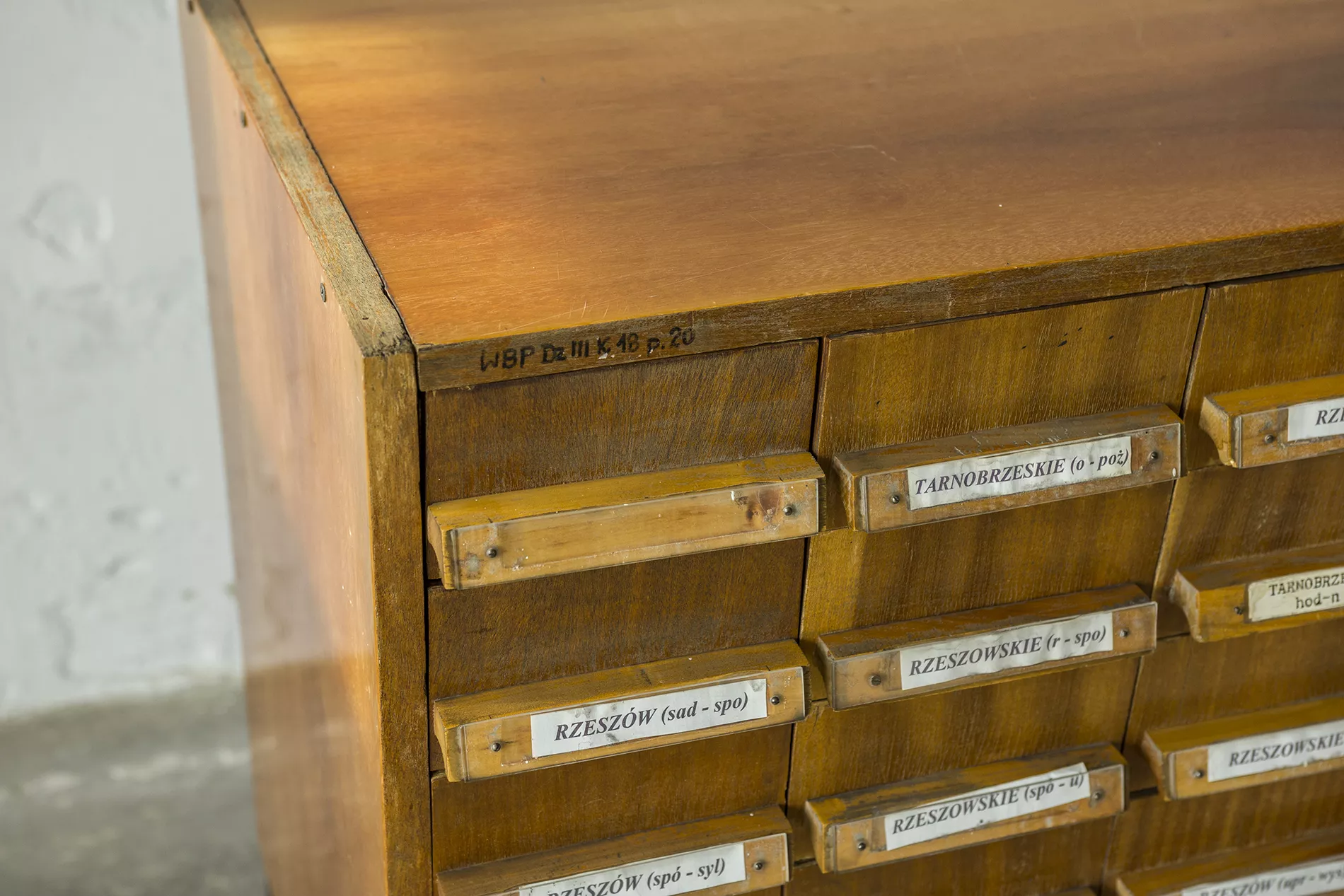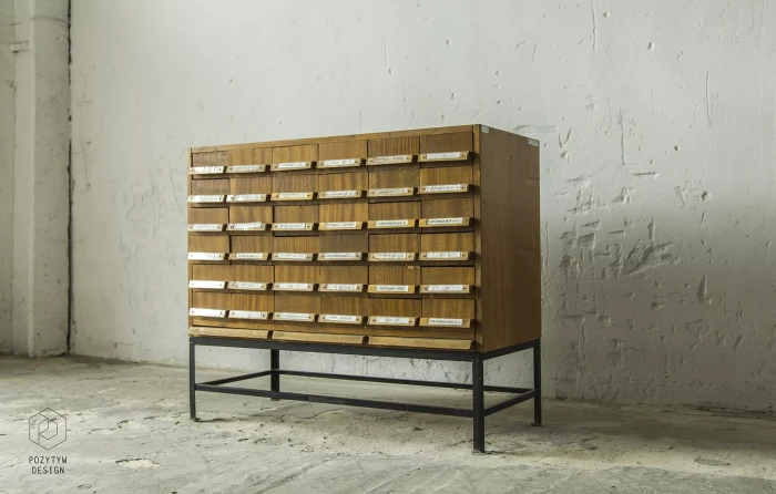 Industrialna szafka katalogowa, klasyczny mebel biurowy rodem z PRL-u. Posiada dużo szufladek na różnego rodzaju drobiazgi, całość wsparta jest na metalowej masywnej podstawie. Zachowana jest w oryginalnym stanie vintage.