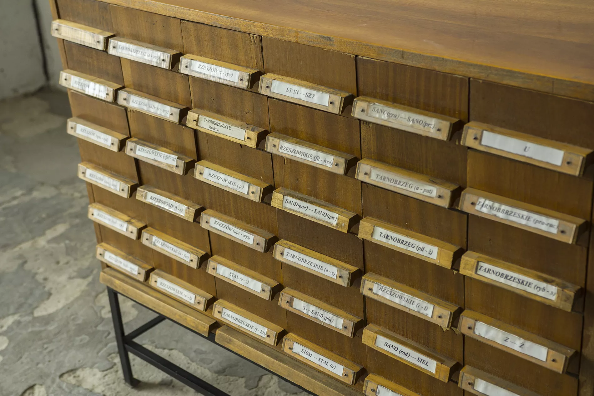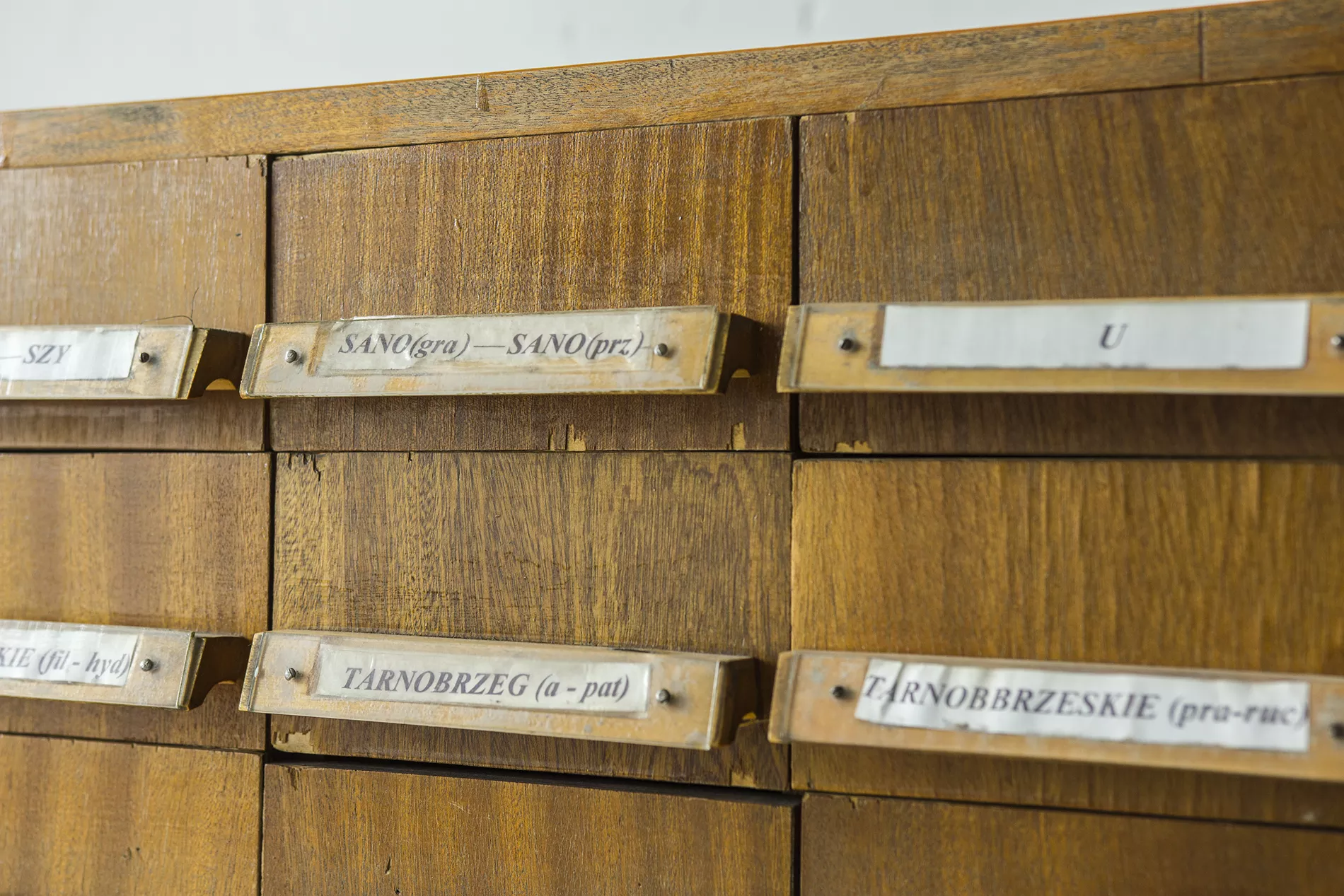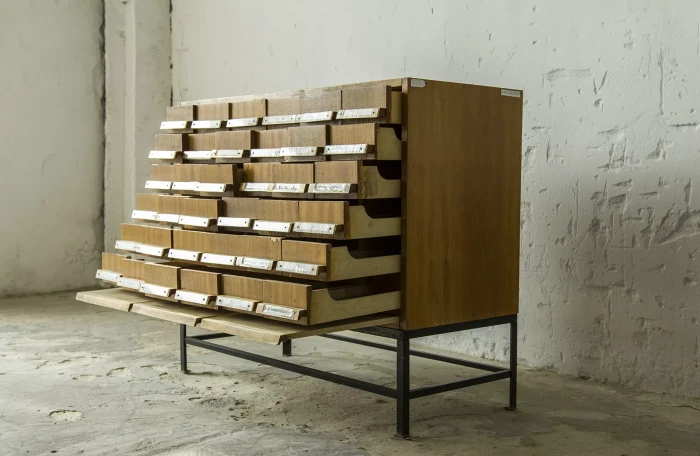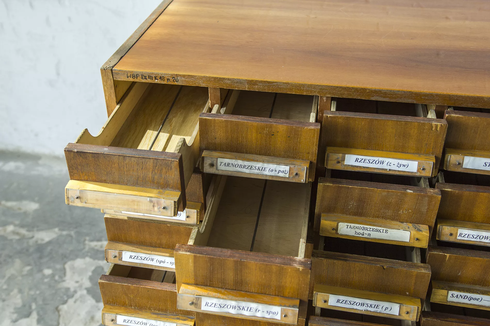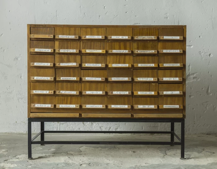 Industrialna szafka katalogowa, klasyczny mebel biurowy rodem z PRL-u. Posiada dużo szufladek na różnego rodzaju drobiazgi, całość wsparta jest na metalowej masywnej podstawie. Zachowana jest w oryginalnym stanie vintage.