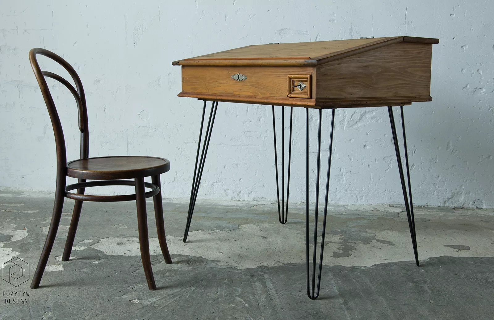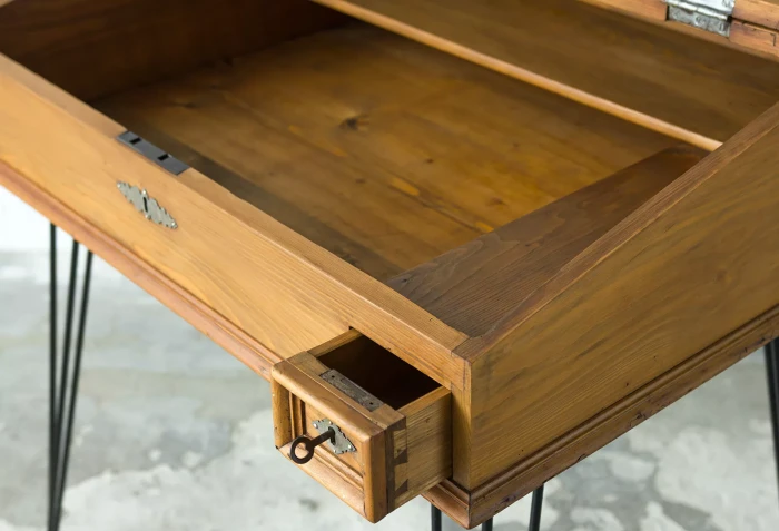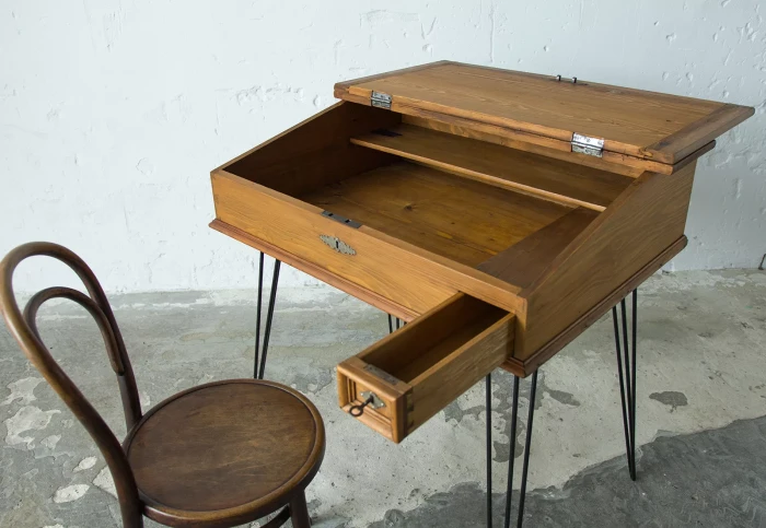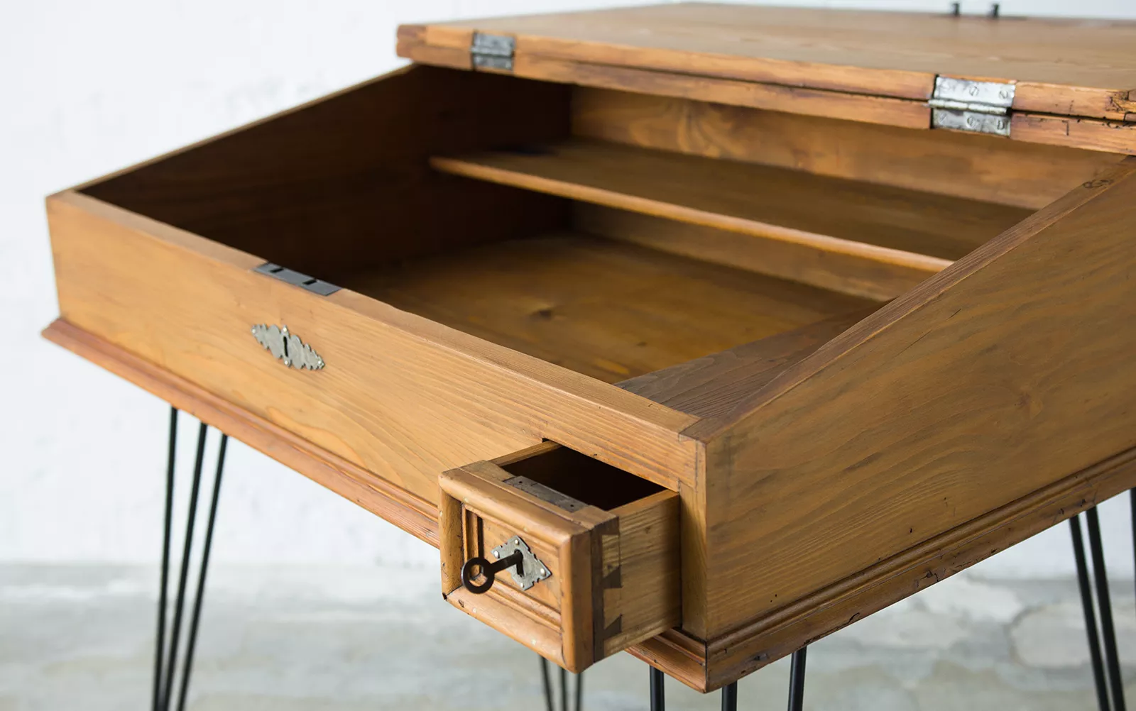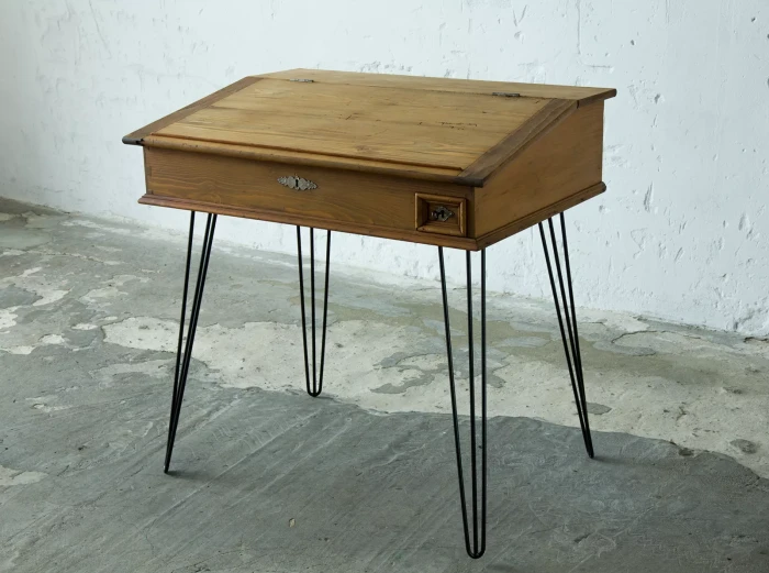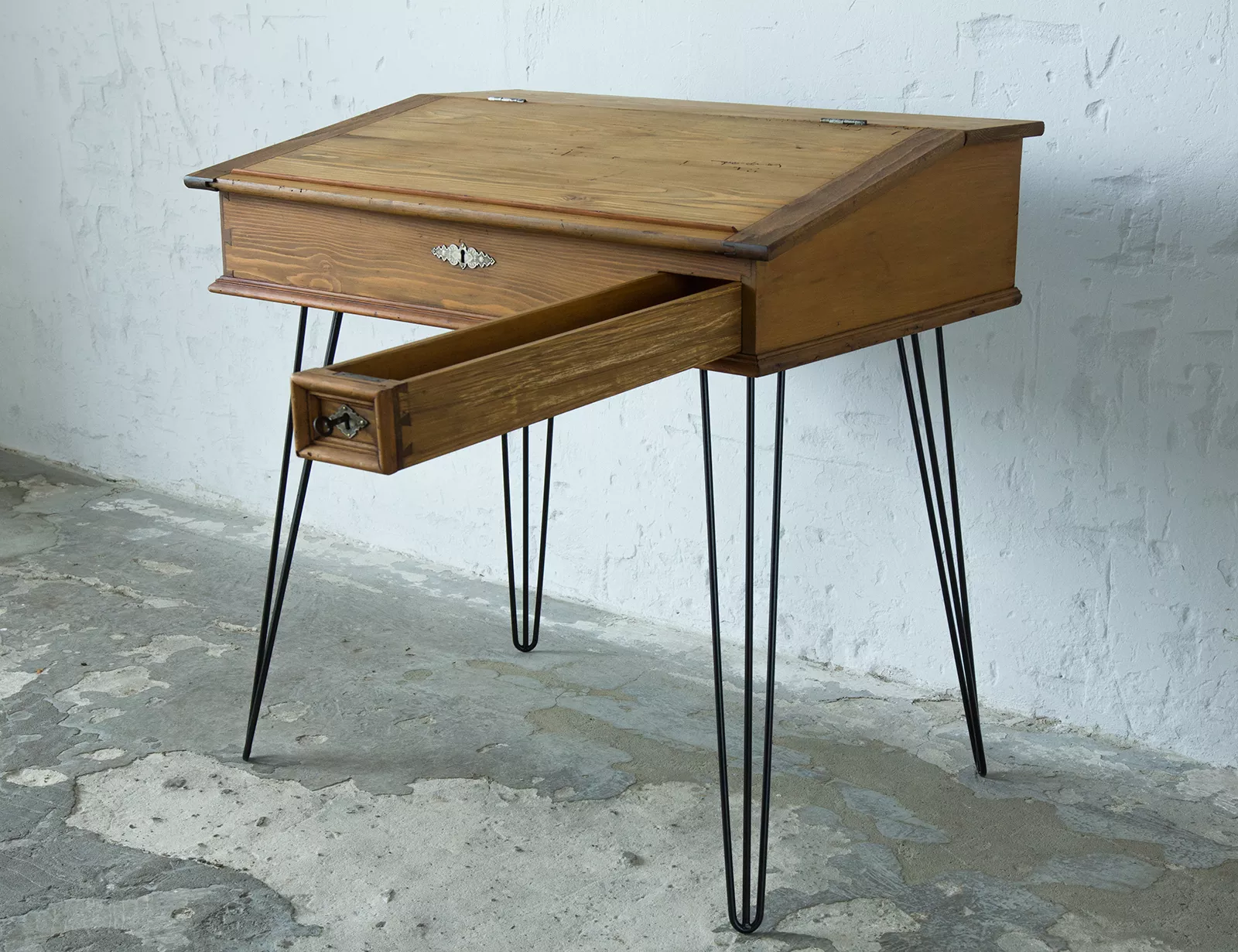 Rzadko spotykane antyczne biurko do pisania, jest to model przenośny i najczęściej używane było przez urzędników, nauczycieli itd. Jest to prosta konstrukcja, funkcjonalna i ponadczasowa, która emanuje atmosferą klasycznej elegancji. Wykonane jest tradycyjnymi metodami stolarskimi z litego drewna sosnowego z otwieranym blatem, długą wysuwana szufladą i półkami w środku. Biurko jest w oryginalnym i bardzo dobrym stanie, bez zawilgocenia i nieprzyjemnych zapachów, drewno zabezpieczone woskiem. Zamki są sprawne, w zestawie jeden pasujący kluczyk do szuflady. Mebel nie wymaga renowacji. Z nieoryginalnych rzeczy to zostały dołożone tylko metalowe nogi, które zwiększyły funkcjonalność i nadały lekkości, można je szybko zdemontować i przywrócić jego pierwotny stan.