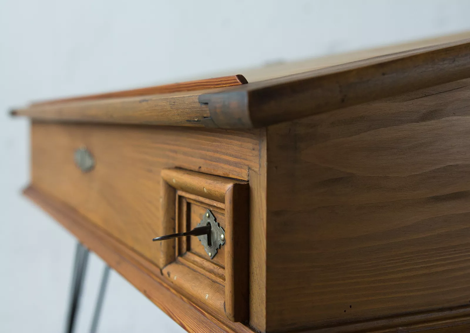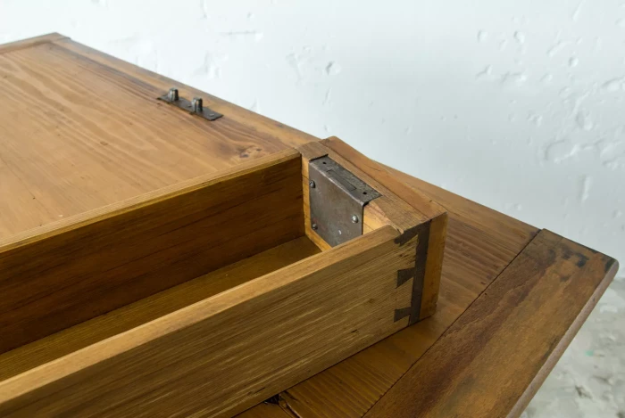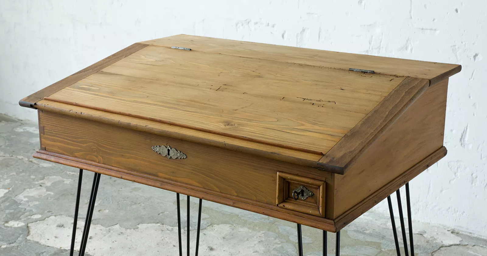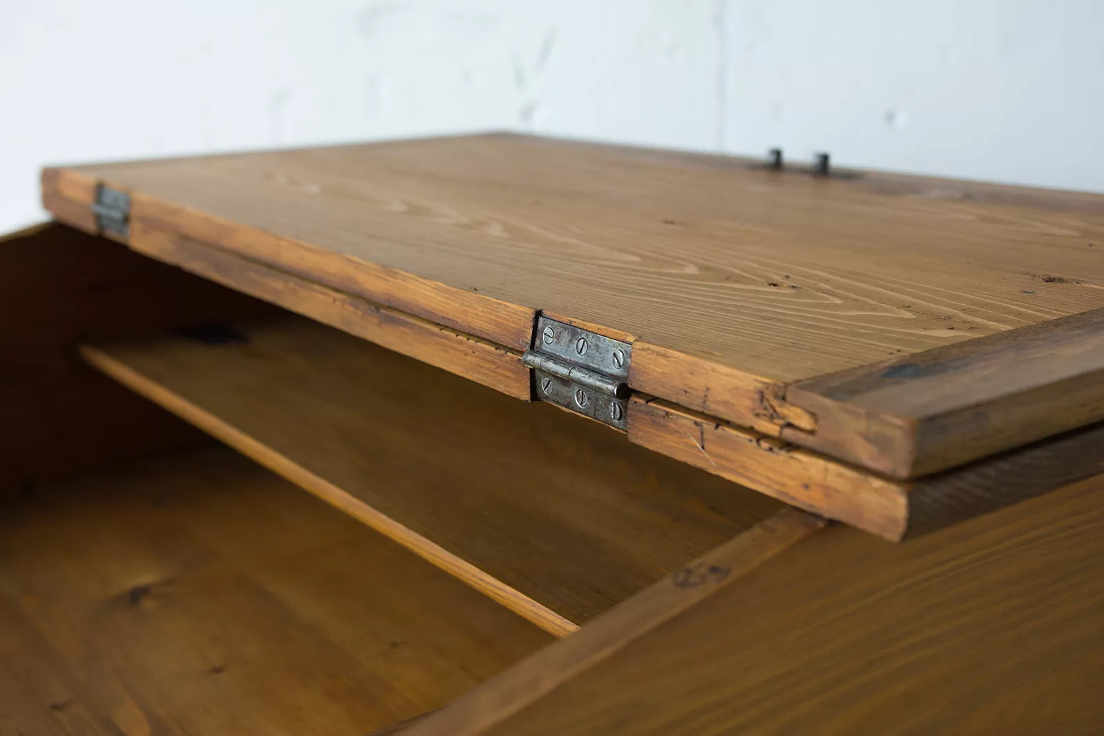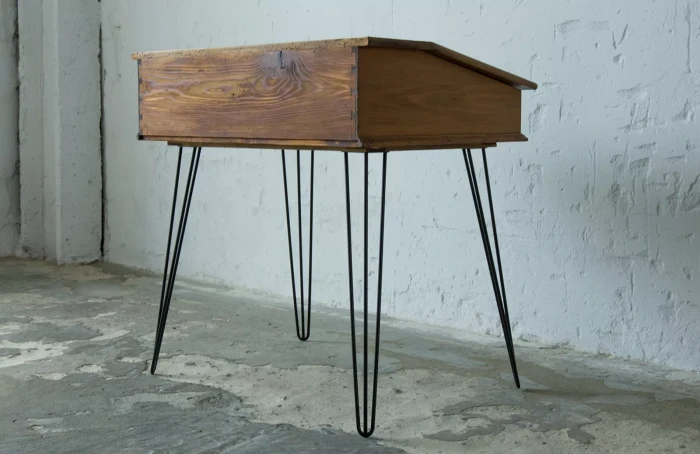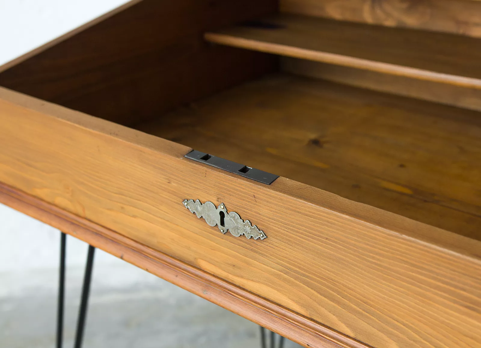 Rzadko spotykane antyczne biurko do pisania, jest to model przenośny i najczęściej używane było przez urzędników, nauczycieli itd. Jest to prosta konstrukcja, funkcjonalna i ponadczasowa, która emanuje atmosferą klasycznej elegancji. Wykonane jest tradycyjnymi metodami stolarskimi z litego drewna sosnowego z otwieranym blatem, długą wysuwana szufladą i półkami w środku. Biurko jest w oryginalnym i bardzo dobrym stanie, bez zawilgocenia i nieprzyjemnych zapachów, drewno zabezpieczone woskiem. Zamki są sprawne, w zestawie jeden pasujący kluczyk do szuflady. Mebel nie wymaga renowacji. Z nieoryginalnych rzeczy to zostały dołożone tylko metalowe nogi, które zwiększyły funkcjonalność i nadały lekkości, można je szybko zdemontować i przywrócić jego pierwotny stan.