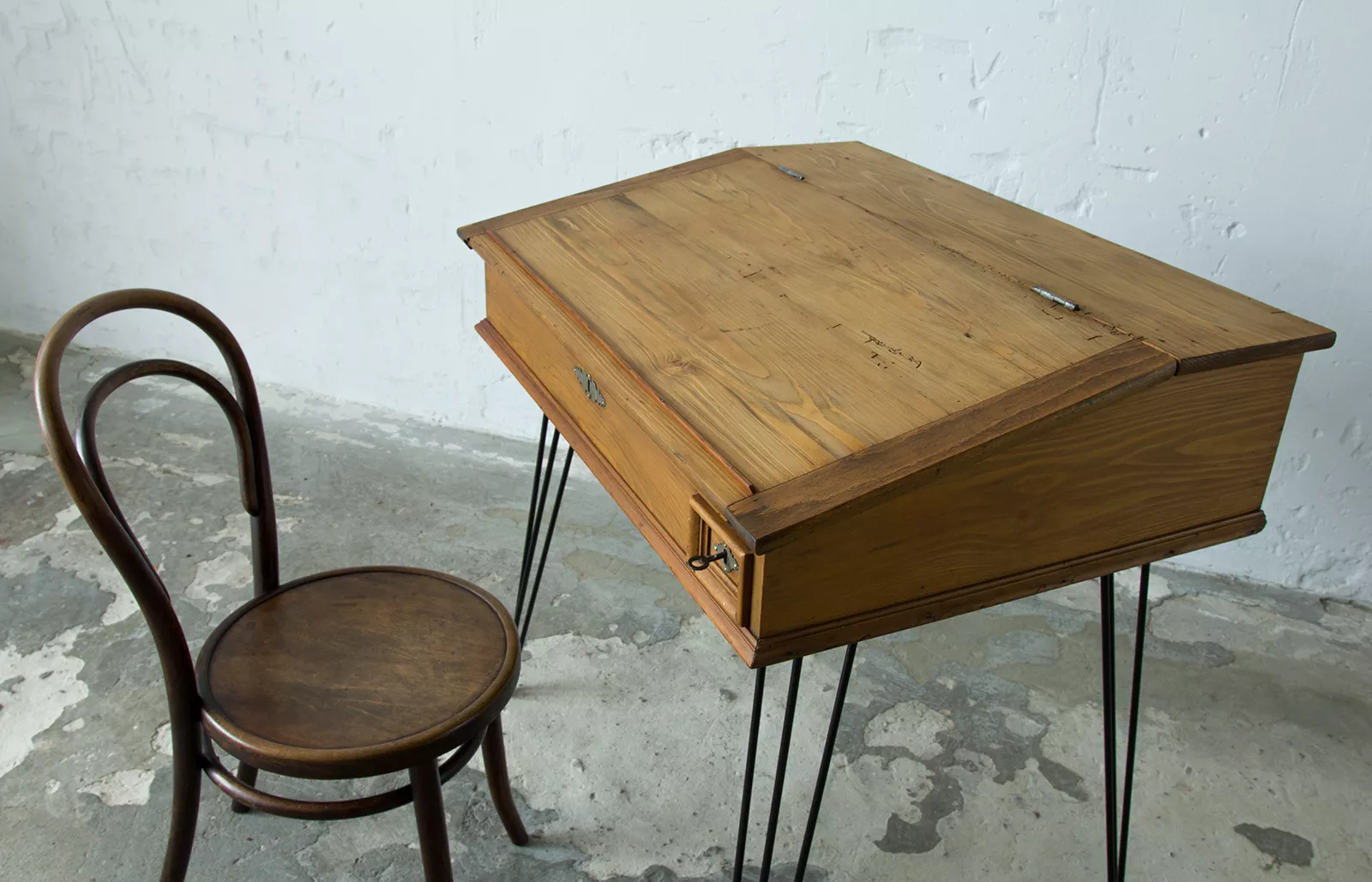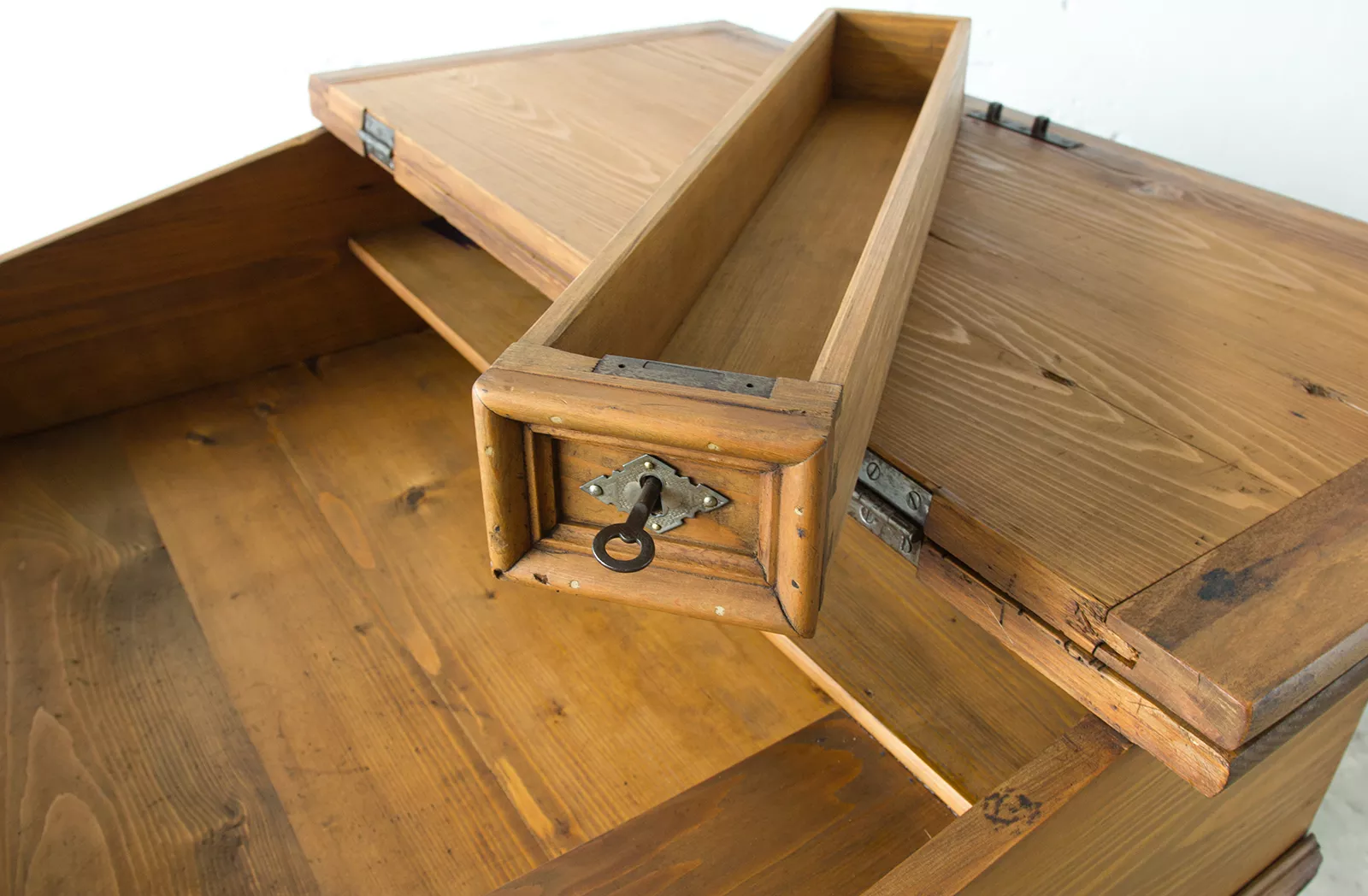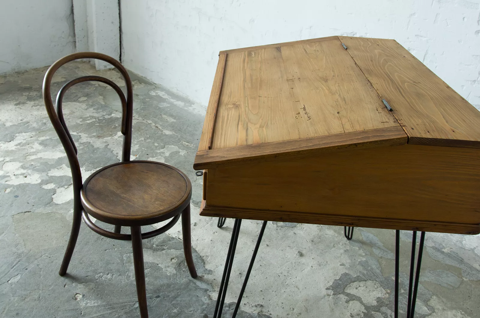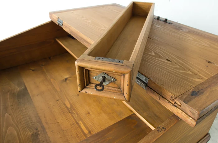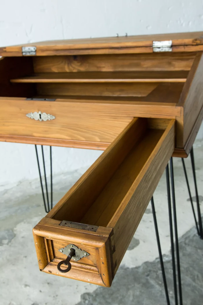 Rzadko spotykane antyczne biurko do pisania, jest to model przenośny i najczęściej używane było przez urzędników, nauczycieli itd. Jest to prosta konstrukcja, funkcjonalna i ponadczasowa, która emanuje atmosferą klasycznej elegancji. Wykonane jest tradycyjnymi metodami stolarskimi z litego drewna sosnowego z otwieranym blatem, długą wysuwana szufladą i półkami w środku. Biurko jest w oryginalnym i bardzo dobrym stanie, bez zawilgocenia i nieprzyjemnych zapachów, drewno zabezpieczone woskiem. Zamki są sprawne, w zestawie jeden pasujący kluczyk do szuflady. Mebel nie wymaga renowacji. Z nieoryginalnych rzeczy to zostały dołożone tylko metalowe nogi, które zwiększyły funkcjonalność i nadały lekkości, można je szybko zdemontować i przywrócić jego pierwotny stan.
