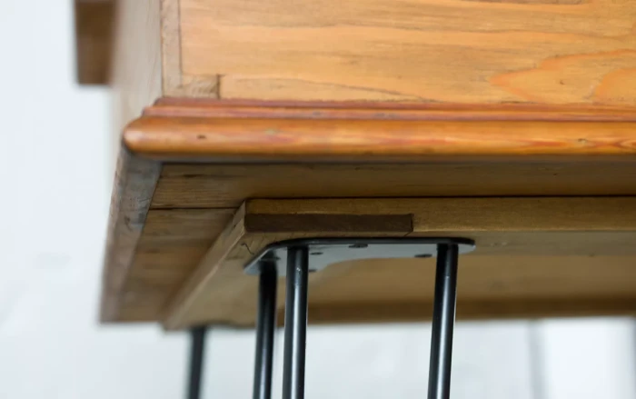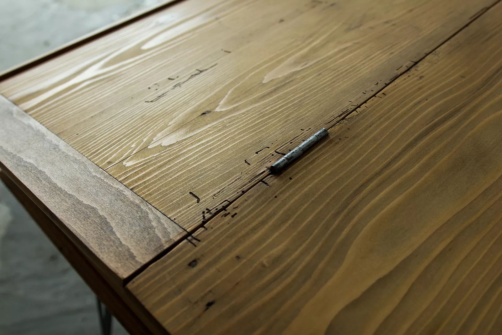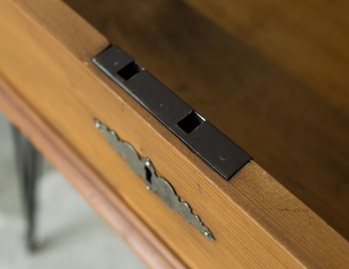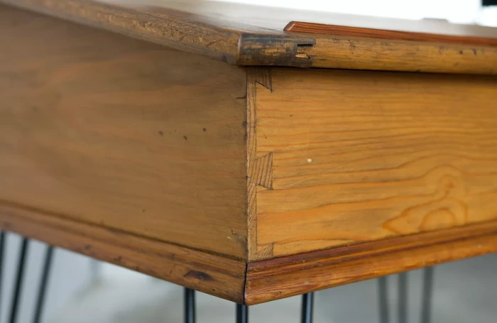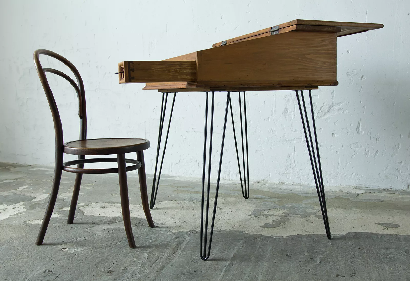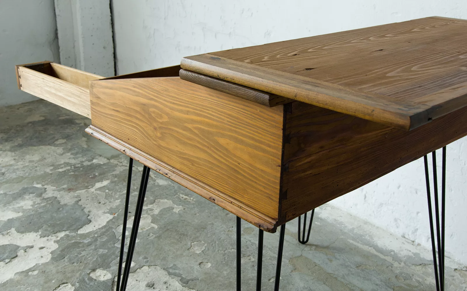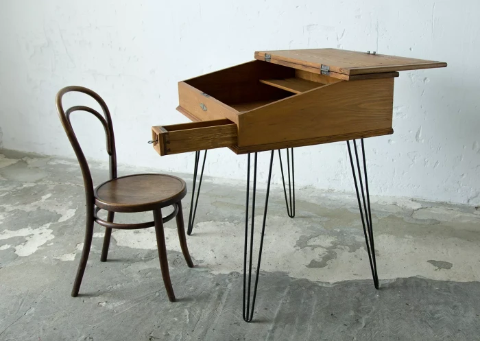 Rzadko spotykane antyczne biurko do pisania, jest to model przenośny i najczęściej używane było przez urzędników, nauczycieli itd. Jest to prosta konstrukcja, funkcjonalna i ponadczasowa, która emanuje atmosferą klasycznej elegancji. Wykonane jest tradycyjnymi metodami stolarskimi z litego drewna sosnowego z otwieranym blatem, długą wysuwana szufladą i półkami w środku. Biurko jest w oryginalnym i bardzo dobrym stanie, bez zawilgocenia i nieprzyjemnych zapachów, drewno zabezpieczone woskiem. Zamki są sprawne, w zestawie jeden pasujący kluczyk do szuflady. Mebel nie wymaga renowacji. Z nieoryginalnych rzeczy to zostały dołożone tylko metalowe nogi, które zwiększyły funkcjonalność i nadały lekkości, można je szybko zdemontować i przywrócić jego pierwotny stan.