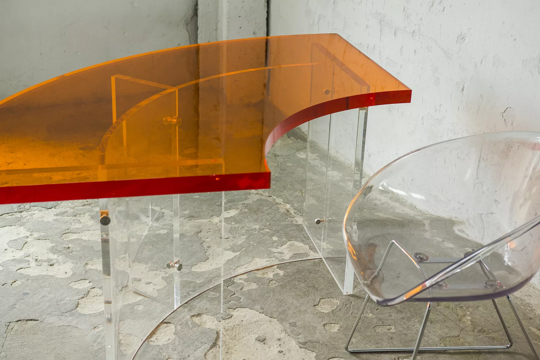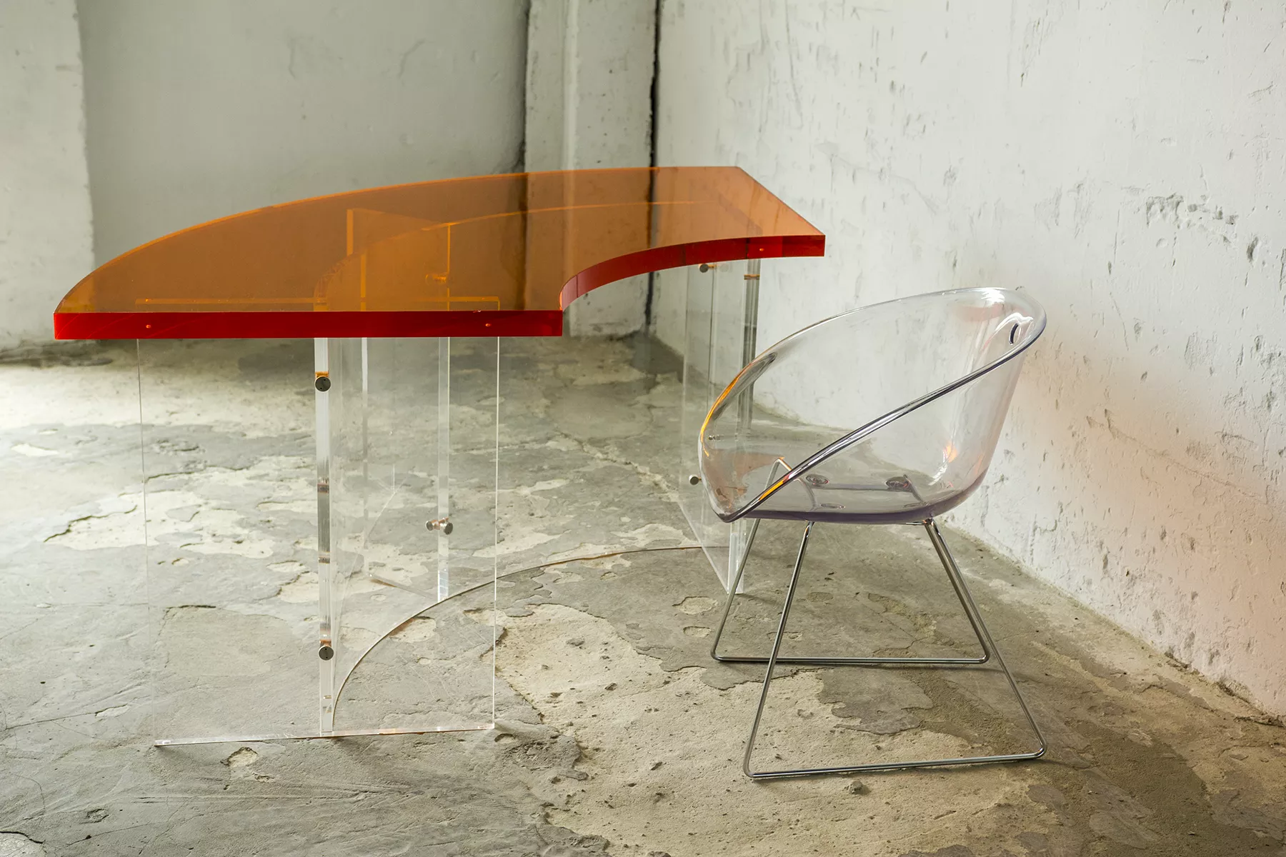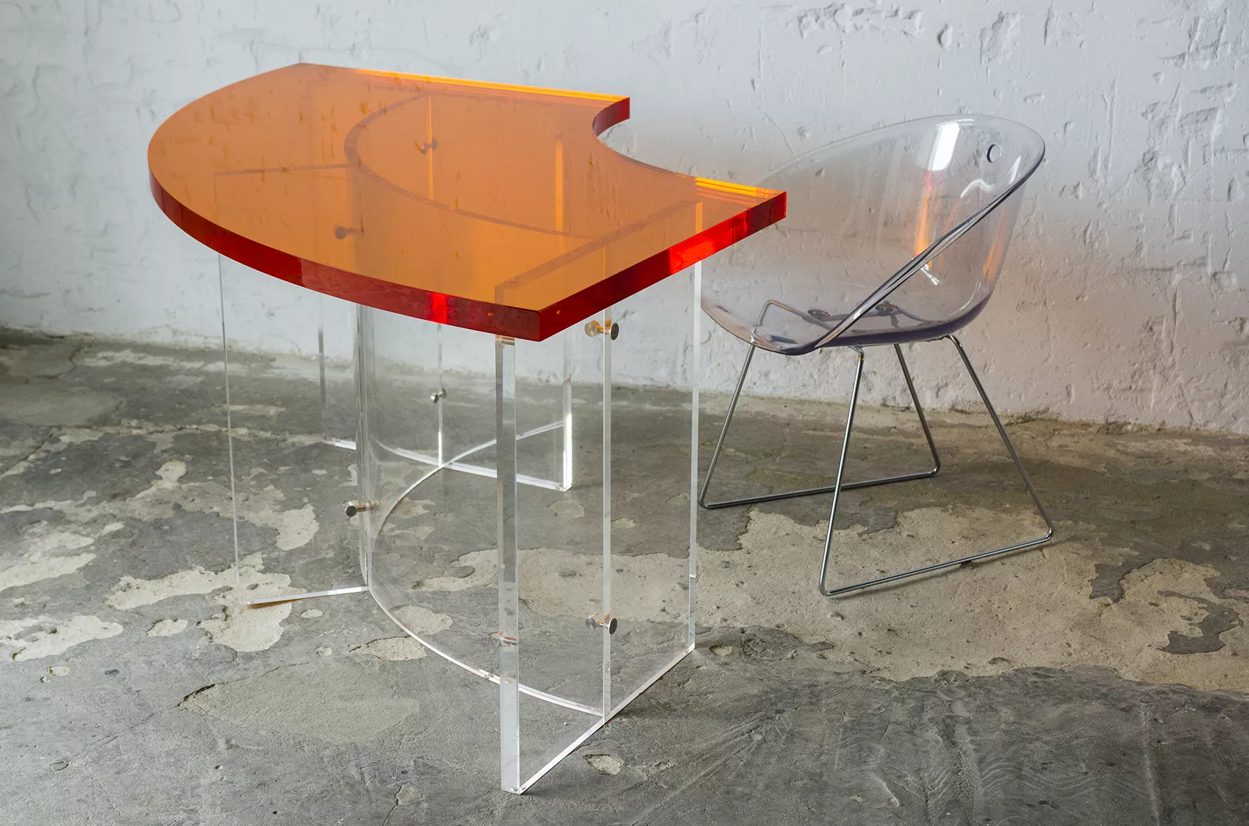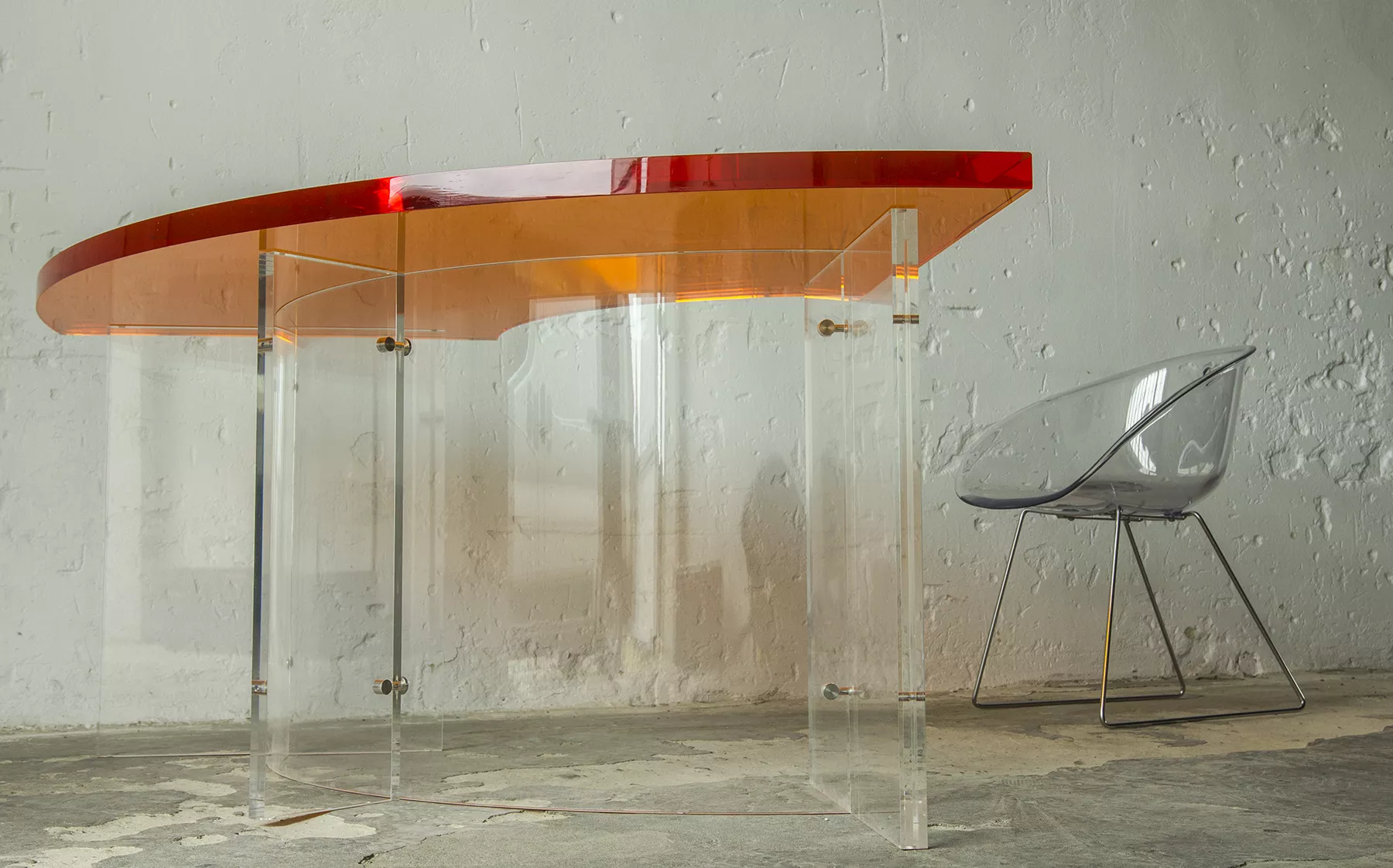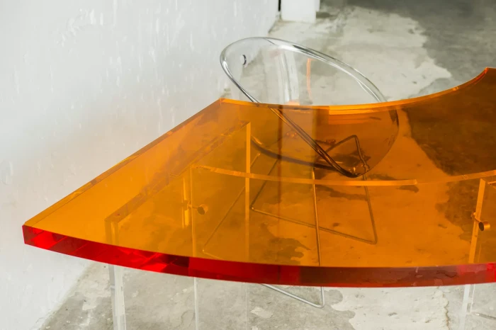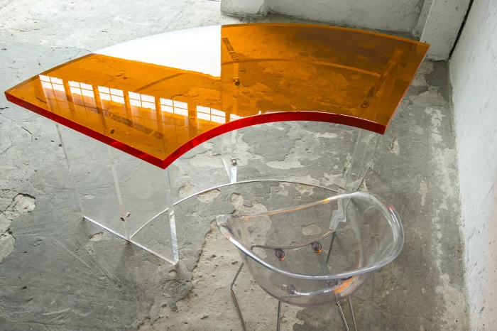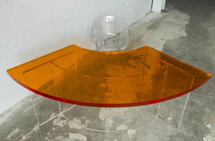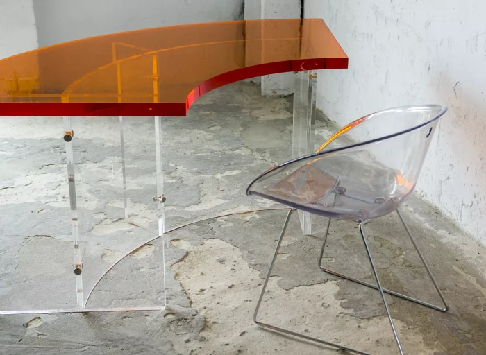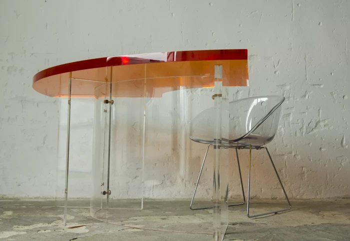 Unikatowe biurko o niebanalnym designie wykonane z przezroczystego szkła akrylowego w stylu space age z lat 70. Jest to ponadczasowy mebel, który charakteryzuje się eleganckim i minimalistycznym wzornictwem, przezroczysty materiał lucite dodaje nowoczesnego i lekkiego charakteru, a solidna konstrukcja z bardzo grubego akrylu zapewnia trwałość i stabilność. Natomiast jaskrawo pomarańczowy blat przepięknie rozprasza światło w słoneczne dni. Biurko zachowane jest w oryginalnym i bardzo dobrym stanie, posiada delikatne zarysowania i obicia spowodowane wiekiem. Mebel jest łączony na specjalne śruby bez użycia kleju, można go rozłożyć na kilka mniejszych elementów co ułatwi przenoszenie, transport itd. a waży nie mało, bo ok. 90 kg.