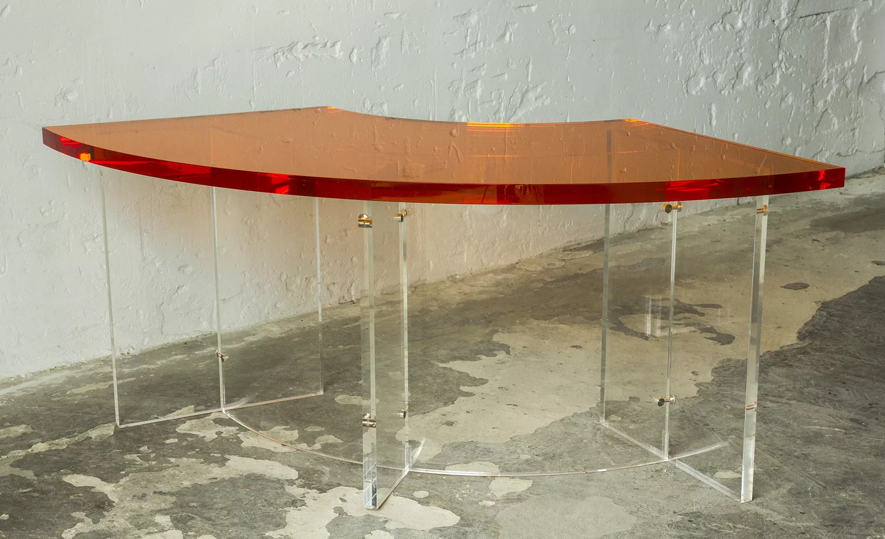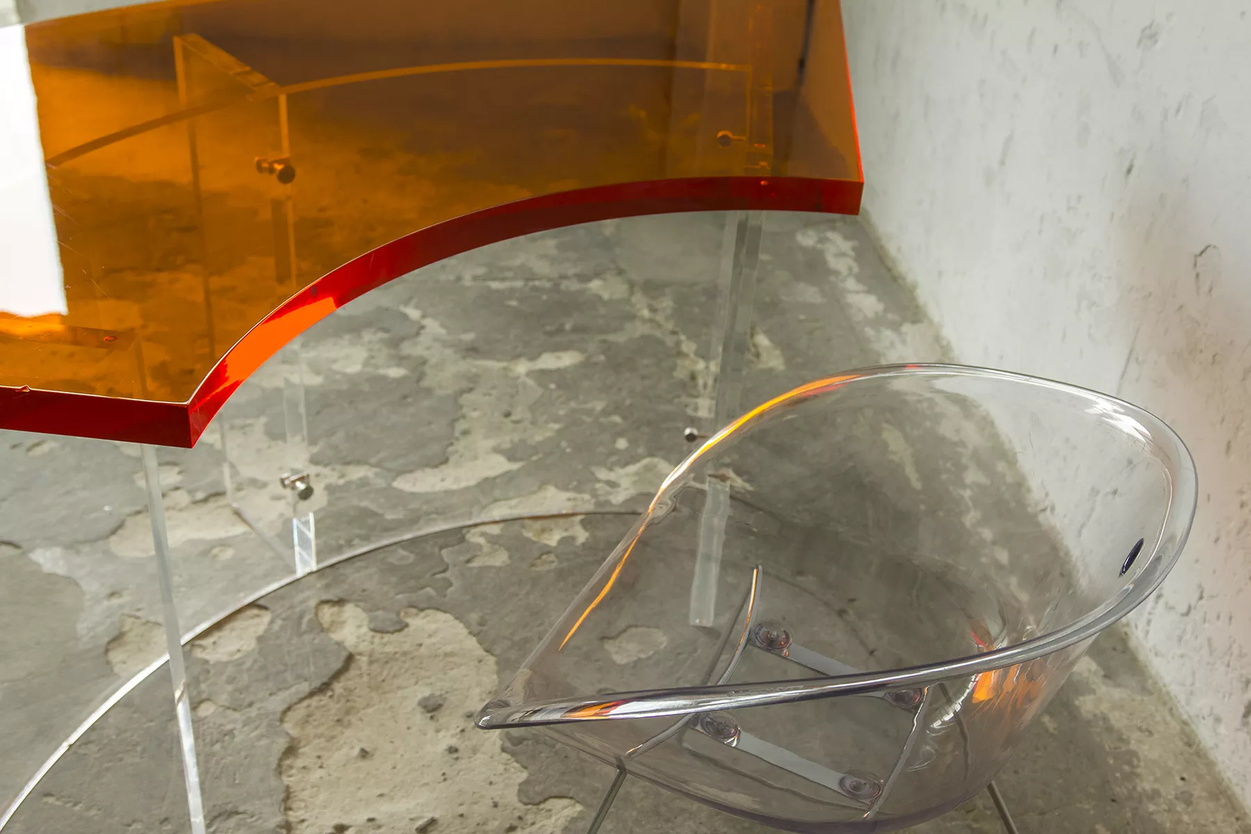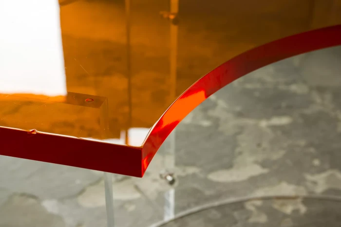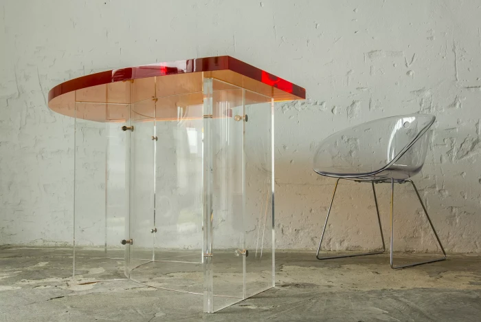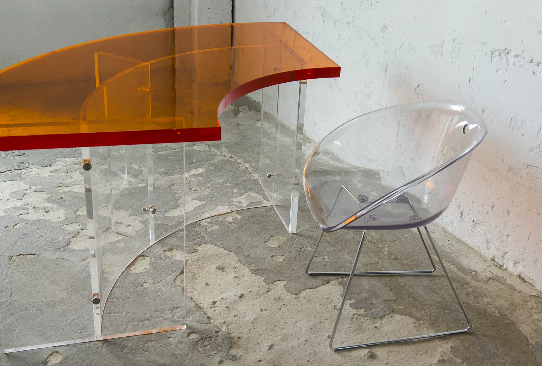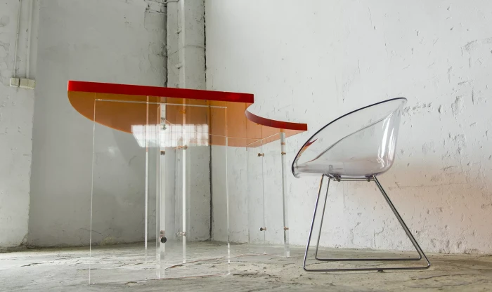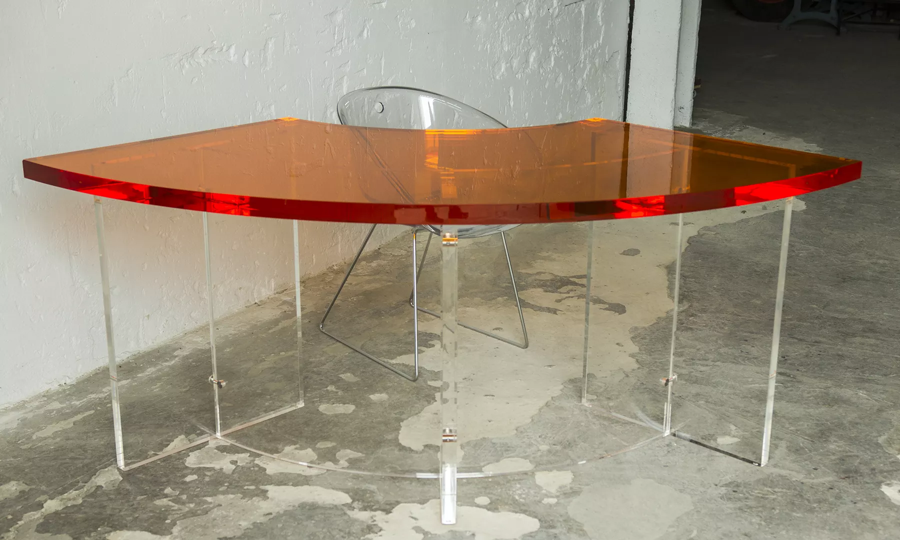 Unikatowe biurko o niebanalnym designie wykonane z przezroczystego szkła akrylowego w stylu space age z lat 70. Jest to ponadczasowy mebel, który charakteryzuje się eleganckim i minimalistycznym wzornictwem, przezroczysty materiał lucite dodaje nowoczesnego i lekkiego charakteru, a solidna konstrukcja z bardzo grubego akrylu zapewnia trwałość i stabilność. Natomiast jaskrawo pomarańczowy blat przepięknie rozprasza światło w słoneczne dni. Biurko zachowane jest w oryginalnym i bardzo dobrym stanie, posiada delikatne zarysowania i obicia spowodowane wiekiem. Mebel jest łączony na specjalne śruby bez użycia kleju, można go rozłożyć na kilka mniejszych elementów co ułatwi przenoszenie, transport itd. a waży nie mało, bo ok. 90 kg.