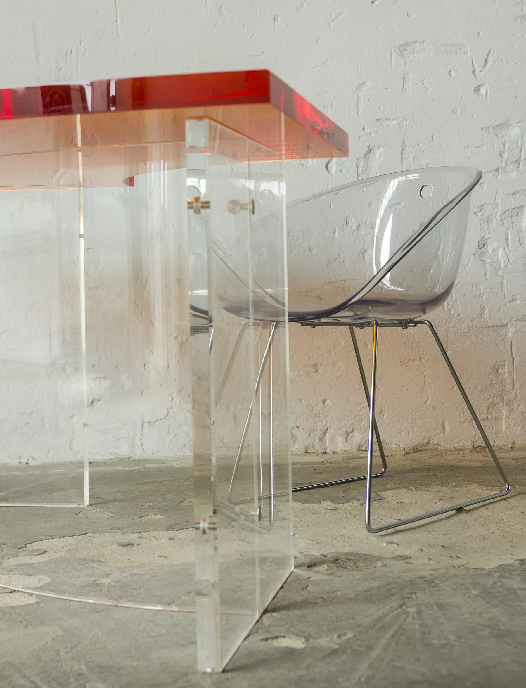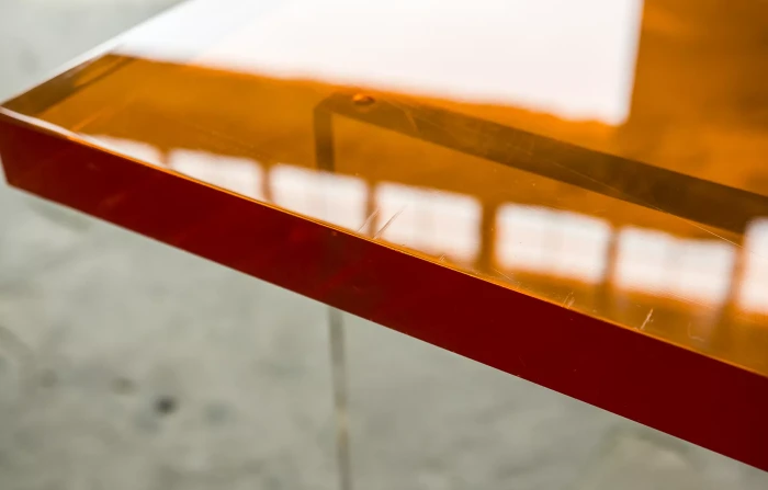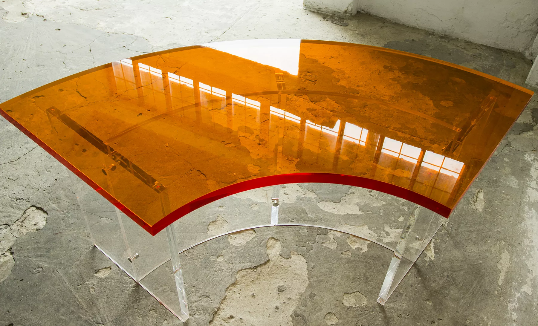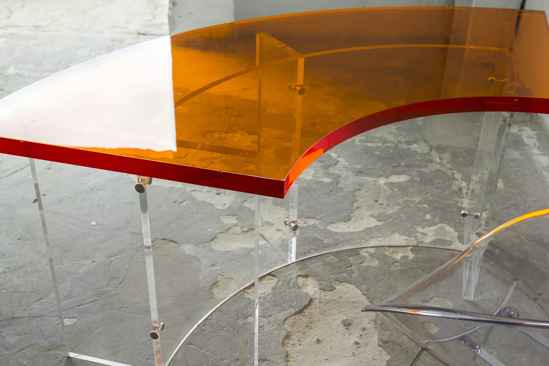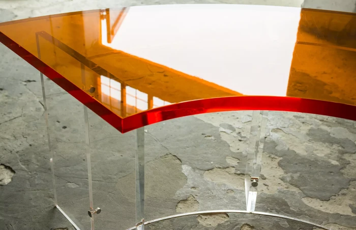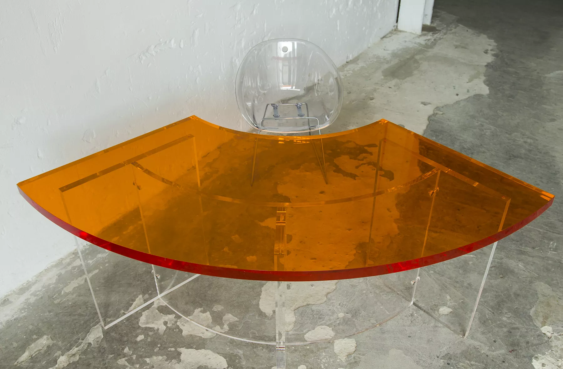 Unikatowe biurko o niebanalnym designie wykonane z przezroczystego szkła akrylowego w stylu space age z lat 70. Jest to ponadczasowy mebel, który charakteryzuje się eleganckim i minimalistycznym wzornictwem, przezroczysty materiał lucite dodaje nowoczesnego i lekkiego charakteru, a solidna konstrukcja z bardzo grubego akrylu zapewnia trwałość i stabilność. Natomiast jaskrawo pomarańczowy blat przepięknie rozprasza światło w słoneczne dni. Biurko zachowane jest w oryginalnym i bardzo dobrym stanie, posiada delikatne zarysowania i obicia spowodowane wiekiem. Mebel jest łączony na specjalne śruby bez użycia kleju, można go rozłożyć na kilka mniejszych elementów co ułatwi przenoszenie, transport itd. a waży nie mało, bo ok. 90 kg.