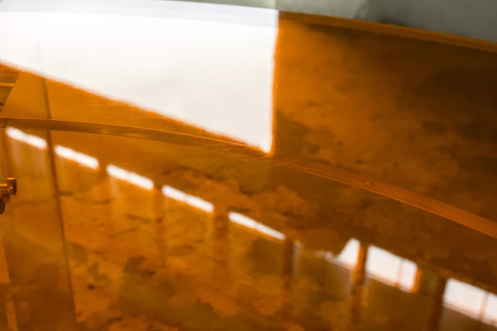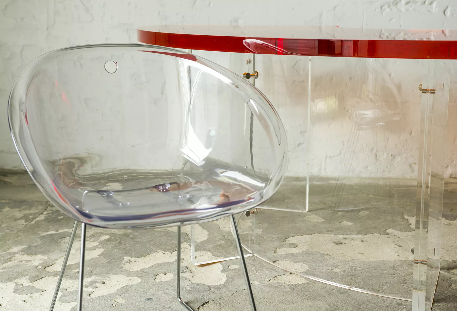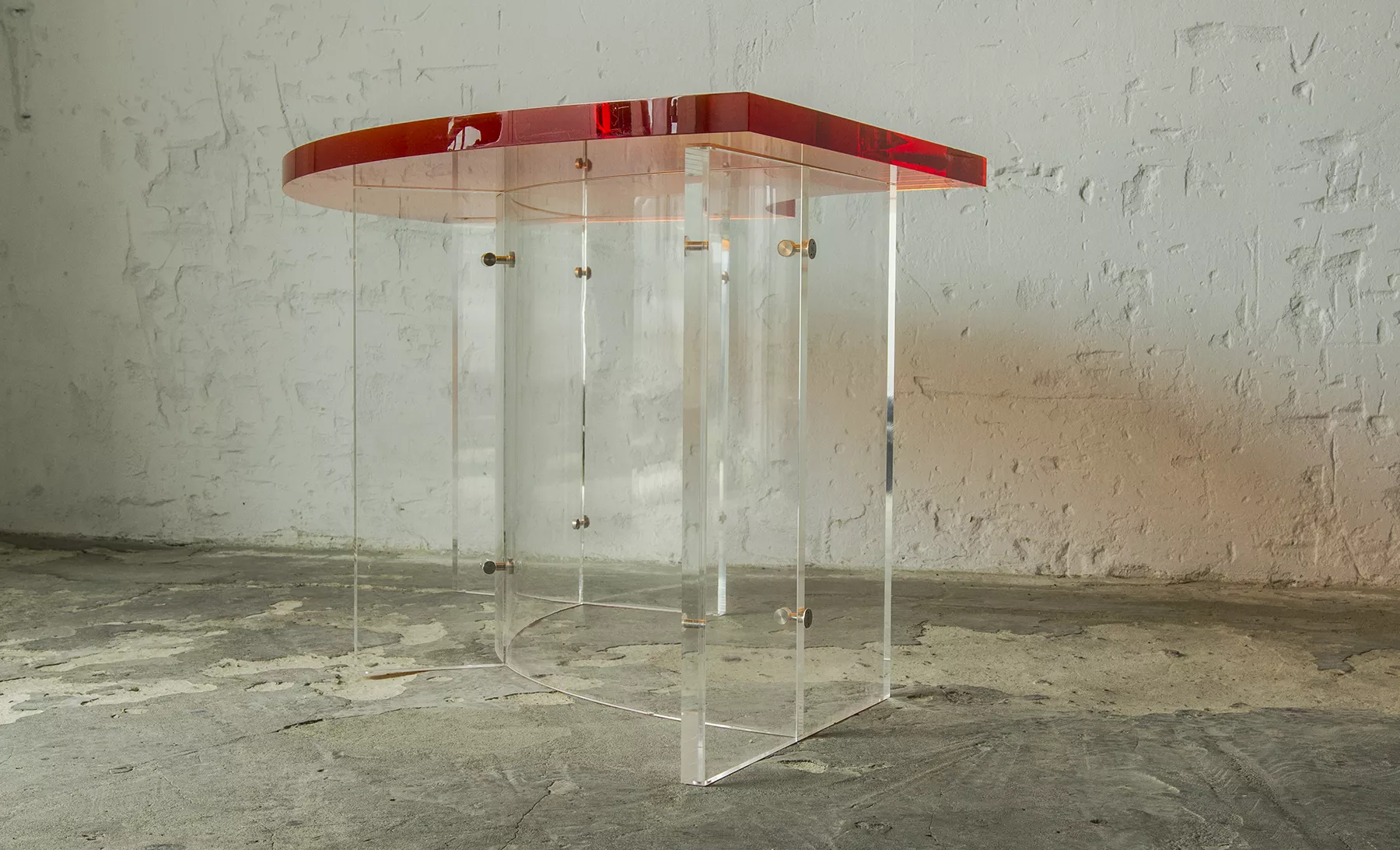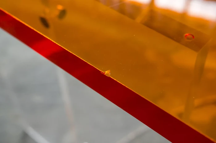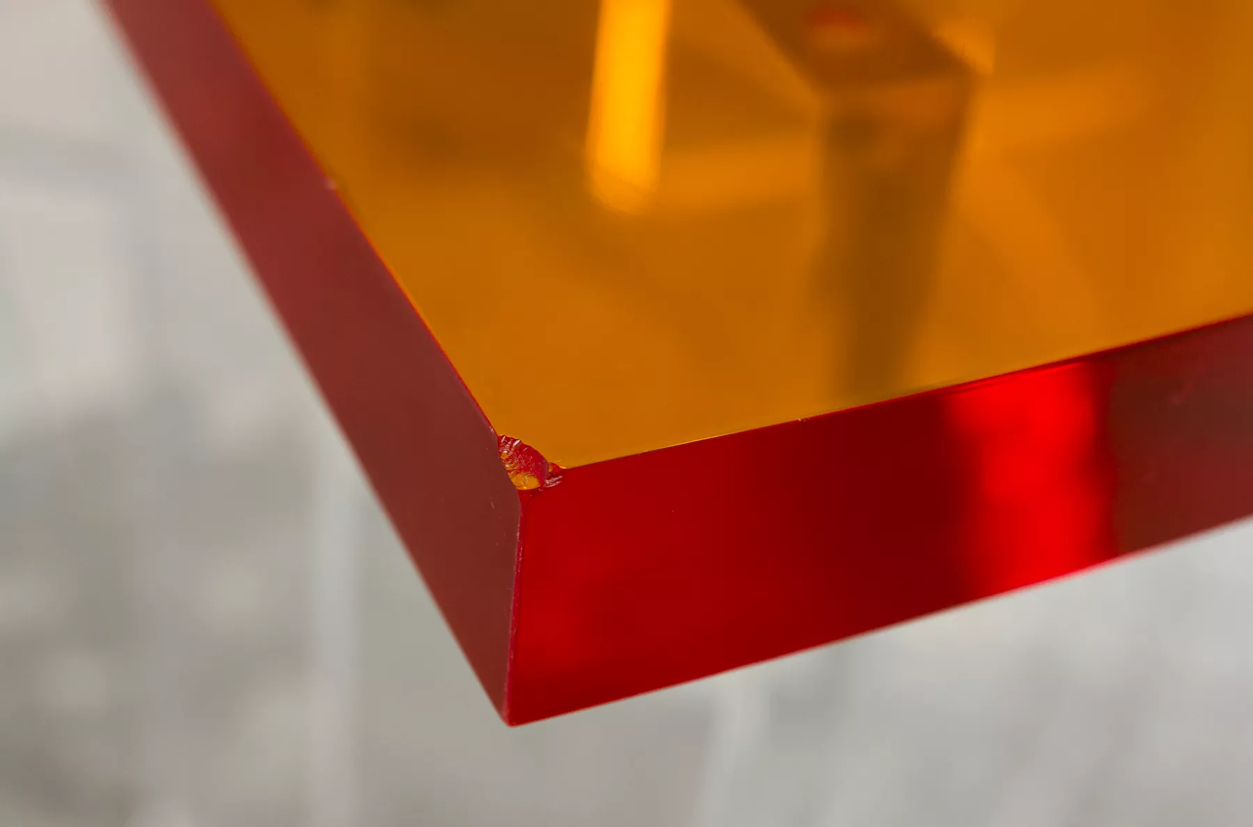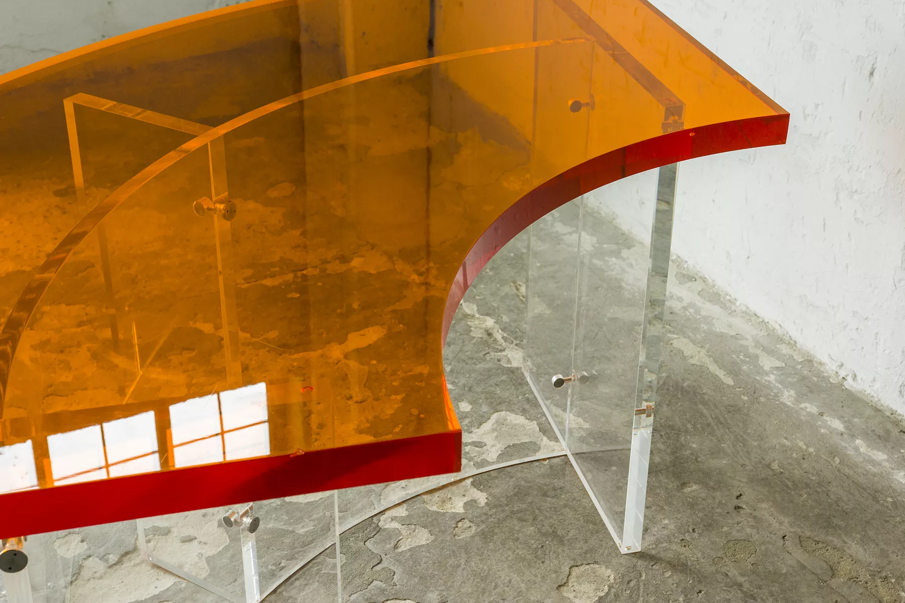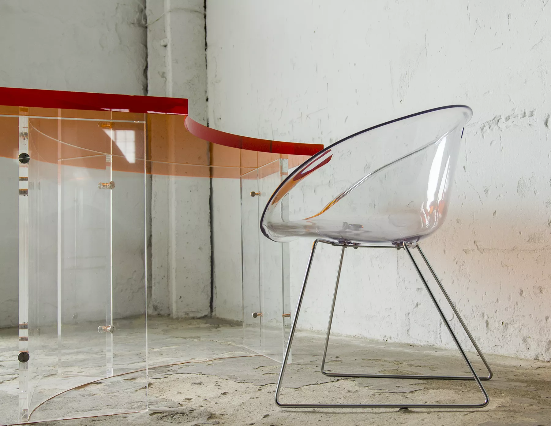 Unikatowe biurko o niebanalnym designie wykonane z przezroczystego szkła akrylowego w stylu space age z lat 70. Jest to ponadczasowy mebel, który charakteryzuje się eleganckim i minimalistycznym wzornictwem, przezroczysty materiał lucite dodaje nowoczesnego i lekkiego charakteru, a solidna konstrukcja z bardzo grubego akrylu zapewnia trwałość i stabilność. Natomiast jaskrawo pomarańczowy blat przepięknie rozprasza światło w słoneczne dni. Biurko zachowane jest w oryginalnym i bardzo dobrym stanie, posiada delikatne zarysowania i obicia spowodowane wiekiem. Mebel jest łączony na specjalne śruby bez użycia kleju, można go rozłożyć na kilka mniejszych elementów co ułatwi przenoszenie, transport itd. a waży nie mało, bo ok. 90 kg.