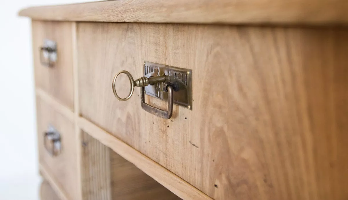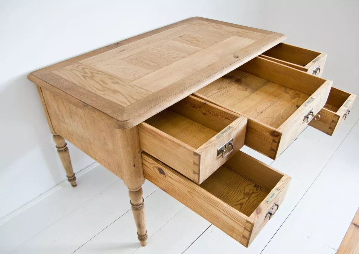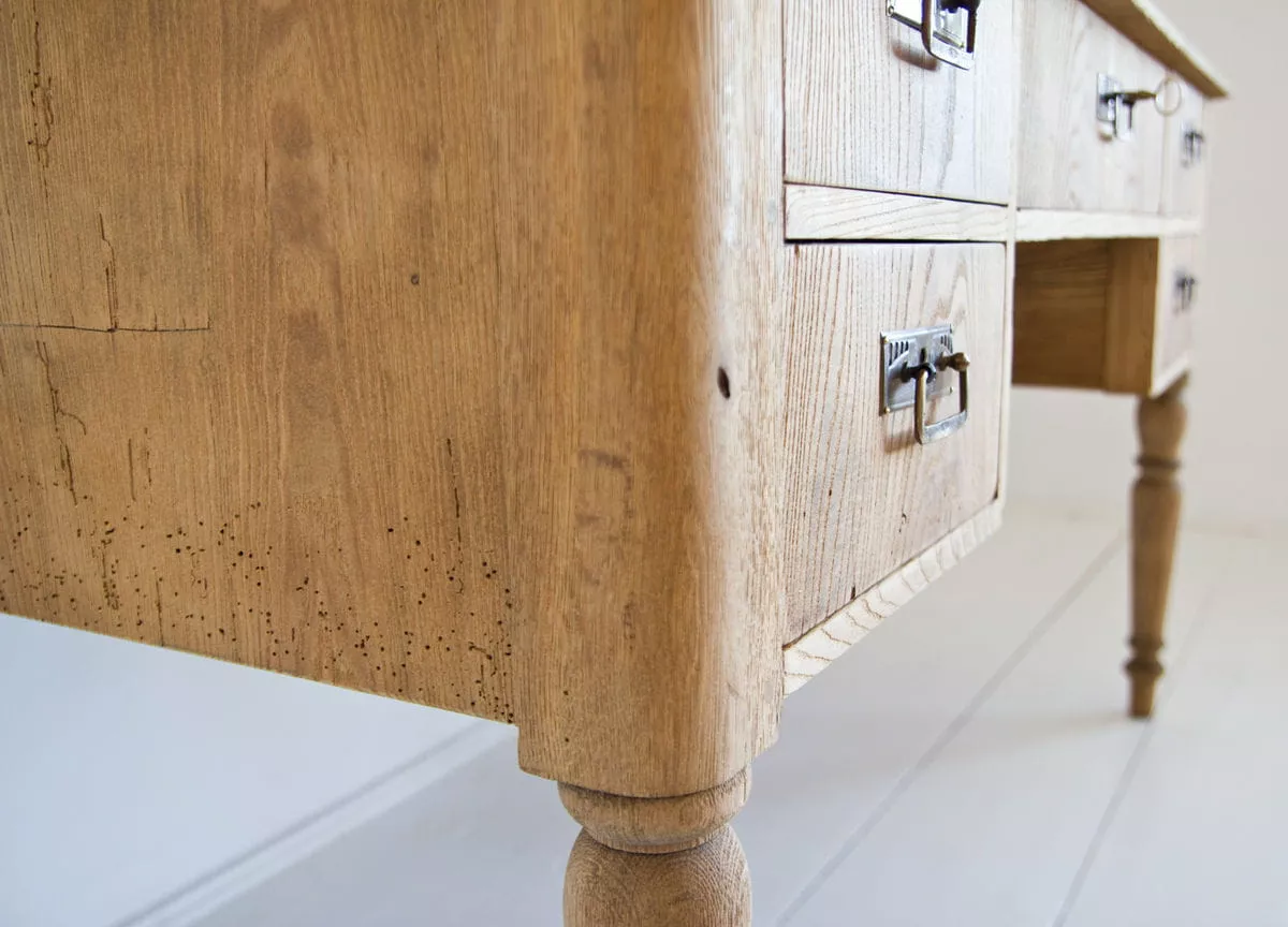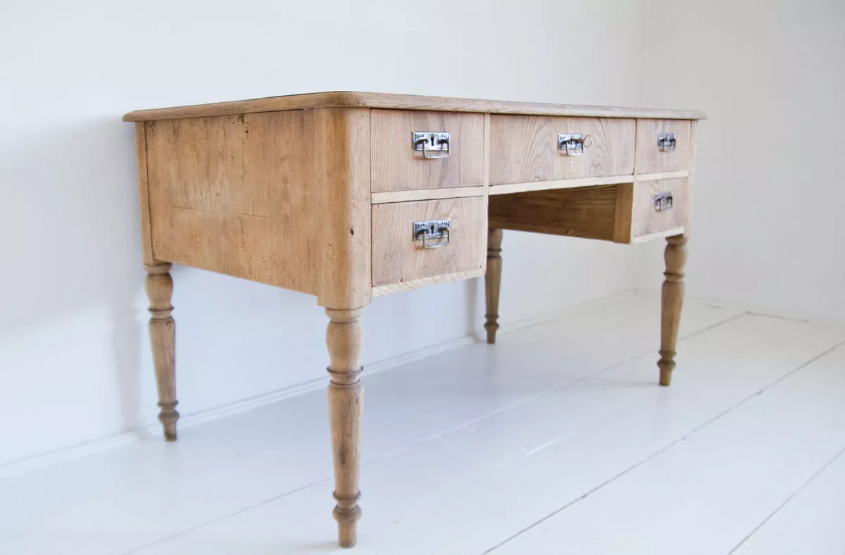Piękne biurko nauczycielskie, które pochodzi ze starej szkoły. Mebel solidnie wykonany, masywny i nierozchwiany. Zostały wymienione prowadnice w głównej szufladzie, naprawiony blat i wszystko zostało oczyszczone. Biurko jest w surowym wykończeniu drewna, ma sprawne wszystkie zamki.
