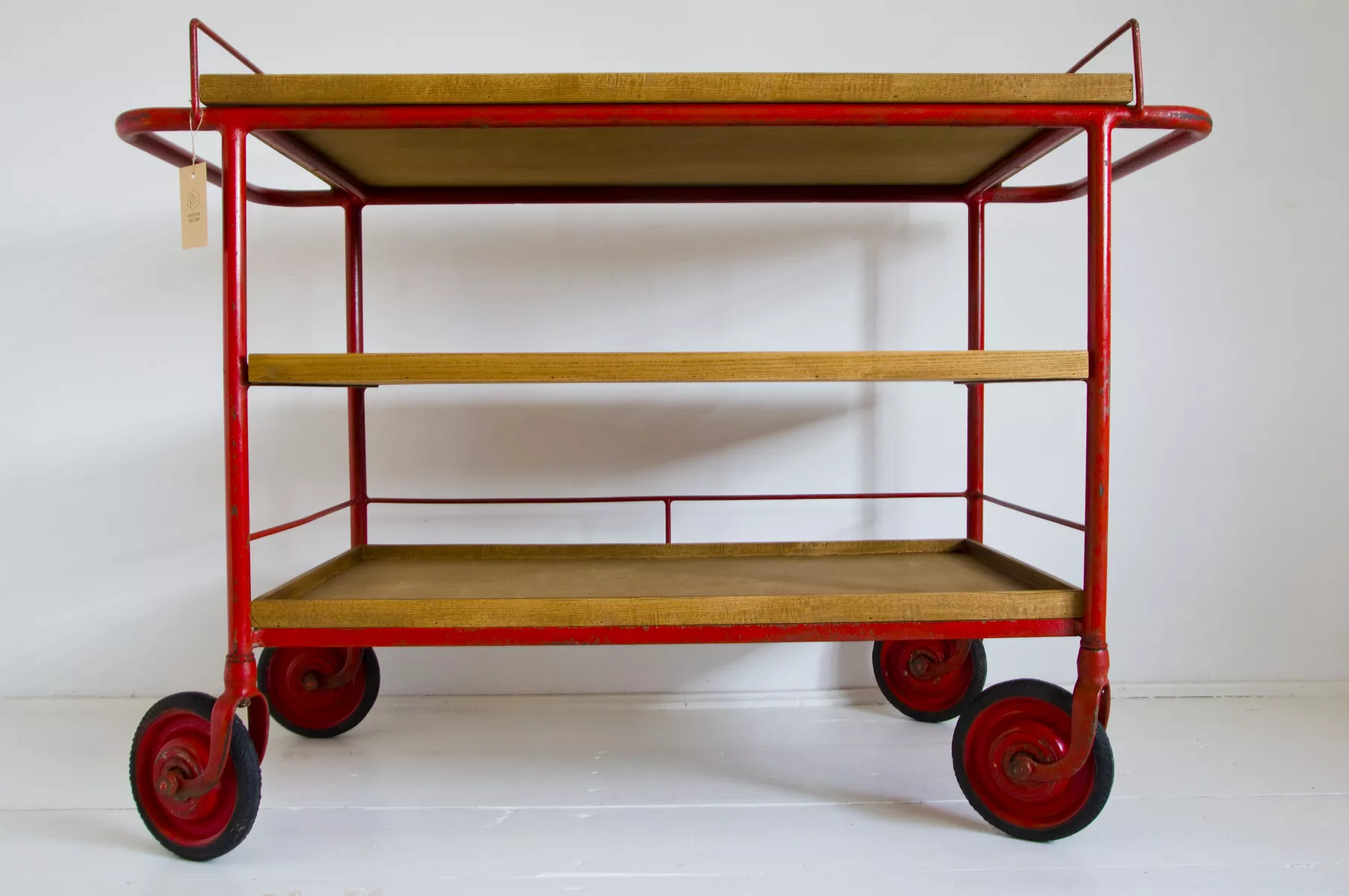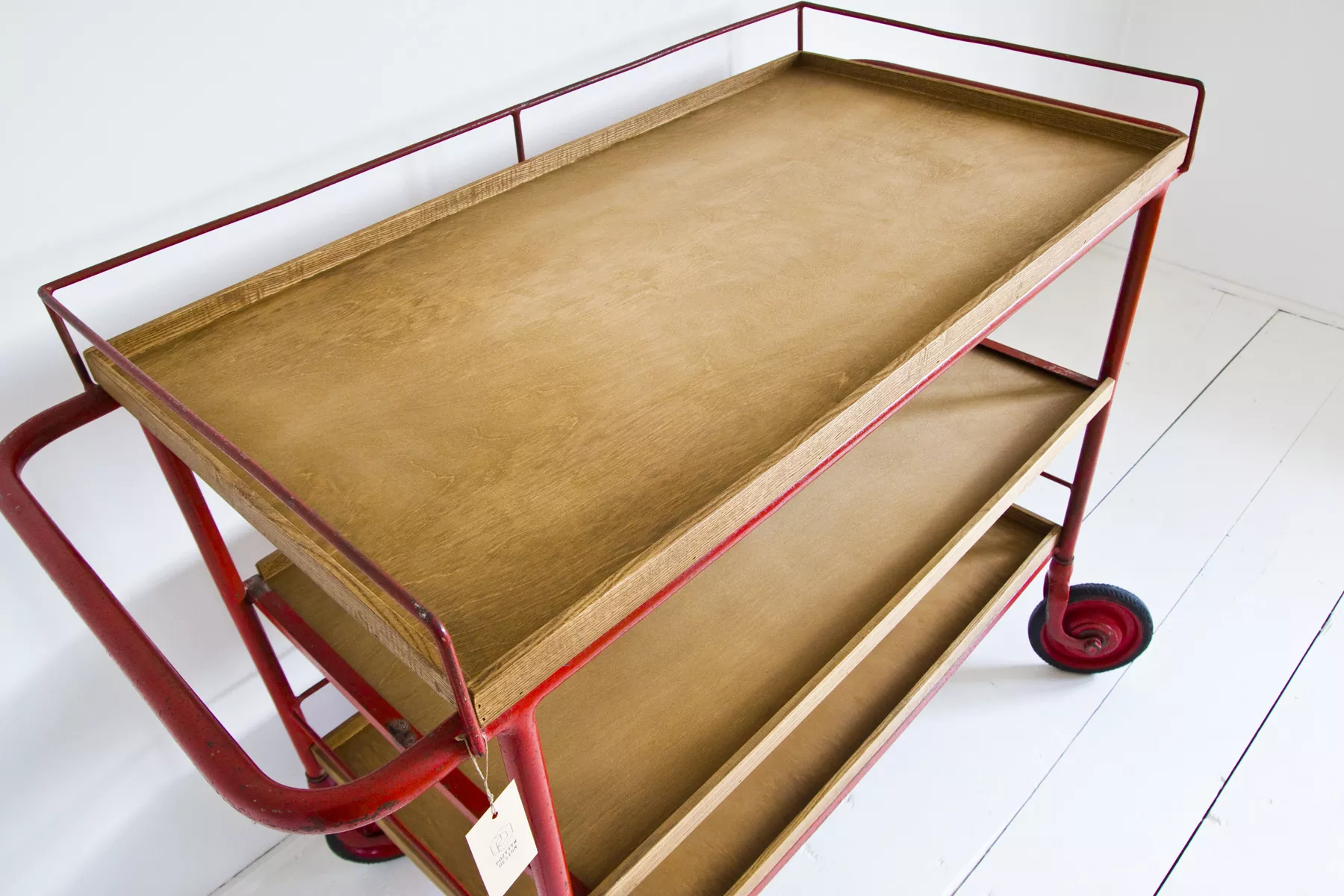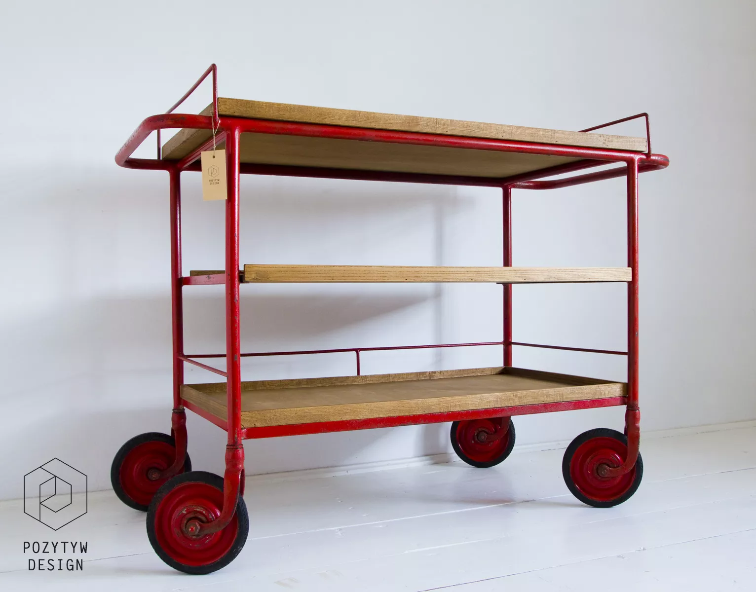 Stary pomocnik kuchenny ( wózek ) w przepięknym czerwonym kolorze. Jest to oryginalny mebel vintage, wszystkie otarcia, zadrapania i obicia powstały przez długie lata użytkowania. Cała konstrukcja wykonana jest z masywnej stali i osadzona na metalowych gumowanych kołach które są łożyskowane co ułatwia jego bezproblemowe i ciche przemieszczanie nawet pod dużym obciążeniem. Mebel posiada trzy drewniane półki z czego środkowa jest wysuwana. Całość jest po odświeżeniu z zachowaniem starej patyny, drewniane elementy zostały poddane renowacji.