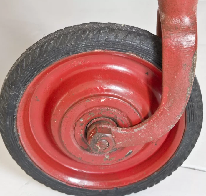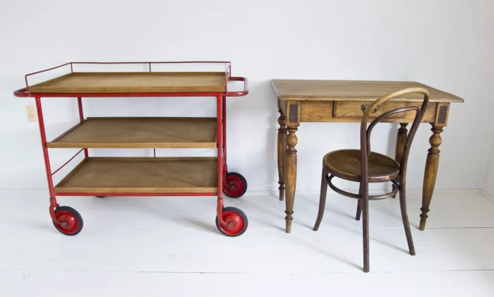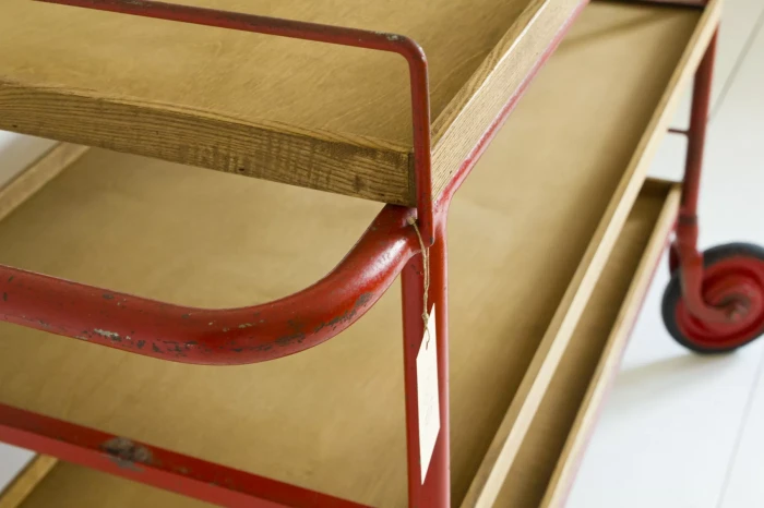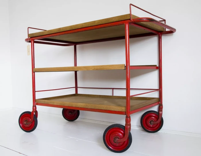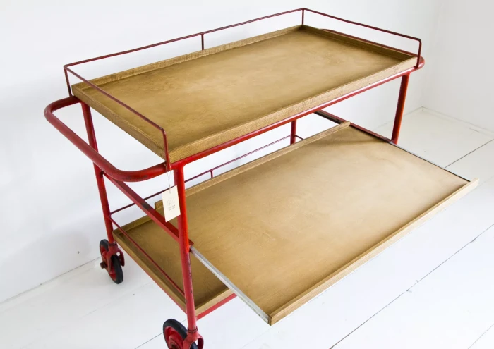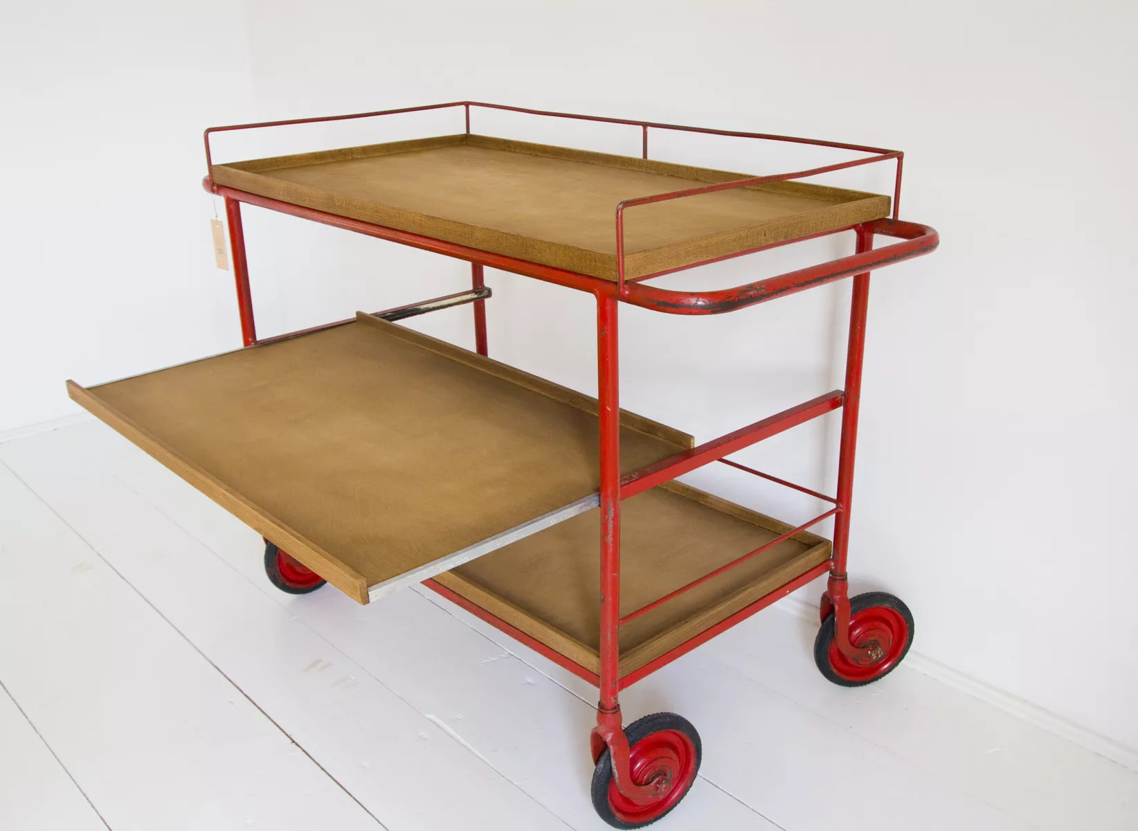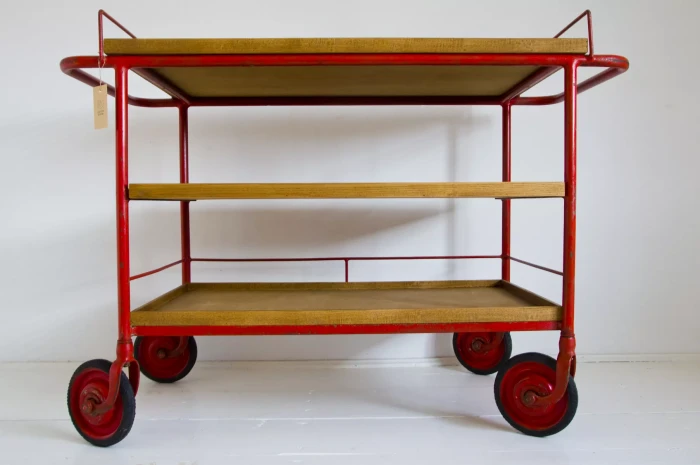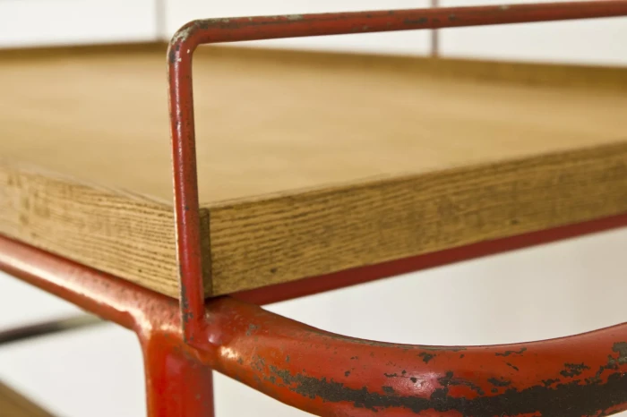 Stary pomocnik kuchenny ( wózek ) w przepięknym czerwonym kolorze. Jest to oryginalny mebel vintage, wszystkie otarcia, zadrapania i obicia powstały przez długie lata użytkowania. Cała konstrukcja wykonana jest z masywnej stali i osadzona na metalowych gumowanych kołach które są łożyskowane co ułatwia jego bezproblemowe i ciche przemieszczanie nawet pod dużym obciążeniem. Mebel posiada trzy drewniane półki z czego środkowa jest wysuwana. Całość jest po odświeżeniu z zachowaniem starej patyny, drewniane elementy zostały poddane renowacji.