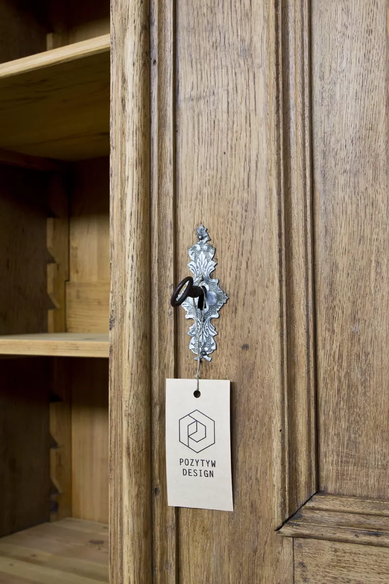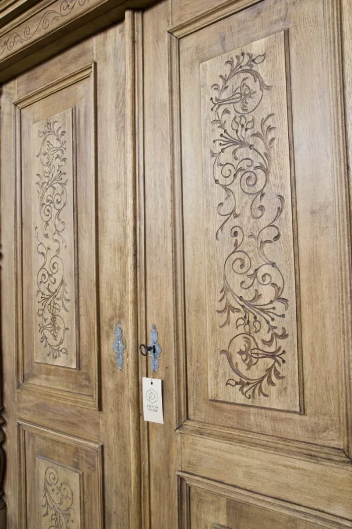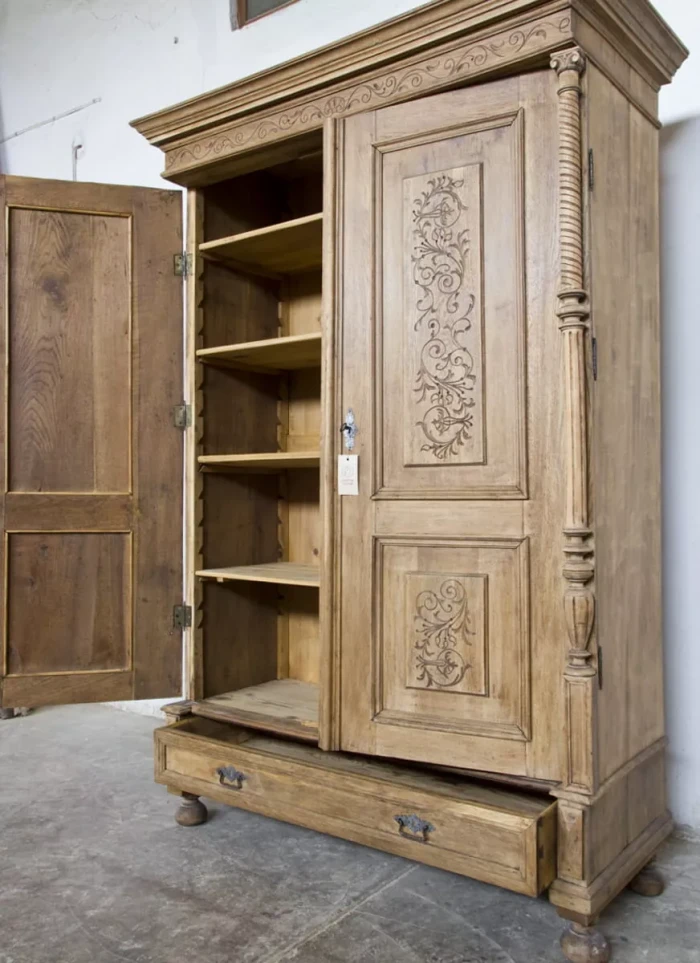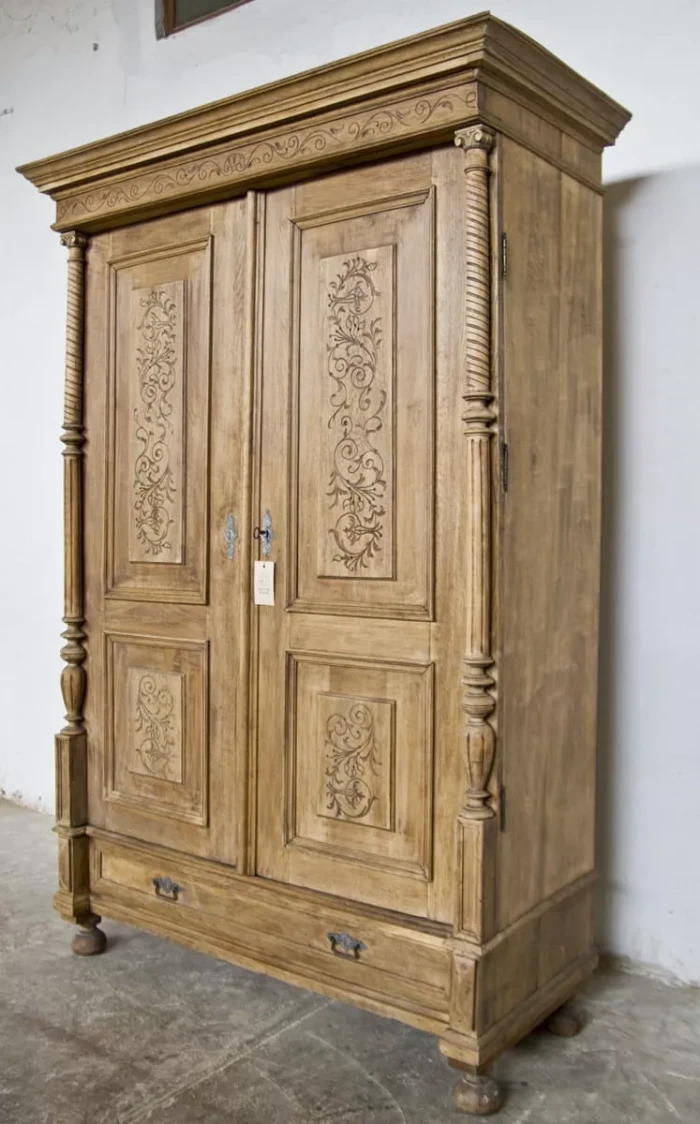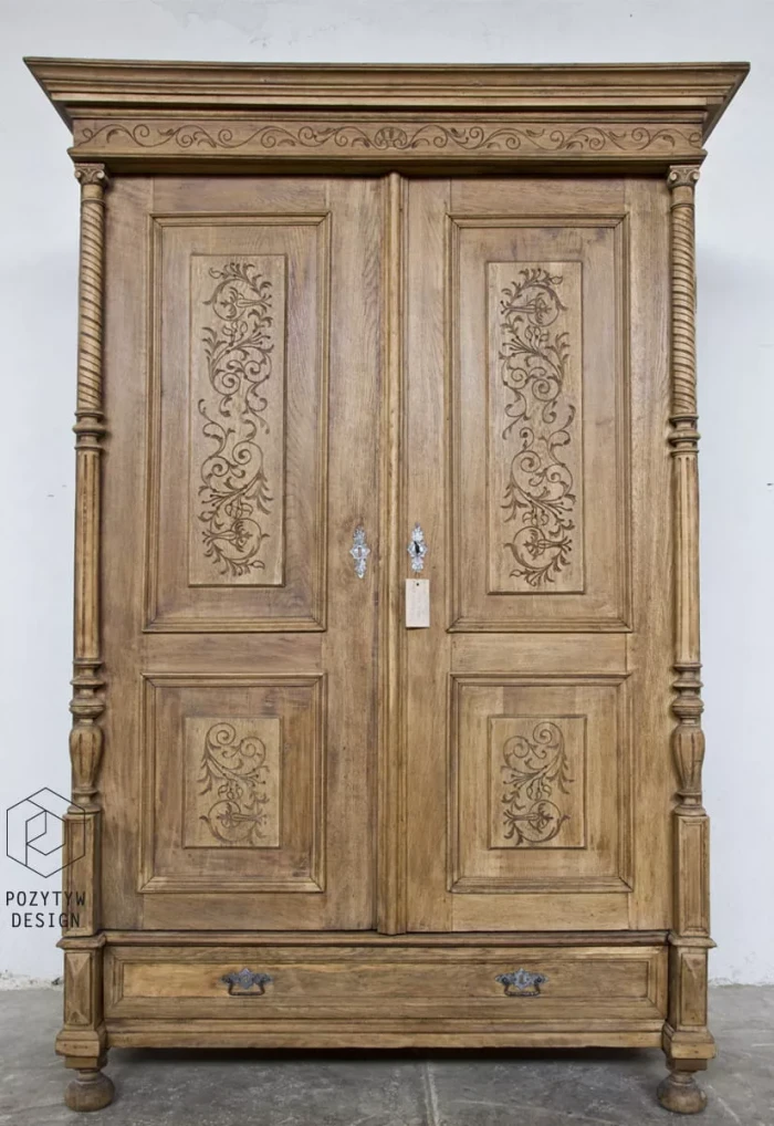 Stara dębowa bieliźniarka z oryginalnymi rzeźbionymi zdobieniami. Jest to Polski mebel i jak na swoje lata zachował się w przyzwoitym stanie, całość jest po starannym oczyszczeniu w surowym wykończeniu drewna i delikatnych naprawach. Bieliźniarka posiada możliwość regulacji wysokości półek i po dołożeniu drążka na wieszaki może również służyć jako szafa. Drewno jest po konserwacji, bez zawilgocenia i nieprzyjemnych zapachów.