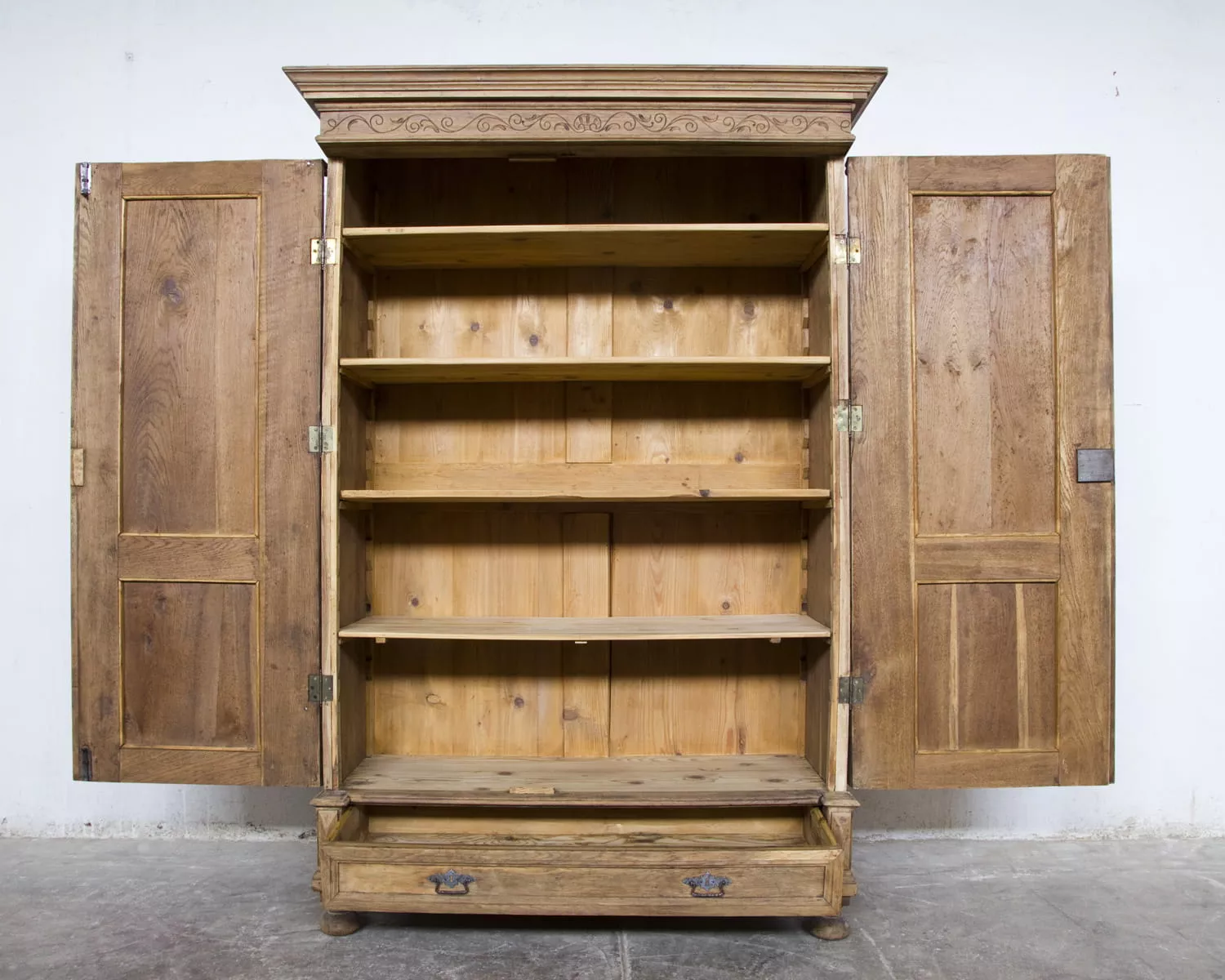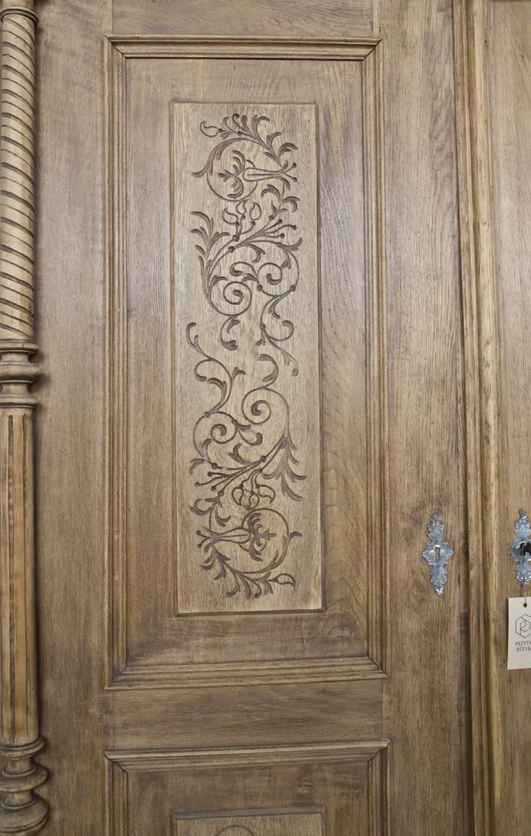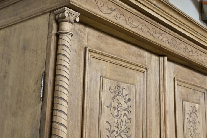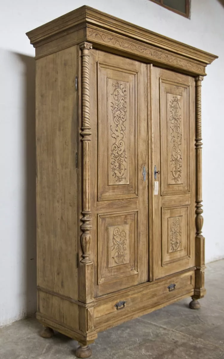 Stara dębowa bieliźniarka z oryginalnymi rzeźbionymi zdobieniami. Jest to Polski mebel i jak na swoje lata zachował się w przyzwoitym stanie, całość jest po starannym oczyszczeniu w surowym wykończeniu drewna i delikatnych naprawach. Bieliźniarka posiada możliwość regulacji wysokości półek i po dołożeniu drążka na wieszaki może również służyć jako szafa. Drewno jest po konserwacji, bez zawilgocenia i nieprzyjemnych zapachów.