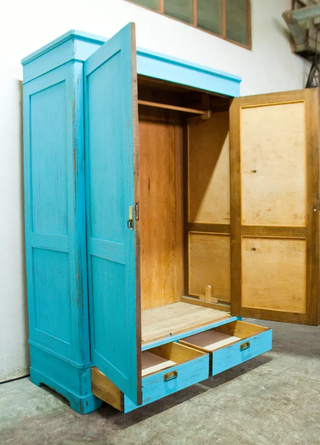 Stara polska szafa o prostej formie, w przepięknym odcieniu błękitu. Mebel wykonany jest w całości z drewna, które zachowało się w bardzo dobrym stanie. W środku znajduje się drążek na wieszaki i dodatkowe półki z regulacją wysokości, są też dwie pojemne szuflady. Z zewnątrz wykończenie w stylu vintage z delikatnymi przecierkami bez zawilgocenia i nieprzyjemnych zapachów, gotowa do użytku.