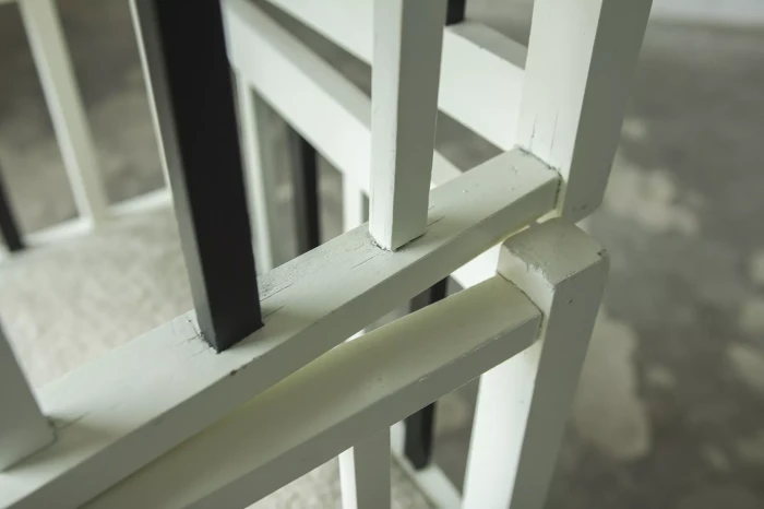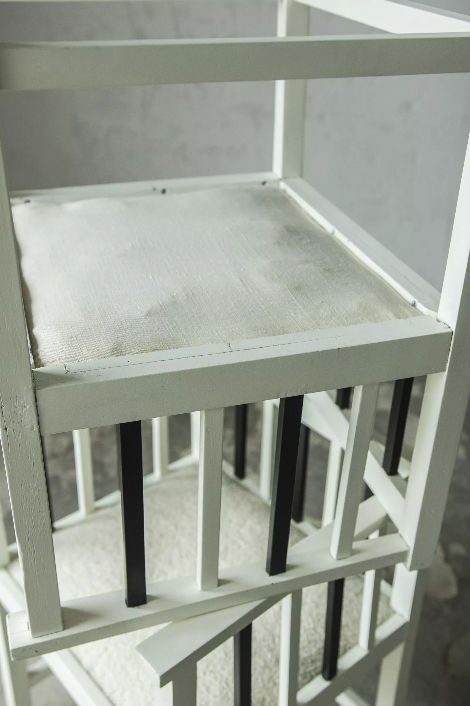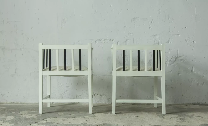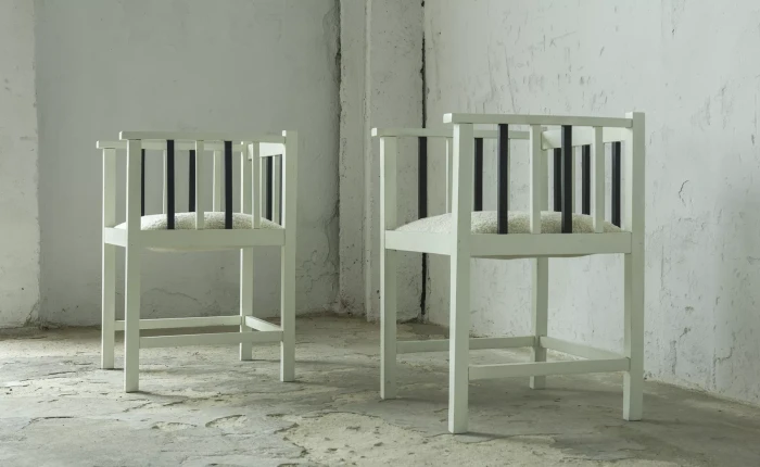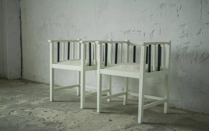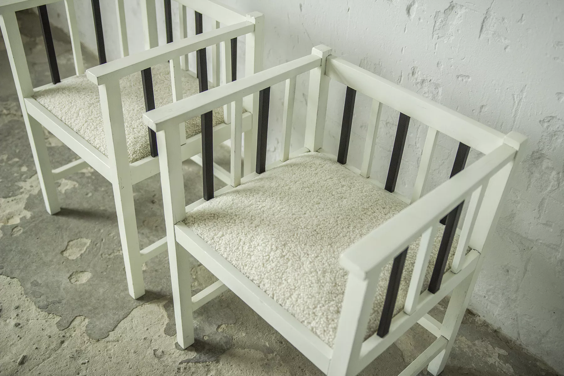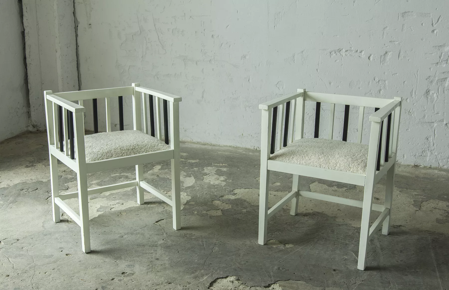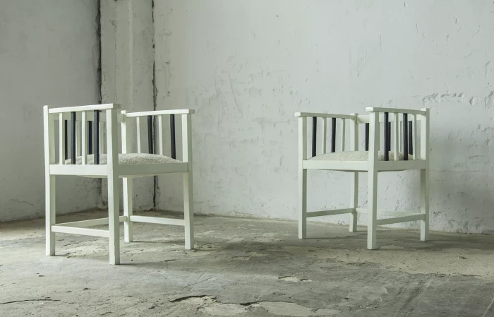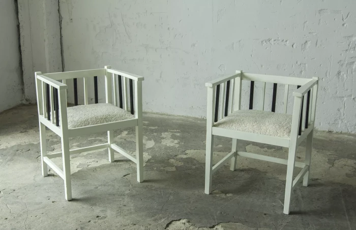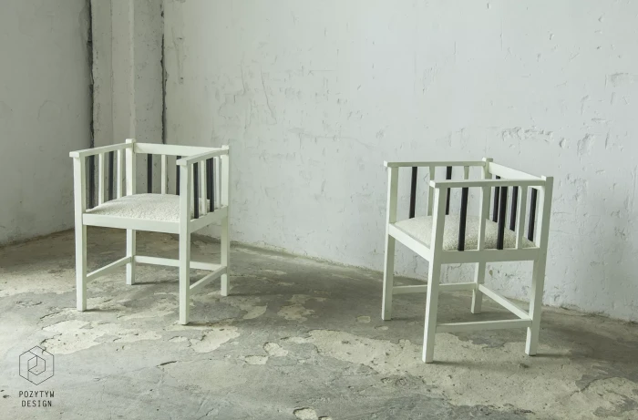 Unikatowe krzesła (fotele) o geometrycznych czystych liniach. Pochodzą z początku XX wieku i najprawdopodobniej zostały wyprodukowane w Europie środkowej około 1905 - 1920 r. Jest to solidna drewniana konstrukcja, charakteryzująca się pionowymi szczebelkami w oparciu oraz podłokietnikach i stonowaną formą architektoniczną. Krzesła zachowane są w bardzo dobrym stanie vintage, wraz z biało-czarnym malowaniem, na którym widać delikatne ślady zużycia i patyny, oraz kolejne warstwy farby. Siedziska posiadają jeszcze oryginalny system sprężyn i są wyciągane. Została wymieniona tylko tapicerka na nową. Całość jest stabilna i gotowa do użytkowania.