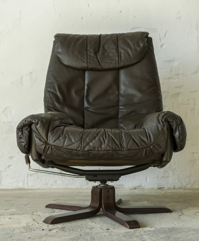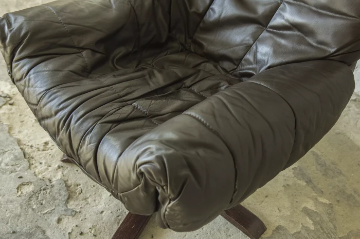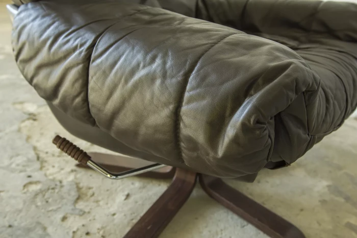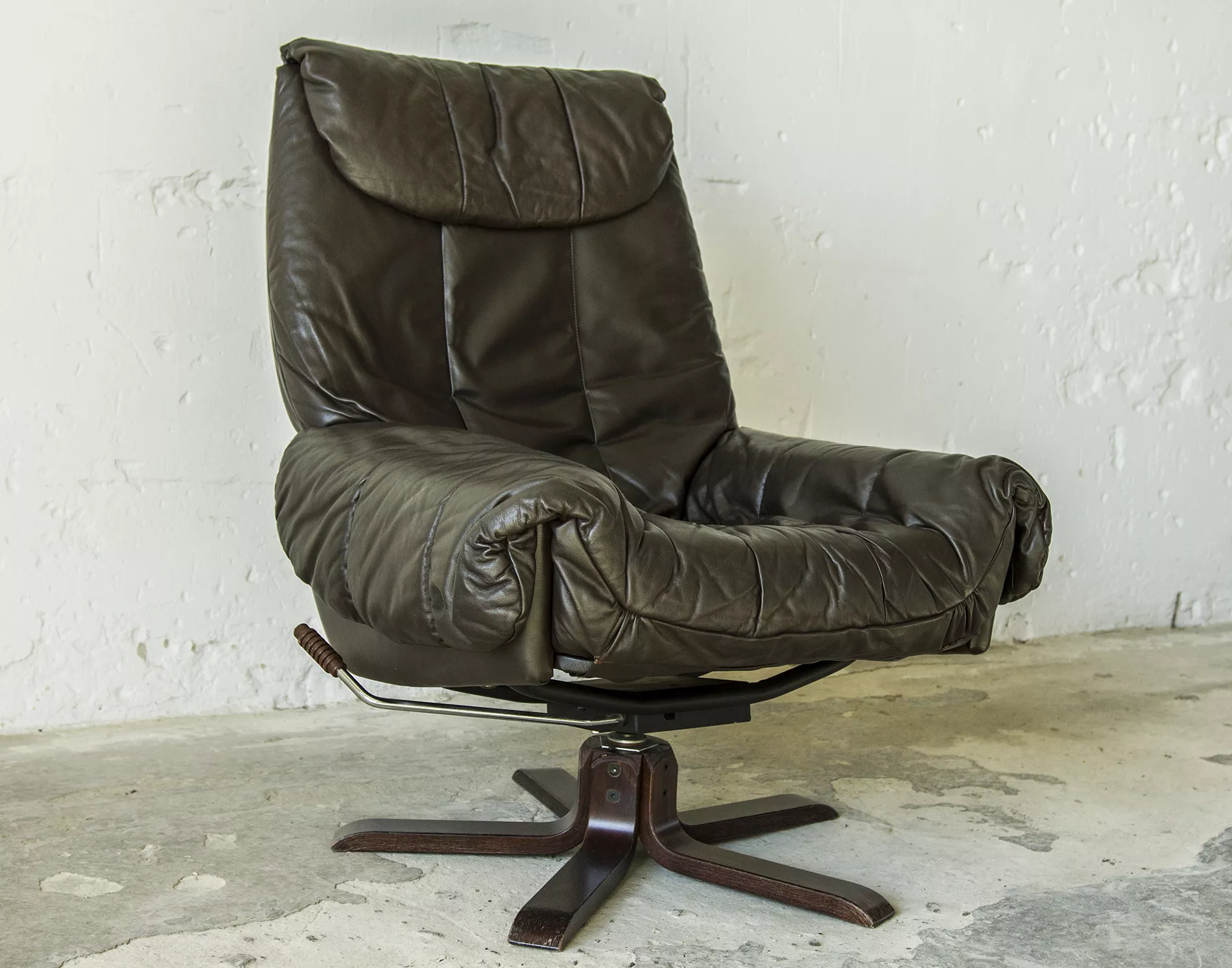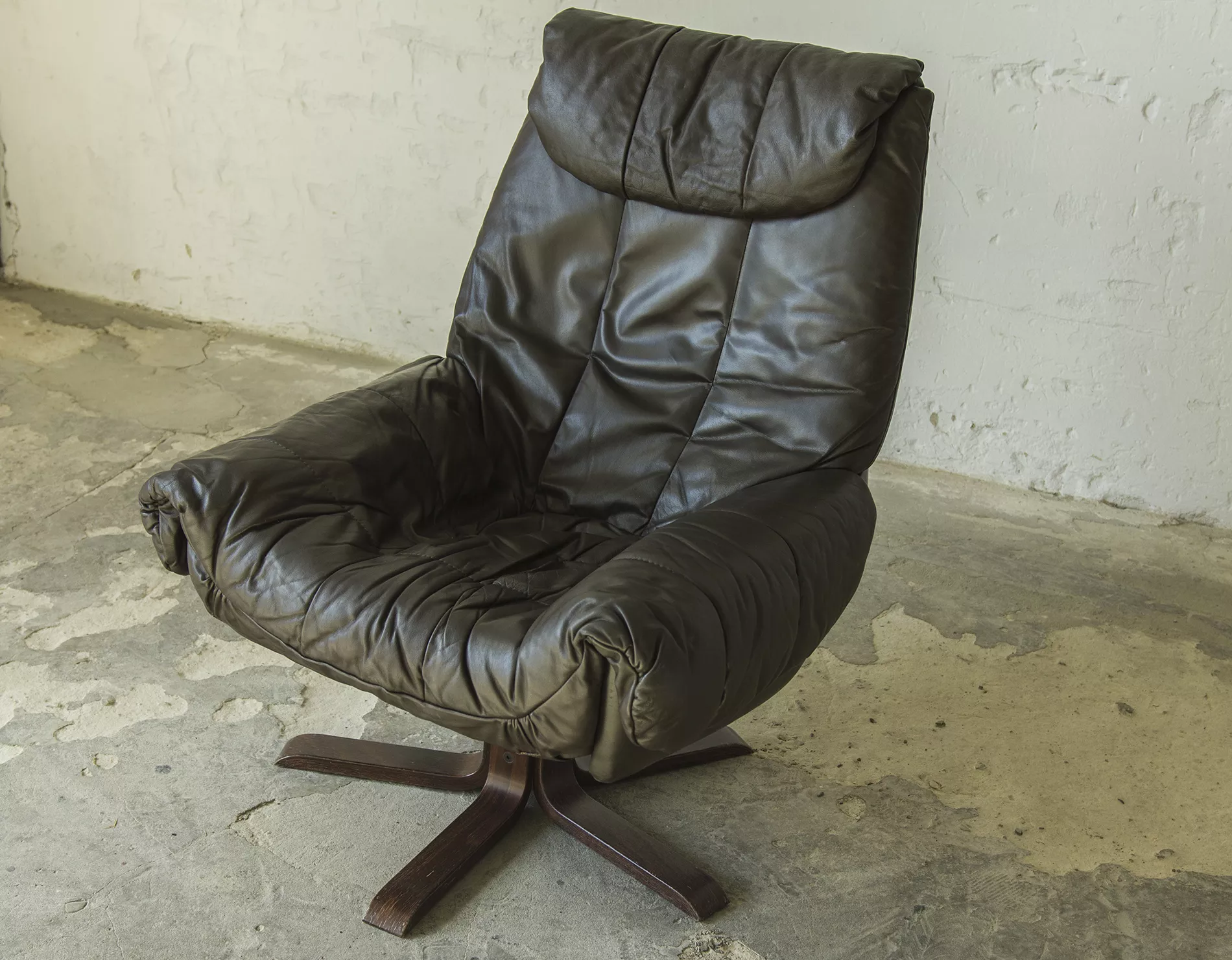 Duński obrotowy fotel wypoczynkowy z lat 70-tych, projektu HW Klein. Tapicerowany jest naturalną skórą w kolorze brązowym, która przez te wszystkie lata nabrała przepięknej patyny. Fotel wyróżnia się ergonomicznym designem, siedzisko jest głębokie i nisko osadzone co w połączeniu z miękką skórą daje uczucie komfortu i wygody na wysokim poziomie. Konstrukcja to drewniana rama, osadzona na metalowej obrotowej podstawie, która posiada regulację odchylania do tyłu z blokadą pozycji.