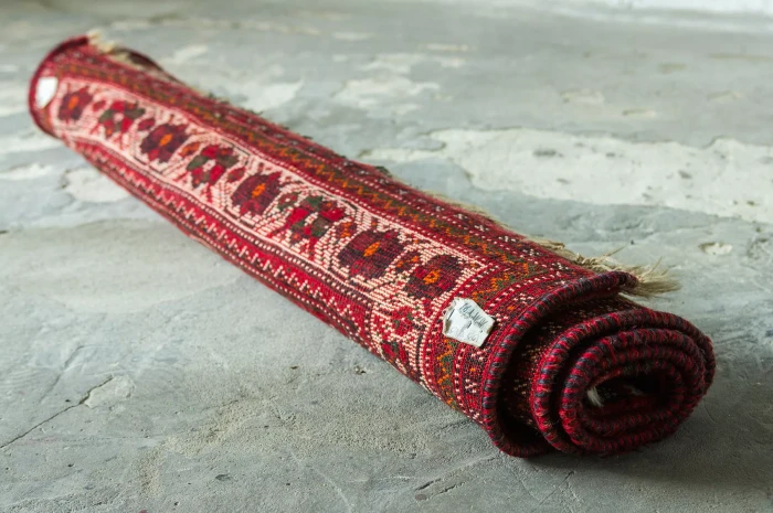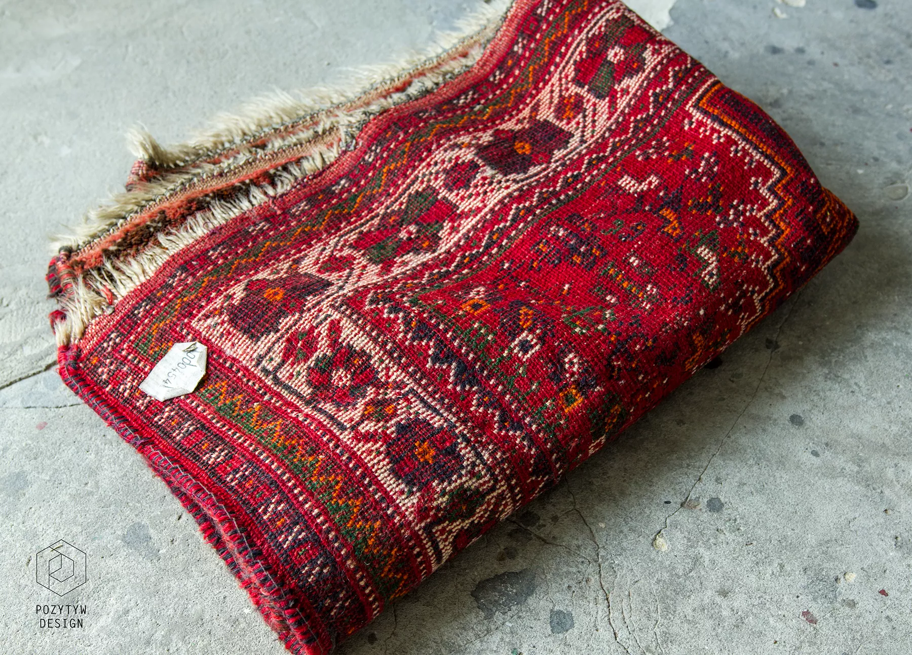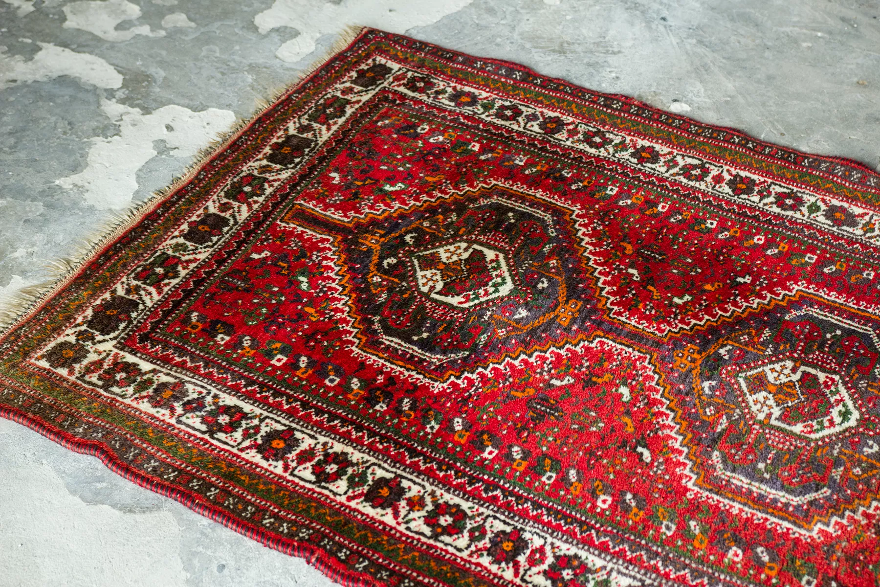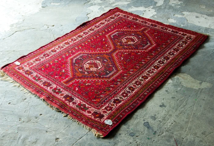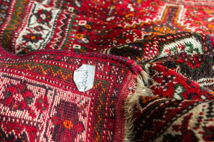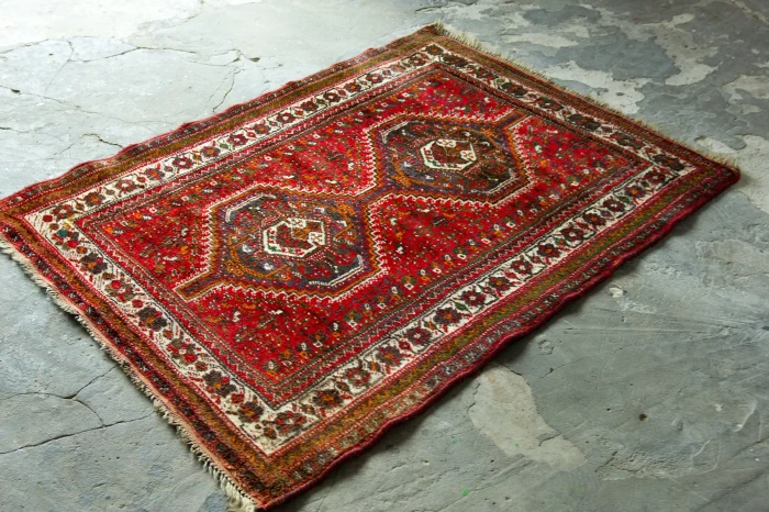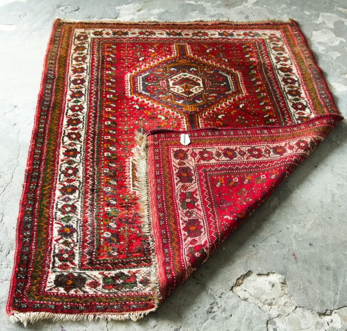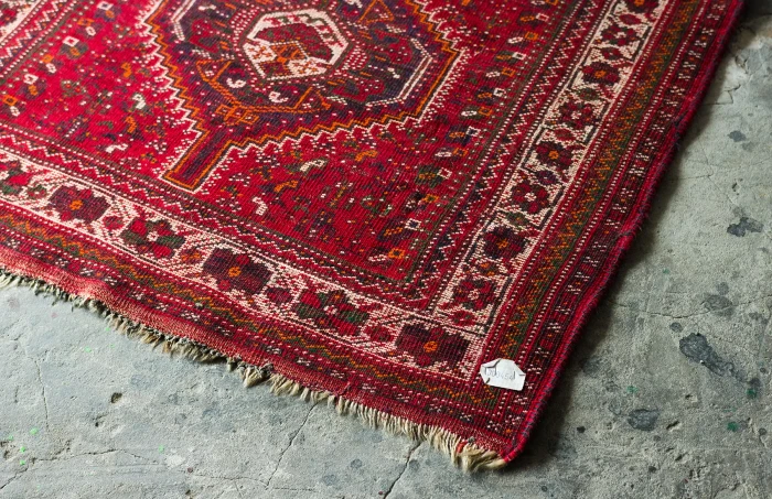 Orientalny dywanik vintage ( SHIRAZ ). Jest to oryginalny dywan nomadów, tradycyjnie ręcznie tkany z naturalnej wełny. Tradycyjny projekt składa się sześciokąta ozdobionego haczykiem, który opiera się na mniejszych elementach takich jak zwierzęta, rośliny, ludzie i wzorach geometrycznych rozrzuconych w tle. Typowe dla dywanu shiraz jest to, że łańcuszek, który można zobaczyć w postaci frędzli na obu końcach dywanu, składa się głównie z wełny, a nie jak w większości dywanów z bawełny. Shizar często występuje w cieplejszych kolorach takich jak czerwony, brązowy, granatowy i czarny.