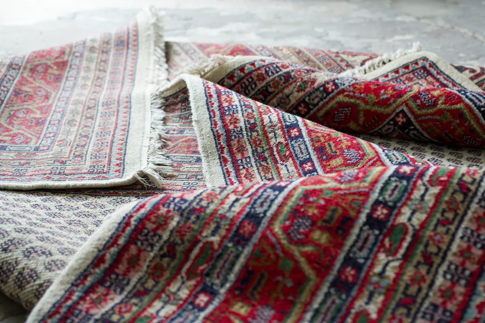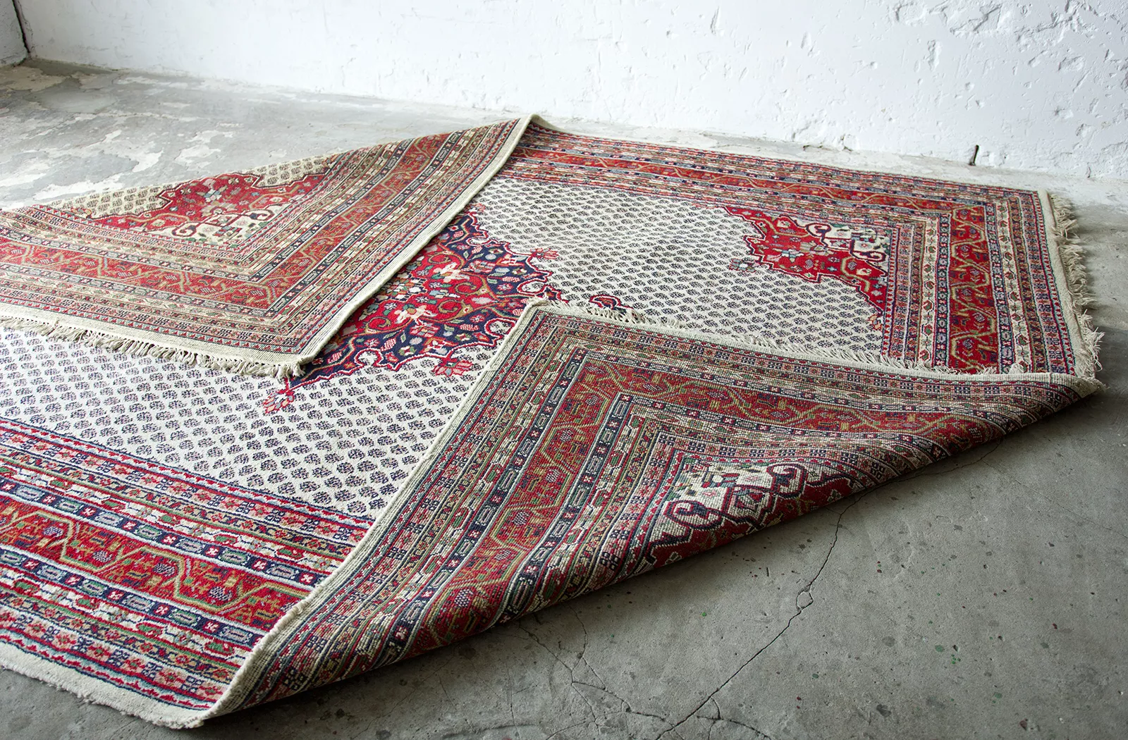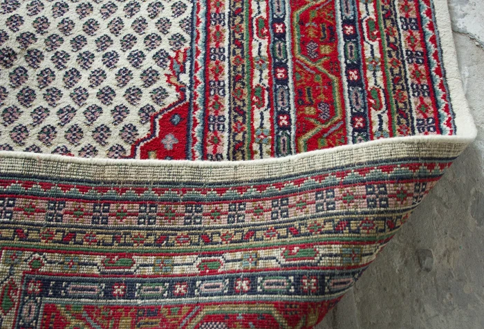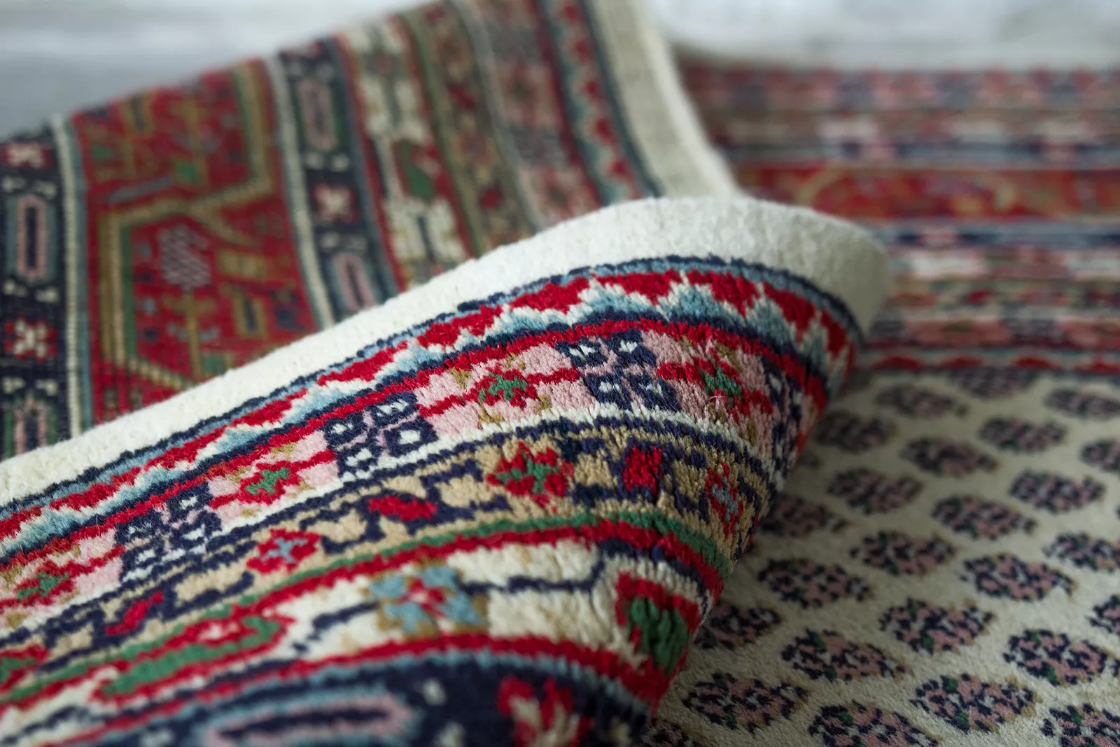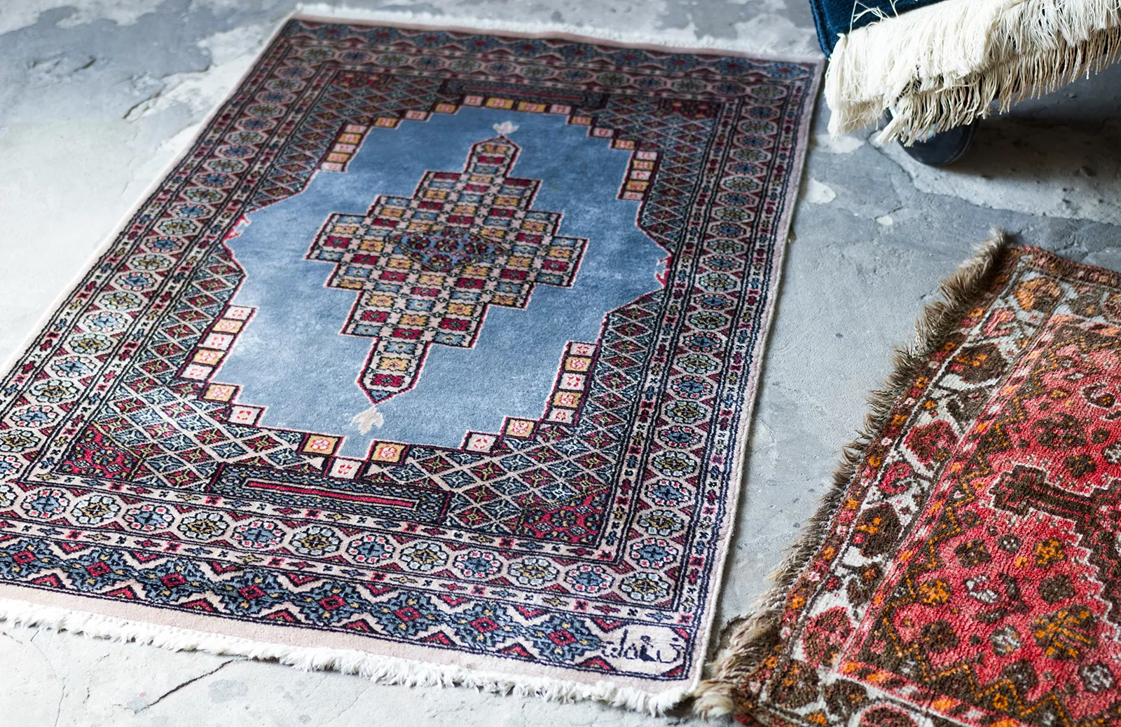 Oryginalne dywany vintage, tradycyjnie ręcznie tkane z naturalnej wełny. Niezwykle wytrzymałe i trwałe o żywej kolorystyce. W dwóch największych dywanach runo jest bardzo gęste i sprężyste, jednocześnie jest miękkie i ma naturalny połysk. Są bardzo grube i ciężki co świadczy o ich doskonałej jakości.