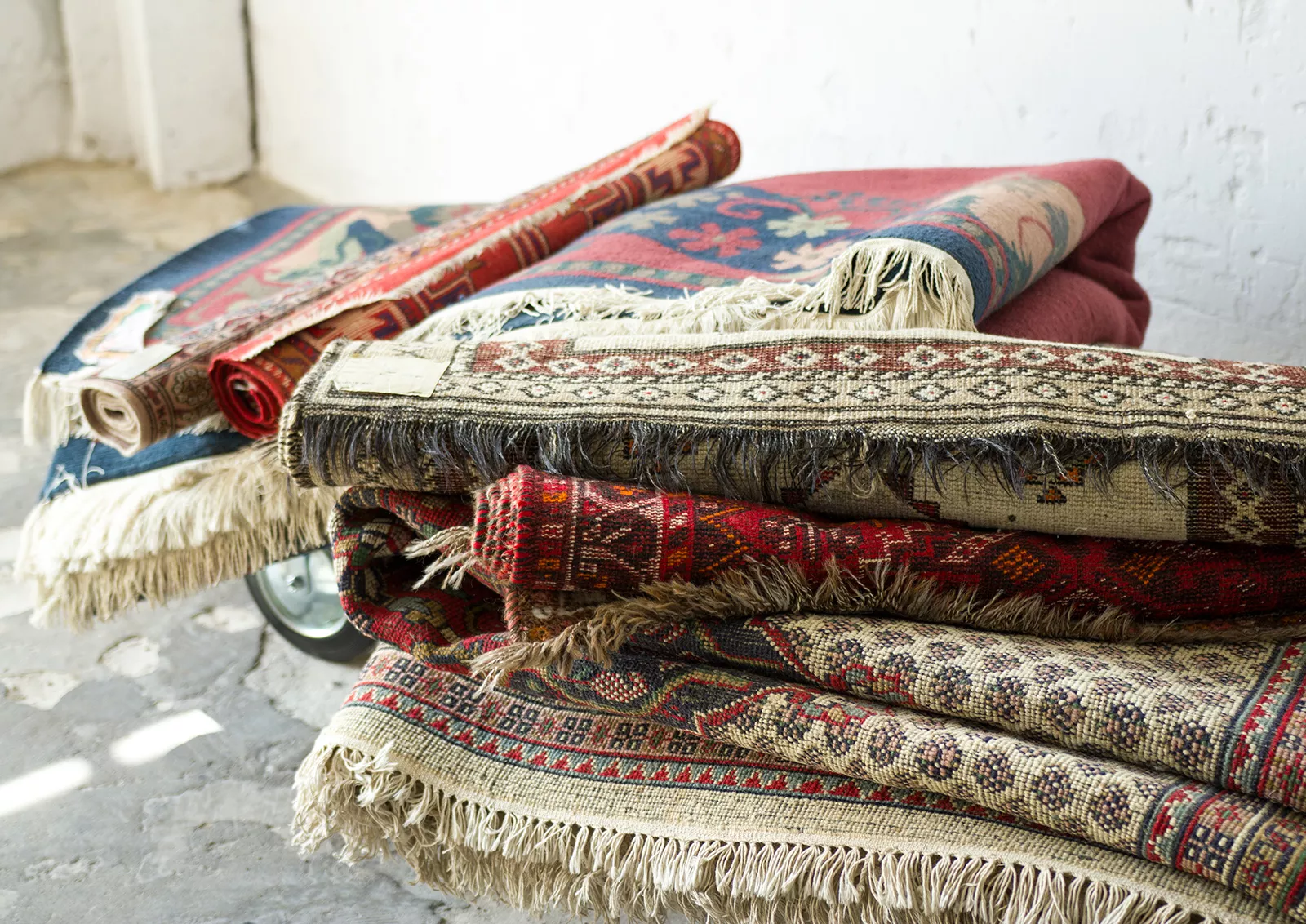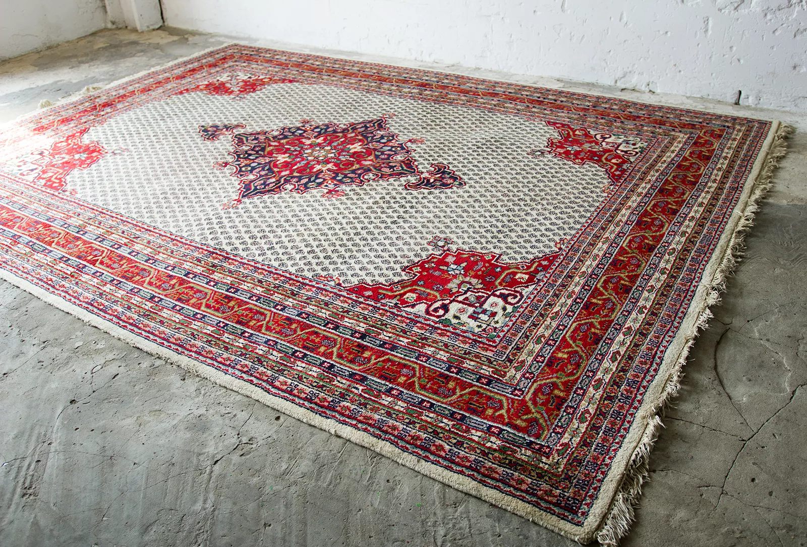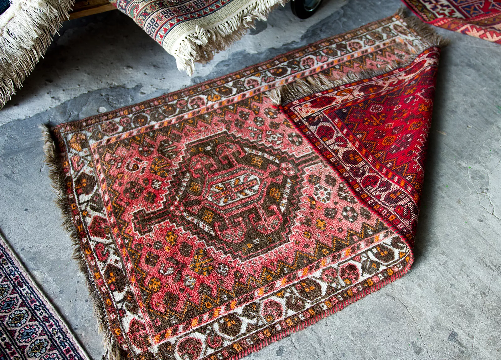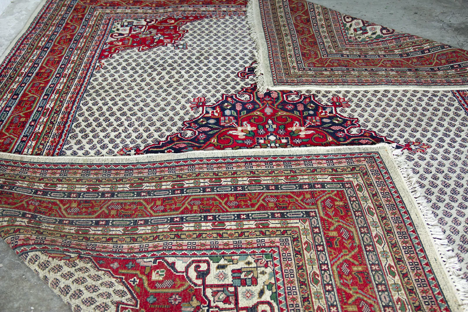 Oryginalne dywany vintage, tradycyjnie ręcznie tkane z naturalnej wełny. Niezwykle wytrzymałe i trwałe o żywej kolorystyce. W dwóch największych dywanach runo jest bardzo gęste i sprężyste, jednocześnie jest miękkie i ma naturalny połysk. Są bardzo grube i ciężki co świadczy o ich doskonałej jakości.