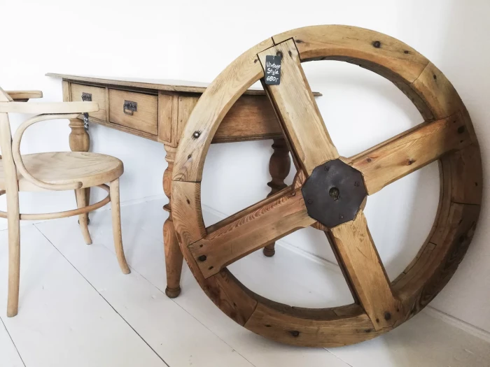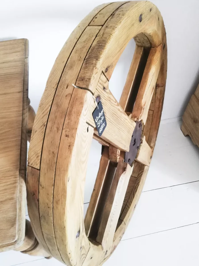 Ogromne koło pasowe które pochodzi ze starego młyna. Przedmiot jest oryginalny, całość zachowała się w bardzo dobrym stanie, na elementach metalowych przepiękna patyna z rdzy. Całość jest gotowa do użytku, nie ma zapachu stęchlizny ani nie jest zawilgocone. Świetny element dekoracyjny, jedyny i niepowtarzalny.