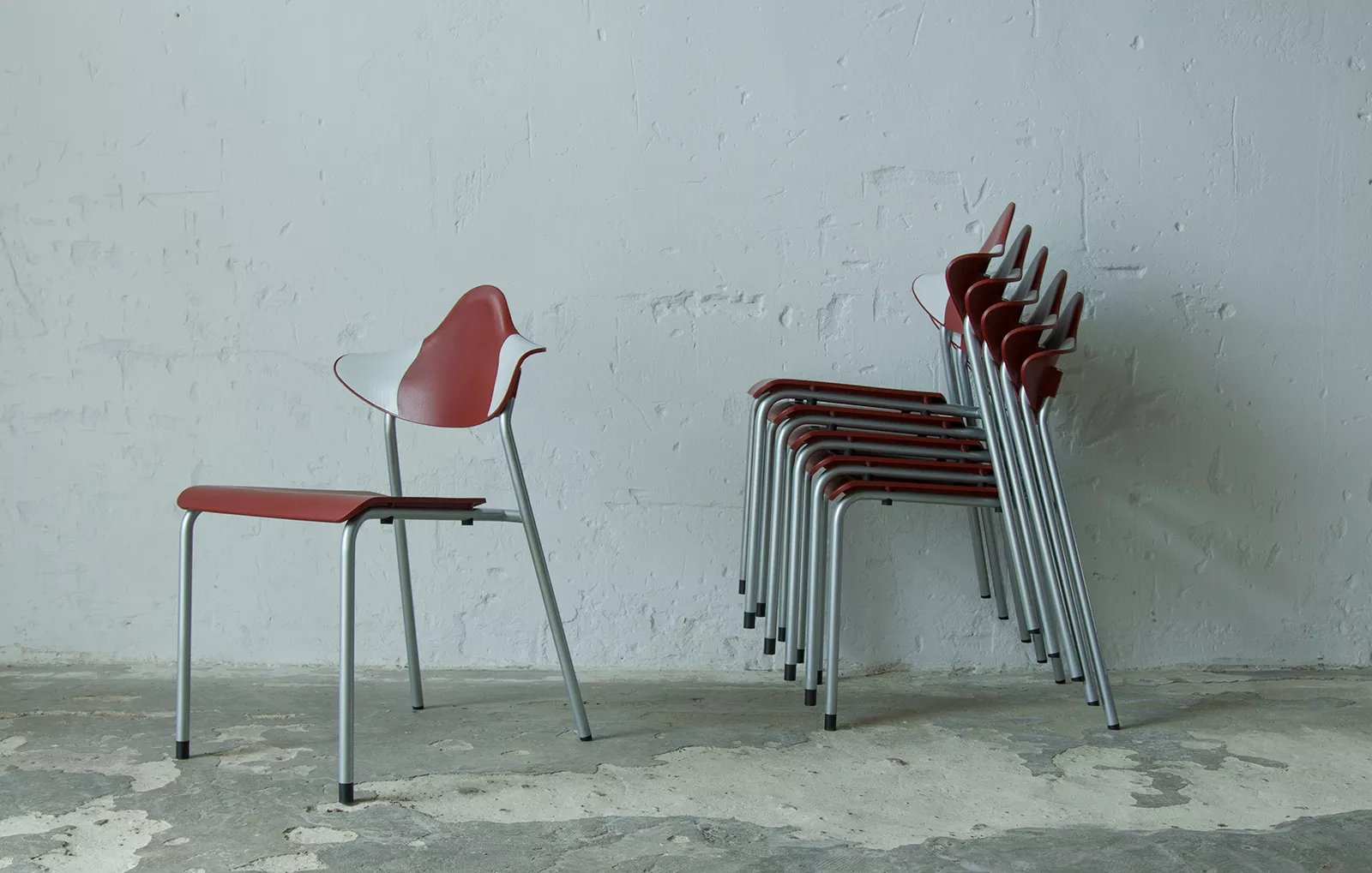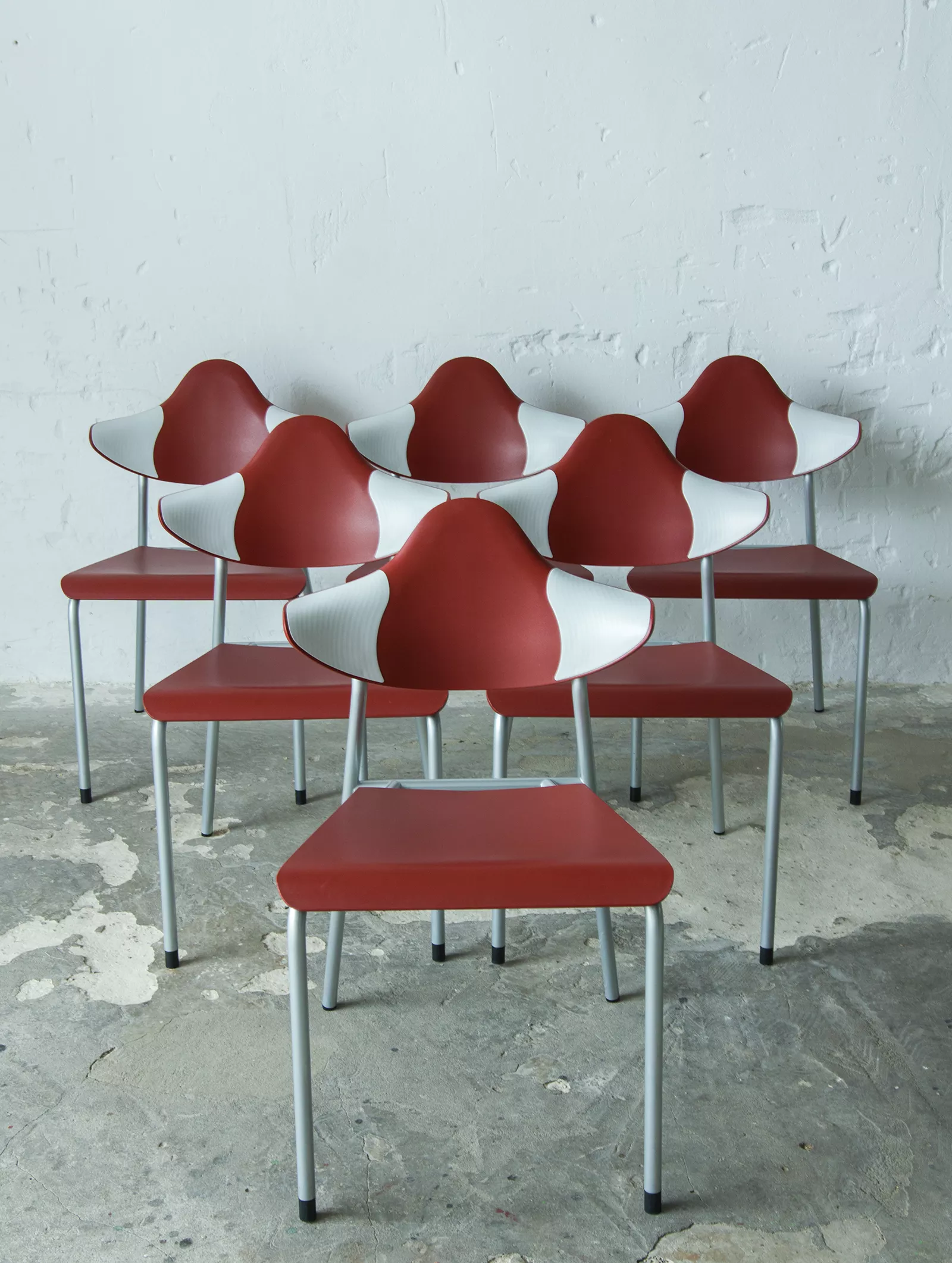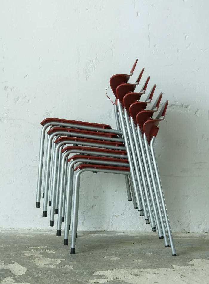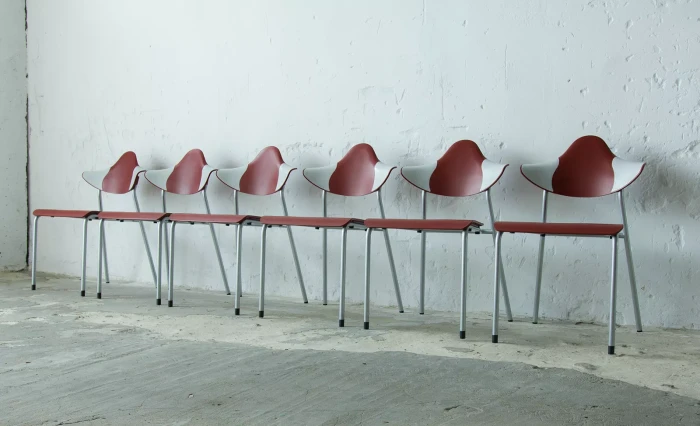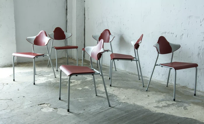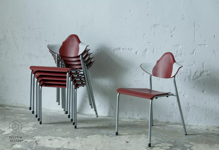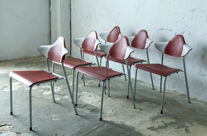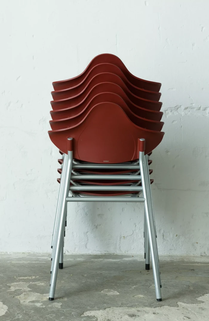 Zestaw sześciu sztaplowanych krzeseł firmy DRABERT ( PARLANDO ), jest to projekt z lat 90. Krzesła są dobrze zaprojektowane i bardzo wygodne, aby zapewnić większy komfort skrzydełka oparcia są elastyczne i wykonane z dwóch różnych materiałów, dodatkowo ich wyprofilowanie zapewnia dużą swobodę ruchu w okolicy łopatek. Zachowane są w bardzo dobrym stanie, jedynie posiadają delikatne zarysowania dolnych nóżek.