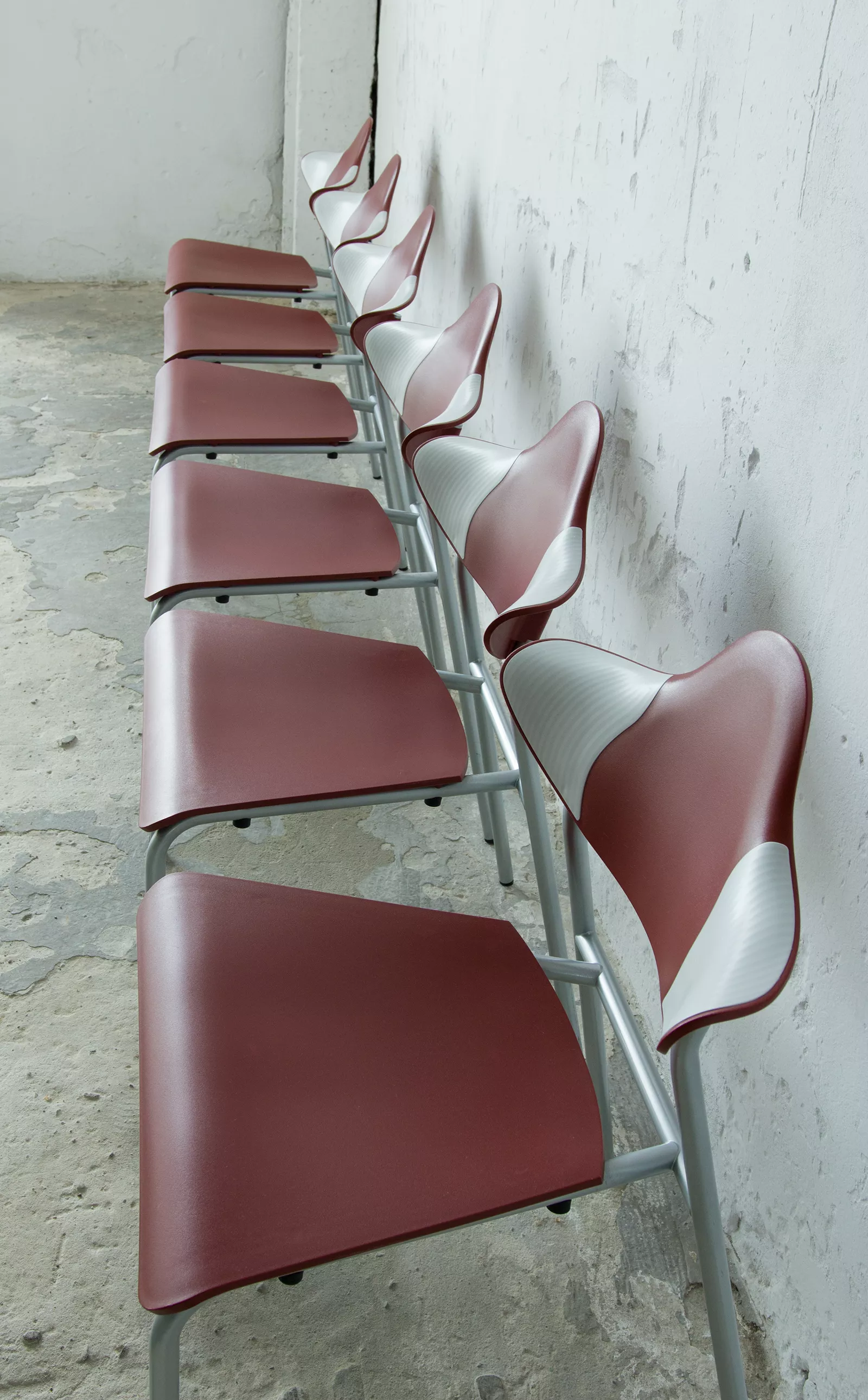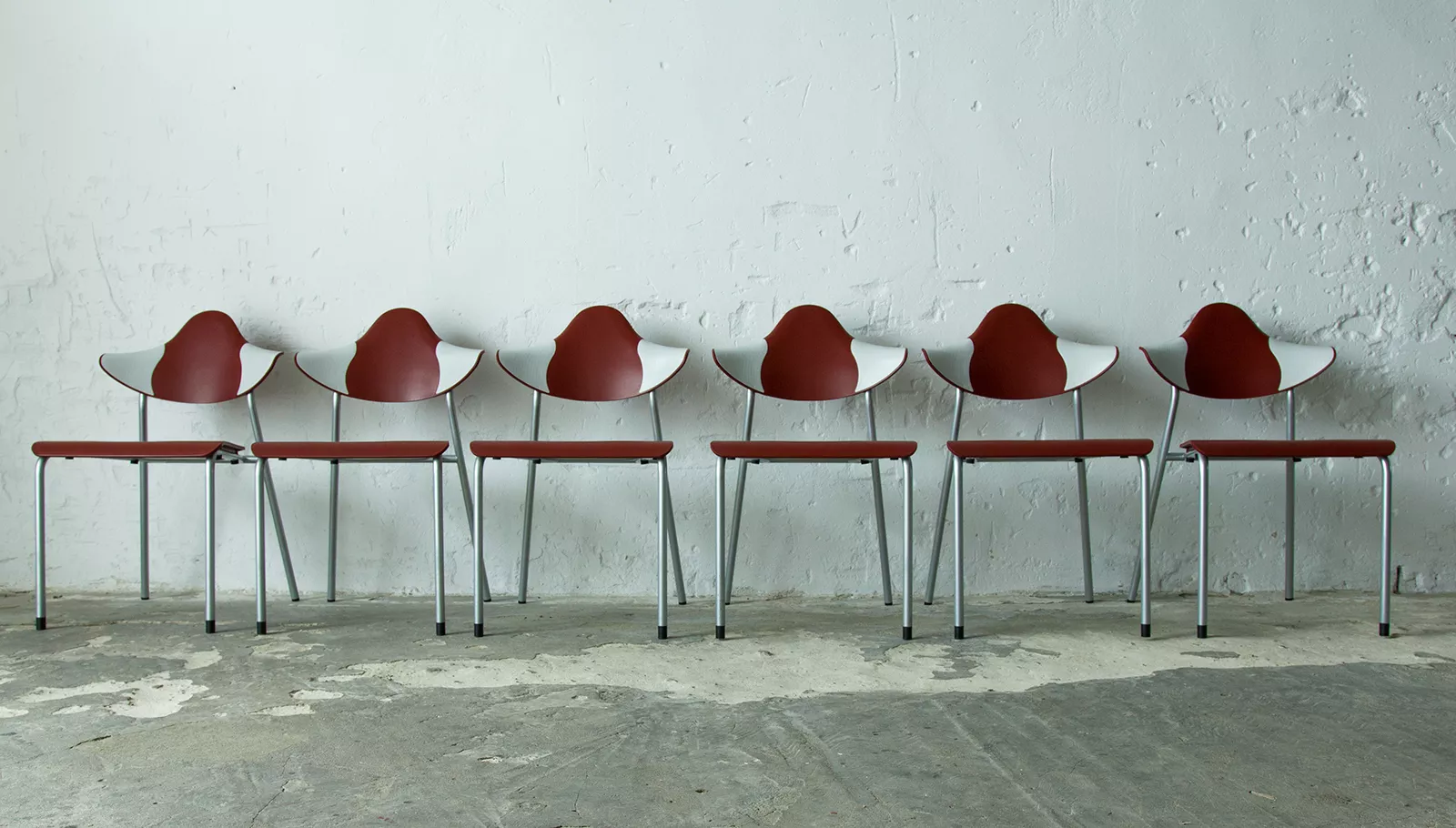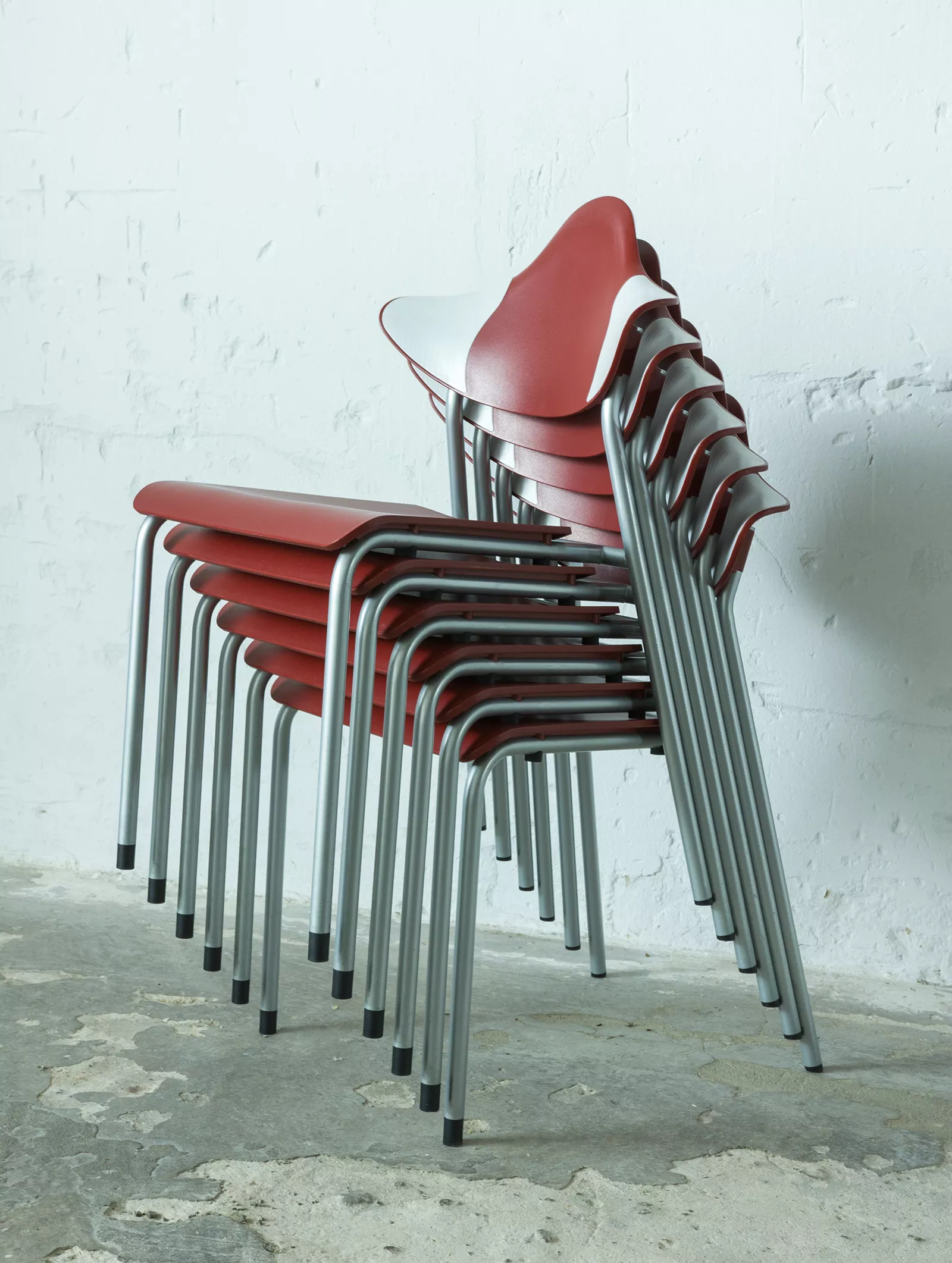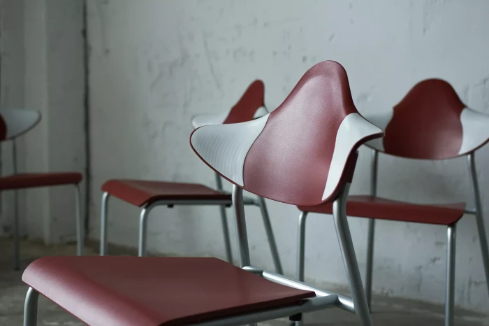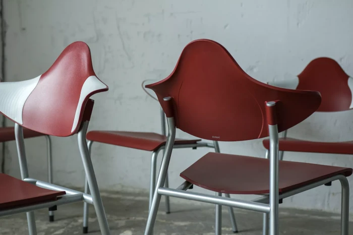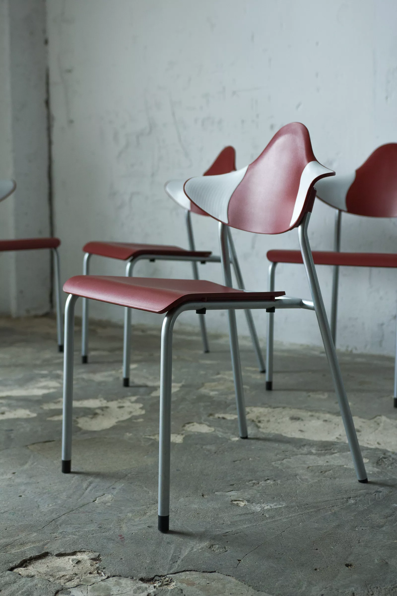 Zestaw sześciu sztaplowanych krzeseł firmy DRABERT ( PARLANDO ), jest to projekt z lat 90. Krzesła są dobrze zaprojektowane i bardzo wygodne, aby zapewnić większy komfort skrzydełka oparcia są elastyczne i wykonane z dwóch różnych materiałów, dodatkowo ich wyprofilowanie zapewnia dużą swobodę ruchu w okolicy łopatek. Zachowane są w bardzo dobrym stanie, jedynie posiadają delikatne zarysowania dolnych nóżek.