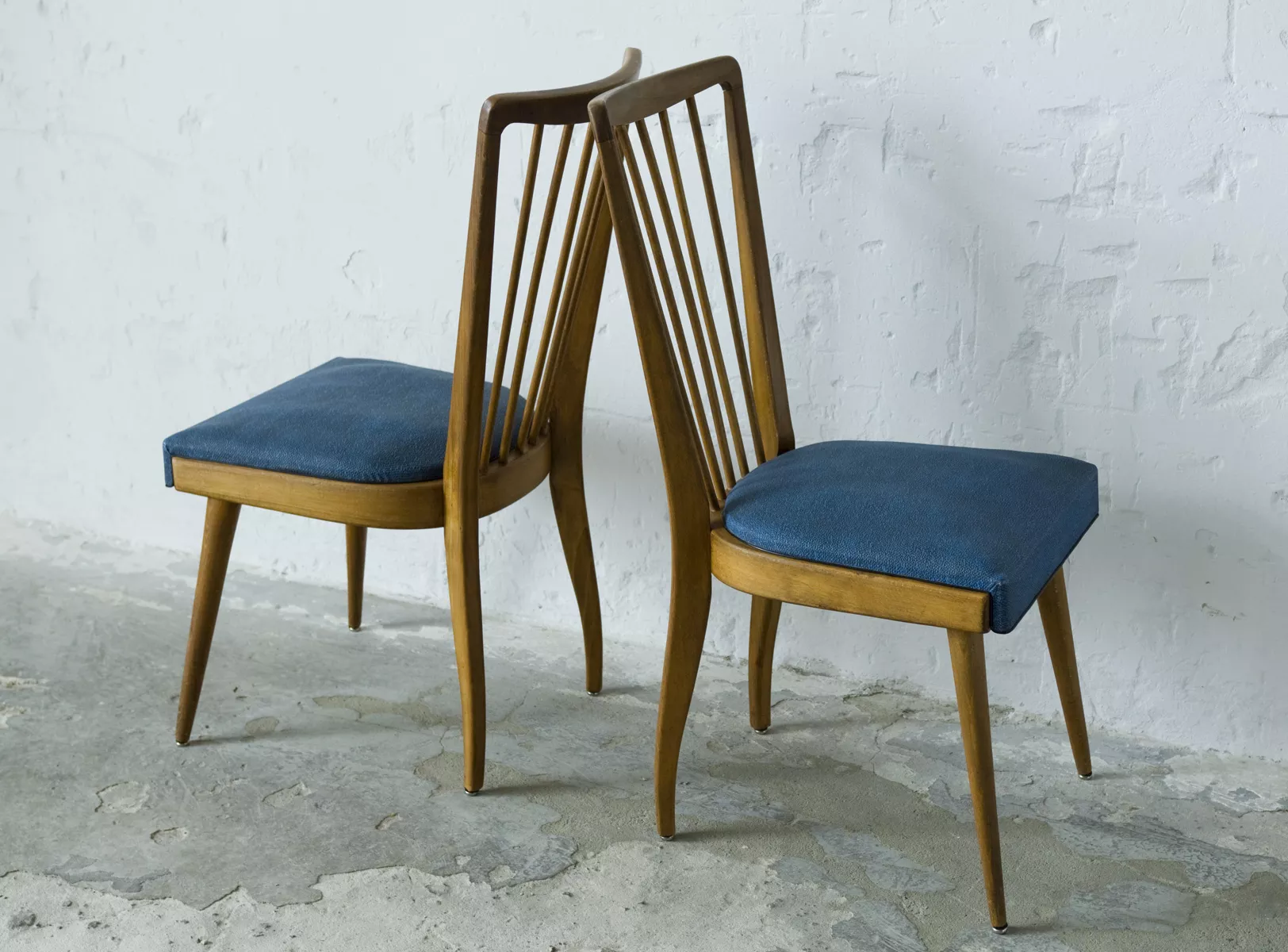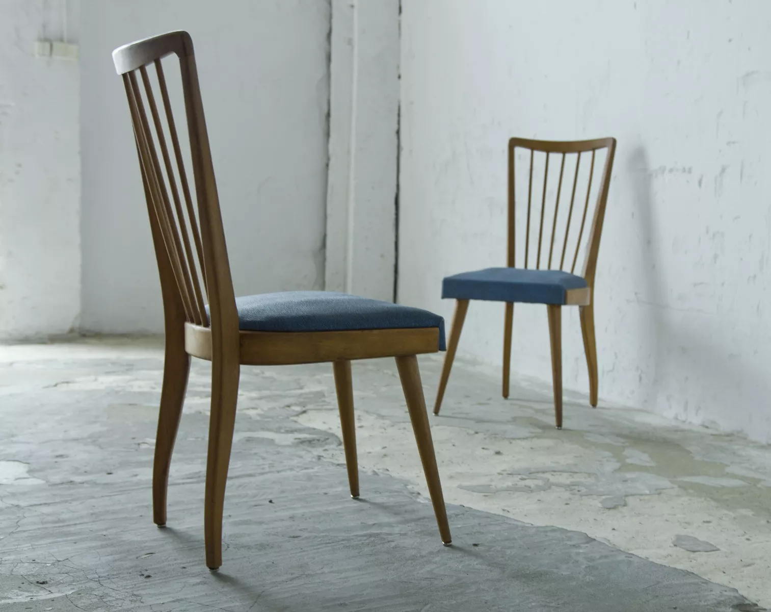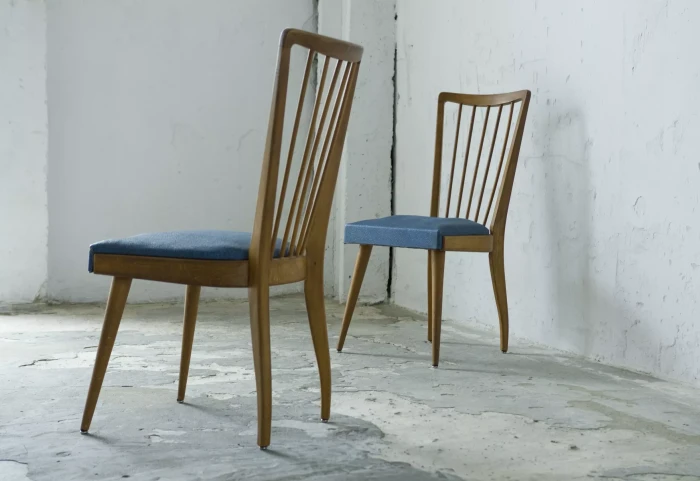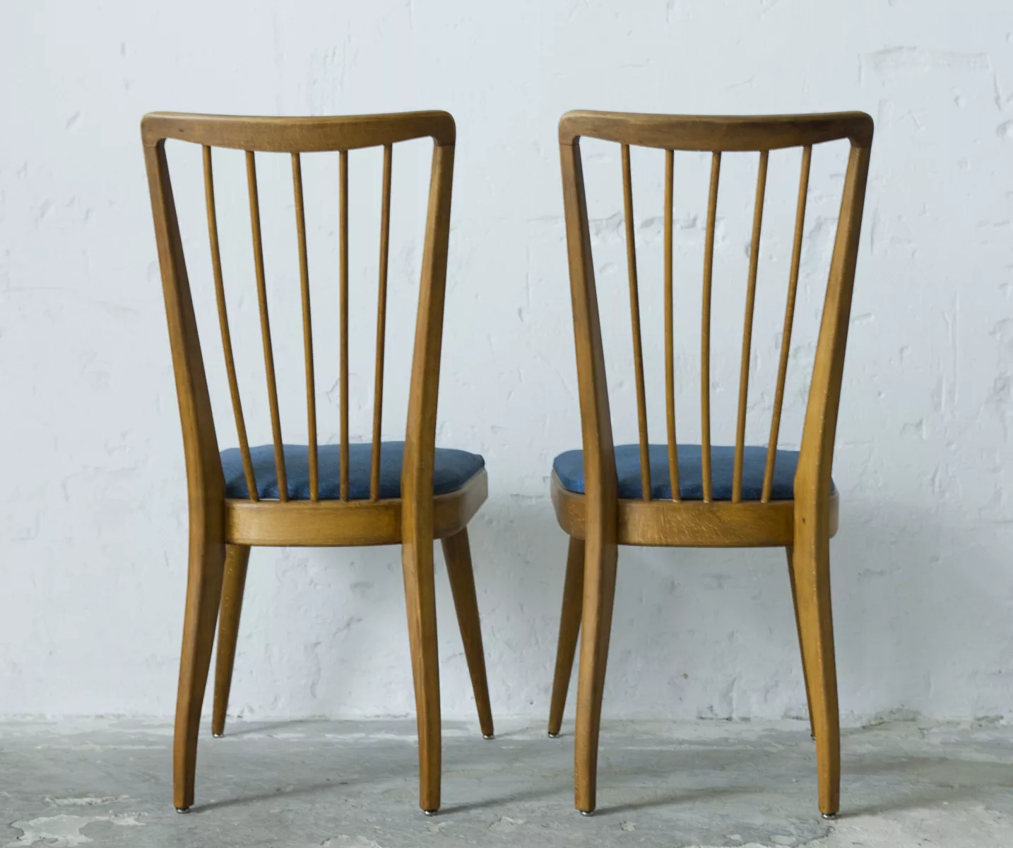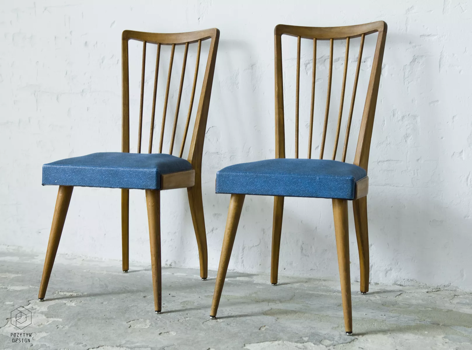 Krzesła o klasycznej formie z lat 50. Ponadczasowe i uniwersalne. Wykonane z drewna bukowego z miękkim tapicerowanym siedziskiem. Zachowane w oryginalnym i bardzo dobrym stanie vintage, bez śladów napraw/renowacji, posiadają normalne ślady użytkowania w postaci rysek, zadrapań i delikatnych wgnieceń. Tapicerka łatwa do wymiany w warunkach domowych.