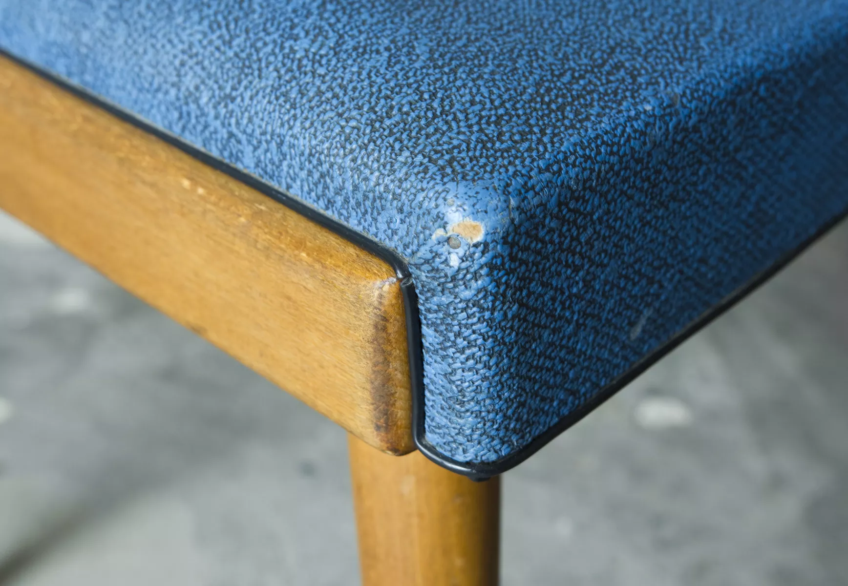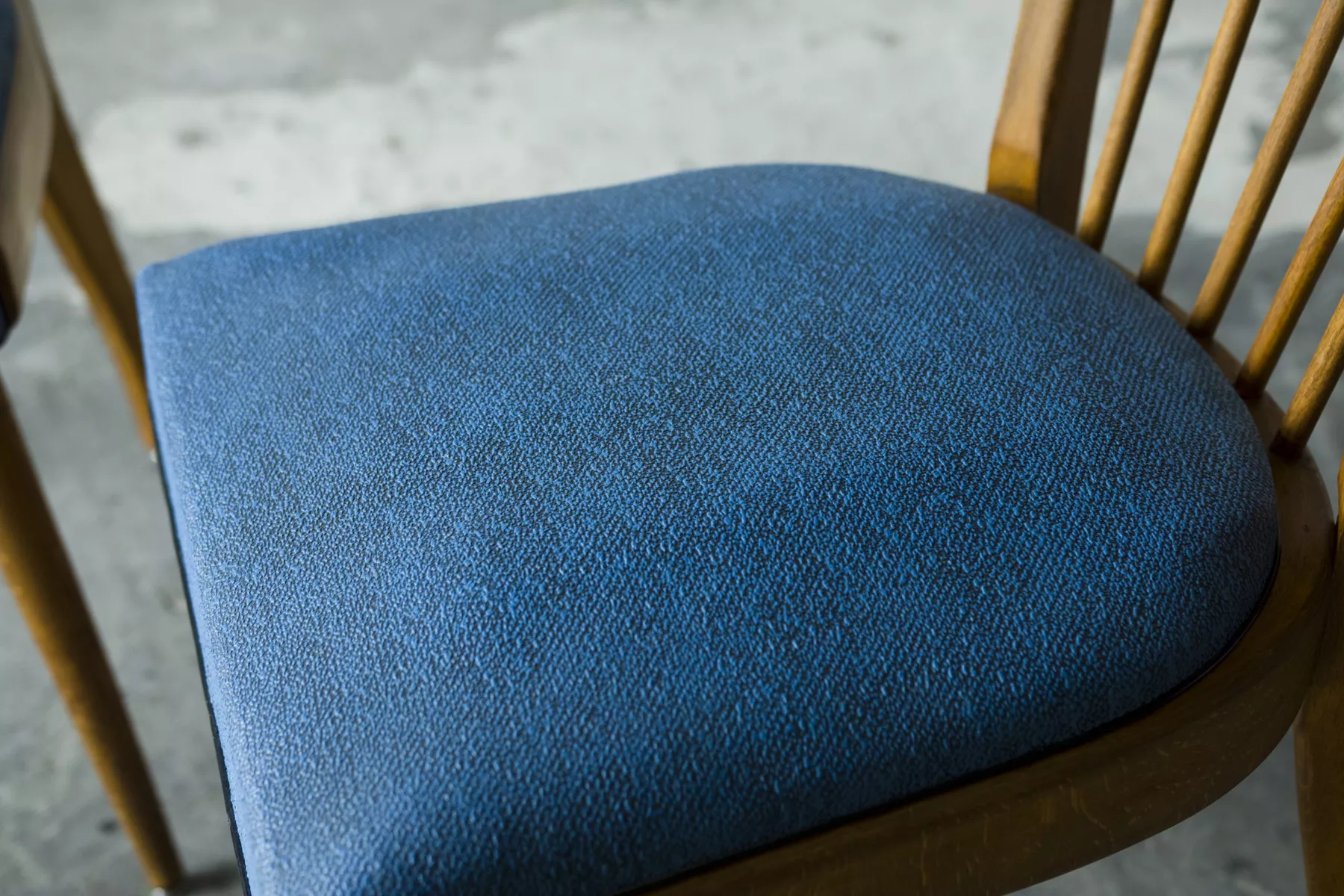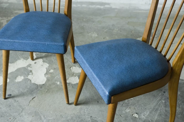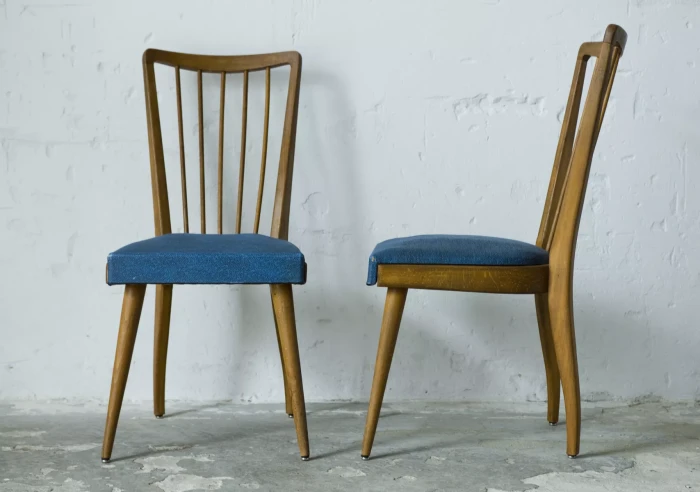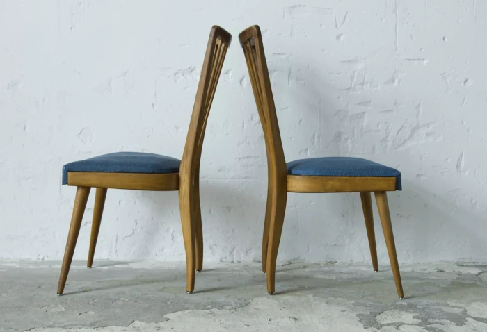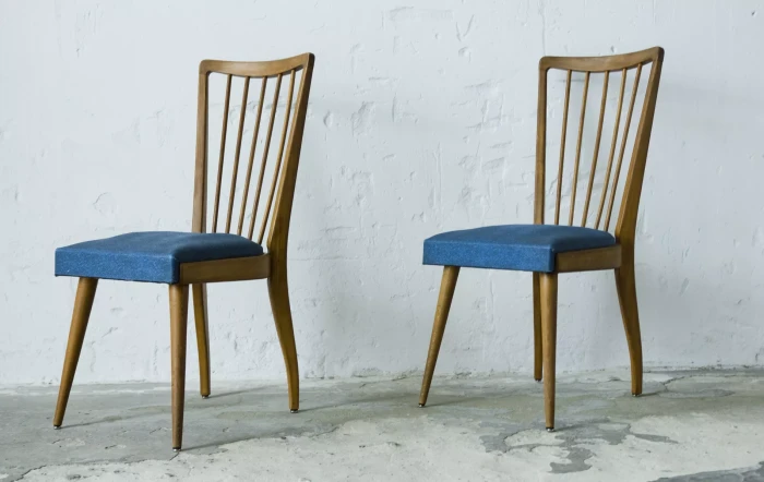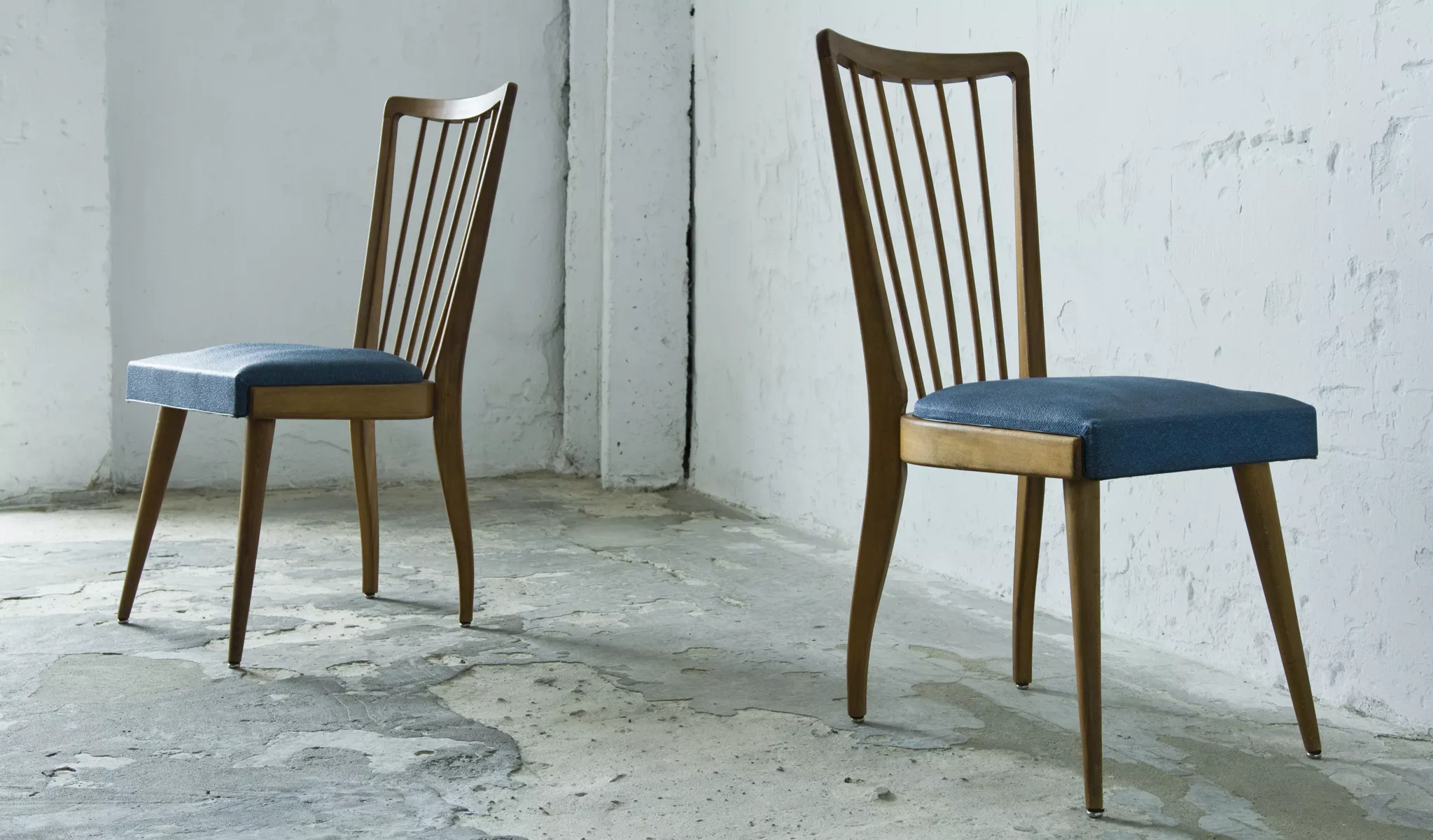 Krzesła o klasycznej formie z lat 50. Ponadczasowe i uniwersalne. Wykonane z drewna bukowego z miękkim tapicerowanym siedziskiem. Zachowane w oryginalnym i bardzo dobrym stanie vintage, bez śladów napraw/renowacji, posiadają normalne ślady użytkowania w postaci rysek, zadrapań i delikatnych wgnieceń. Tapicerka łatwa do wymiany w warunkach domowych.