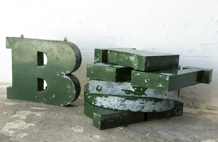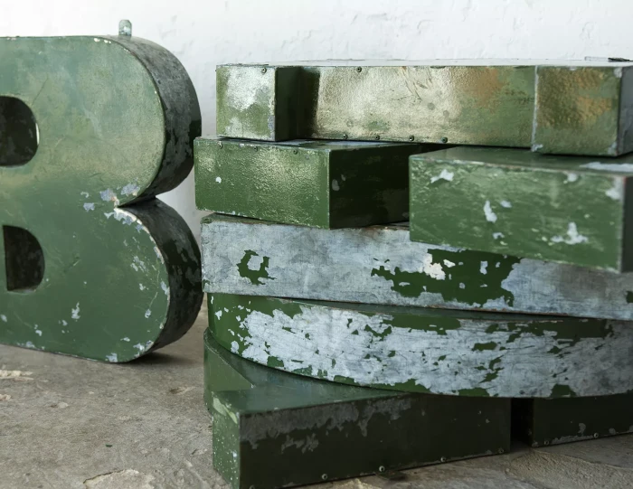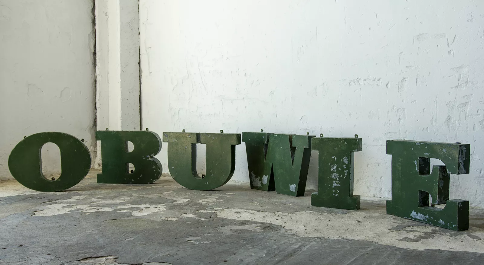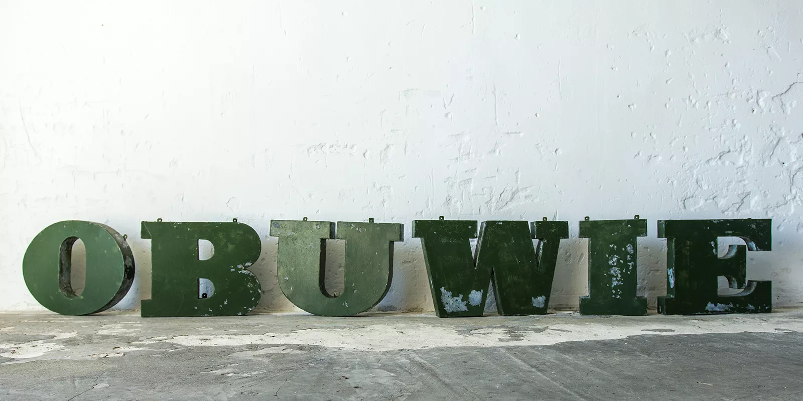 Stary szyld reklamowy (obuwie) z lat 70. składający się z 6 przestrzennych metalowych liter. Szyld zachowany jest w oryginalnym stanie Vintage, na całości pokryty mocno spatynowanym lakierem w przepięknym kolorze butelkowej zieleni. Litery wykonane są z blachy ocynkowanej łączonej nitami z uchwytami umożliwiającymi zawieszenie.