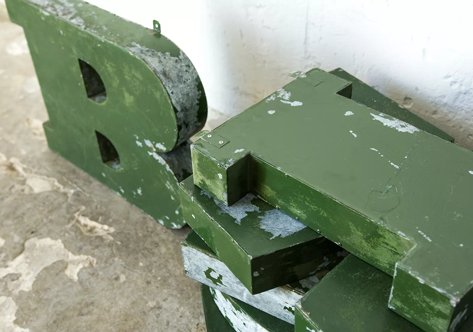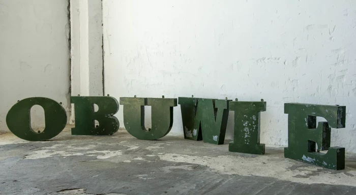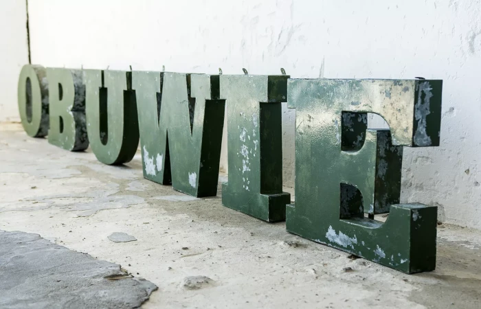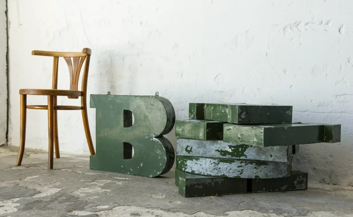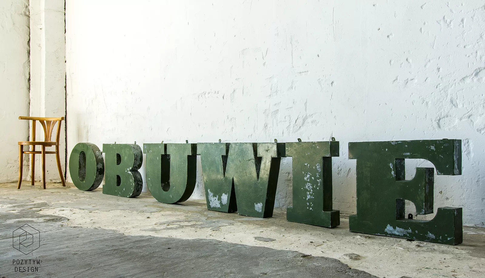 Stary szyld reklamowy (obuwie) z lat 70. składający się z 6 przestrzennych metalowych liter. Szyld zachowany jest w oryginalnym stanie Vintage, na całości pokryty mocno spatynowanym lakierem w przepięknym kolorze butelkowej zieleni. Litery wykonane są z blachy ocynkowanej łączonej nitami z uchwytami umożliwiającymi zawieszenie.