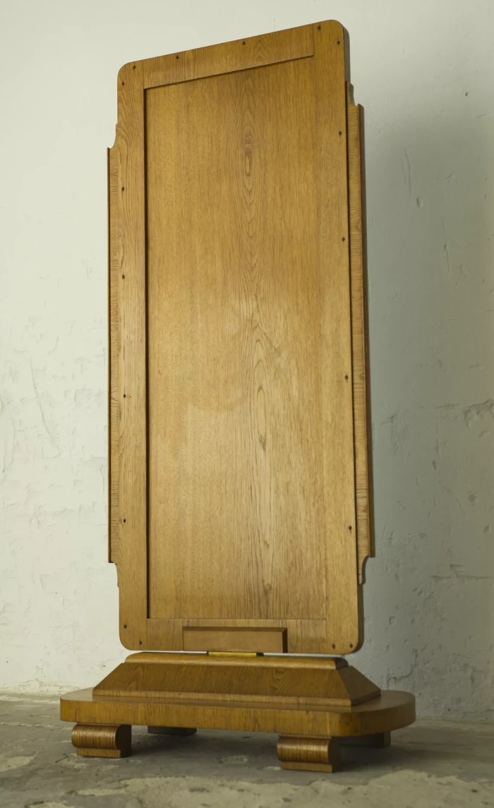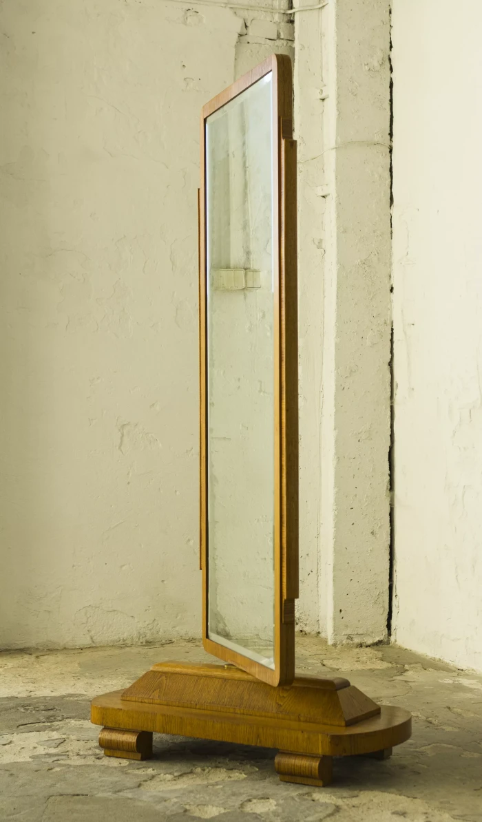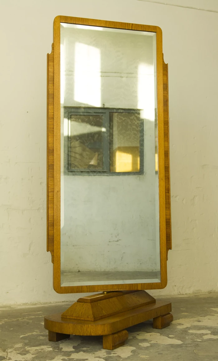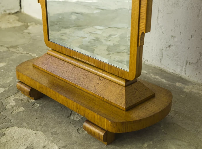 Obrotowe lustro w stylu ART DECO z lat 30. Jest to konstrukcja z drewna iglastego fornirowana jesionem, podstawa wsparta jest na konsolowych nogach z mosiężnym mechanizmem umożliwiającym obracanie lustra o 360 stopni. Tafla szkła jest fazowana z licznymi przydymieniami i skazami doskonale pasująca do charakteru lustra. Mebel jest w oryginalnym i dobrym stanie, posiada normalne ślady użytkowania, które zapisały się na drewnie w postaci rys, zadrapań i delikatnych wgnieceń, ale te wszystkie niedoskonałości nadają mu charakteru i świadczą o oryginalności i niepowtarzalności.