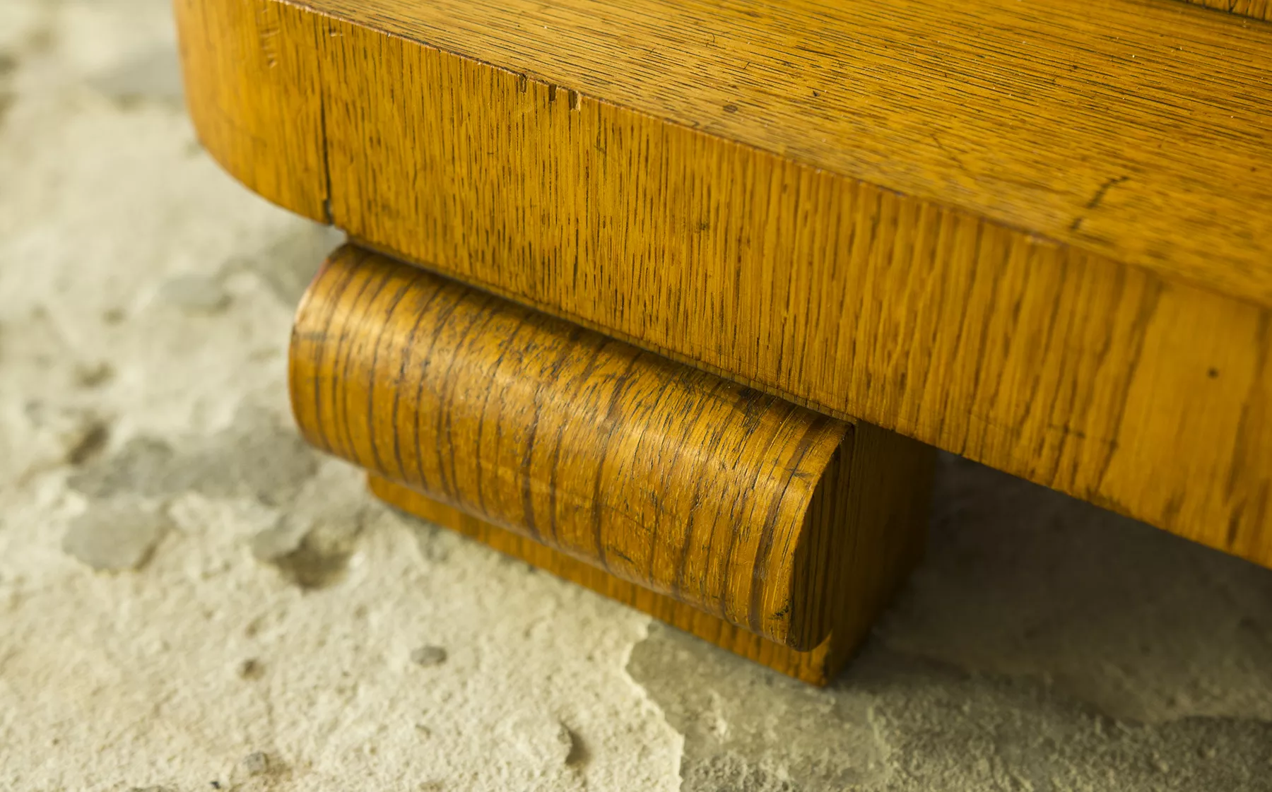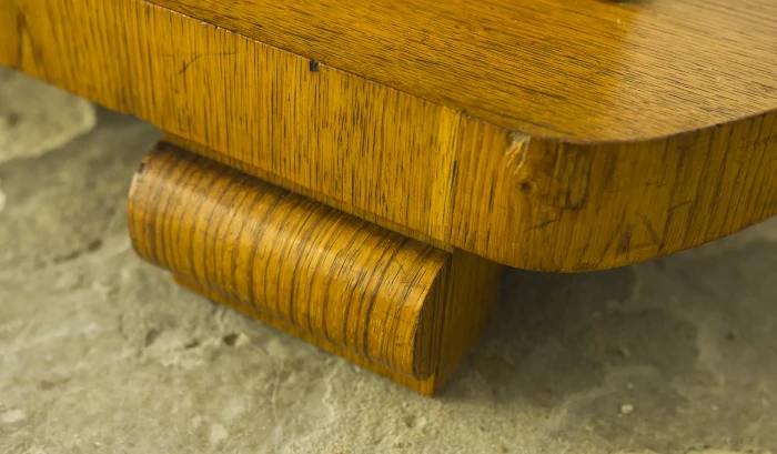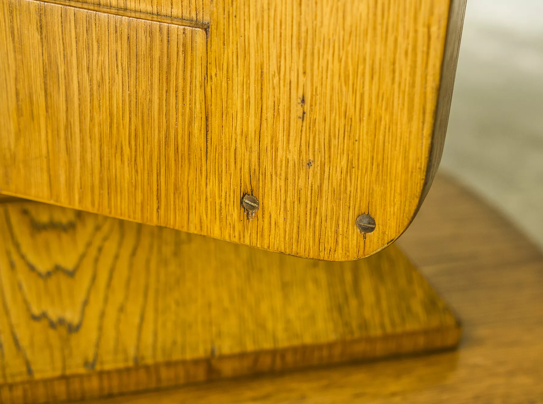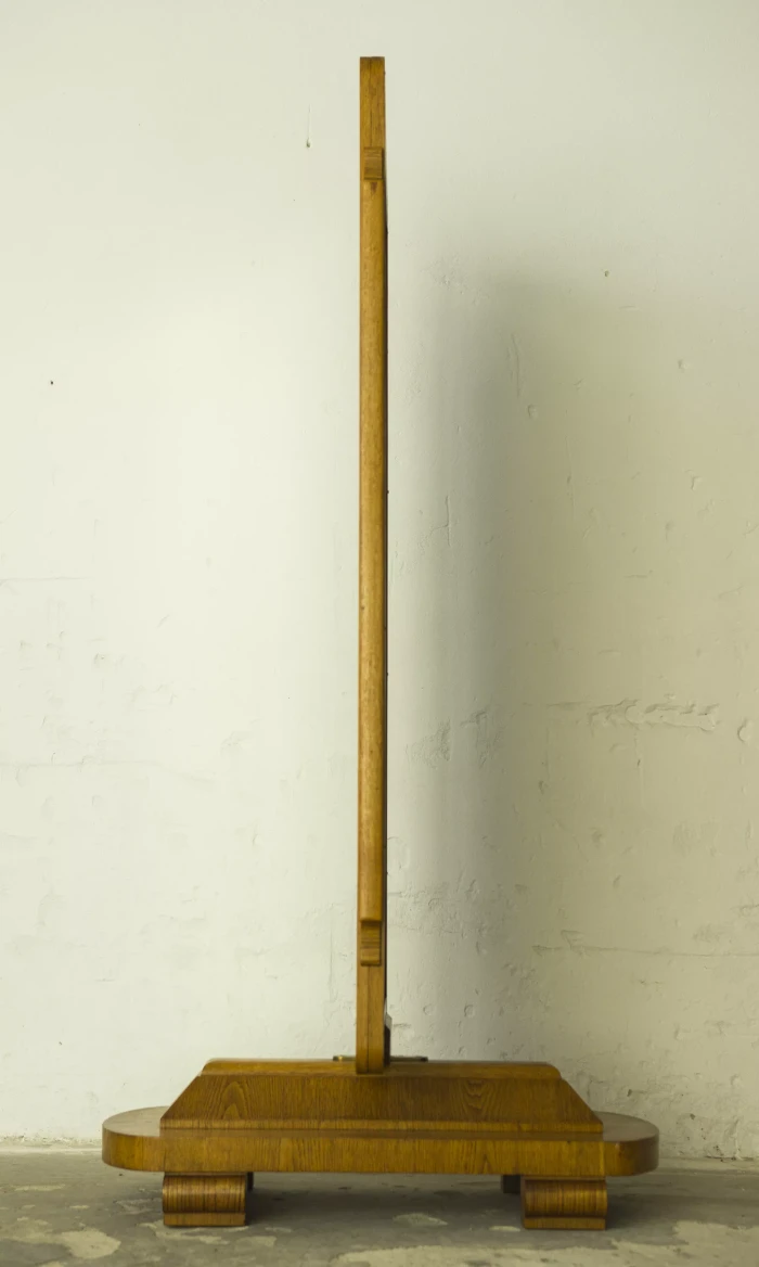 Obrotowe lustro w stylu ART DECO z lat 30. Jest to konstrukcja z drewna iglastego fornirowana jesionem, podstawa wsparta jest na konsolowych nogach z mosiężnym mechanizmem umożliwiającym obracanie lustra o 360 stopni. Tafla szkła jest fazowana z licznymi przydymieniami i skazami doskonale pasująca do charakteru lustra. Mebel jest w oryginalnym i dobrym stanie, posiada normalne ślady użytkowania, które zapisały się na drewnie w postaci rys, zadrapań i delikatnych wgnieceń, ale te wszystkie niedoskonałości nadają mu charakteru i świadczą o oryginalności i niepowtarzalności.
