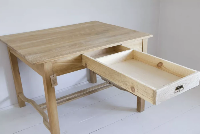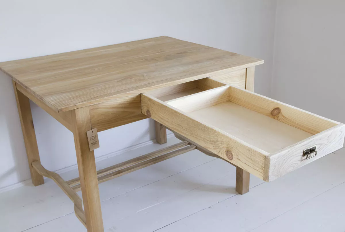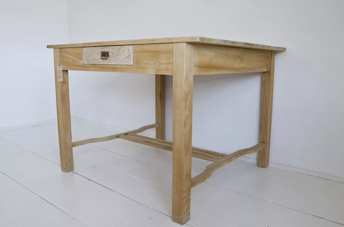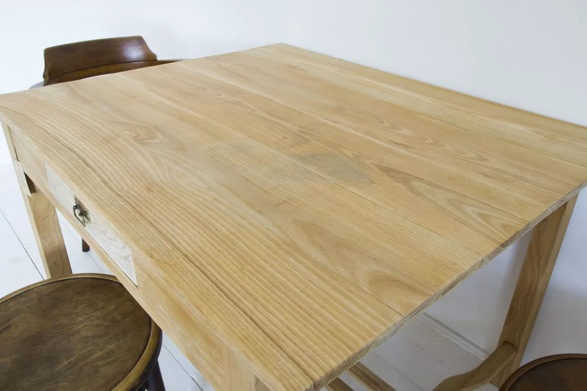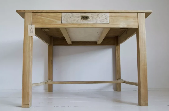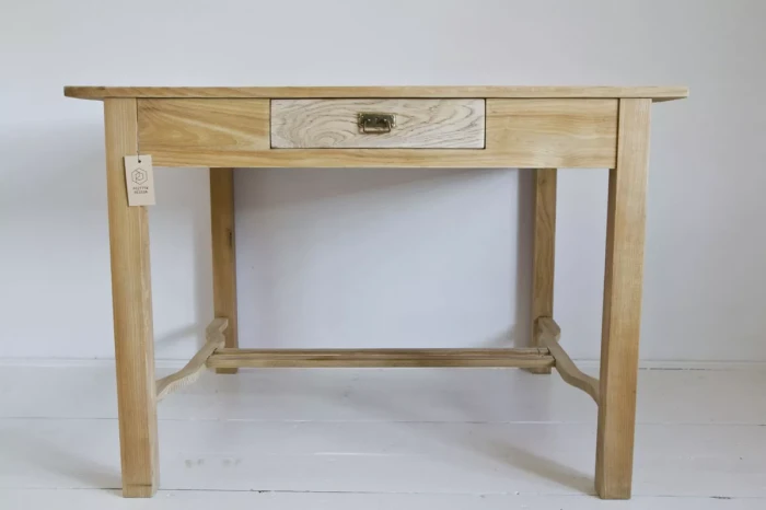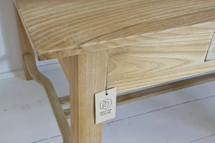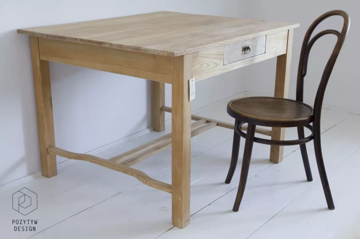 Oryginalne stare polskie biurko o prostej formie. Mebel wykonany jest z drewna jesionowego z przepięknym usłojeniem które zachowało się w bardzo dobrym stanie. Całość po delikatnych naprawach, zostały wymienione prowadnice i boki szuflady, drewno oczyszczone ze starych powłok bez zawilgocenia i nieprzyjemnych zapachów.