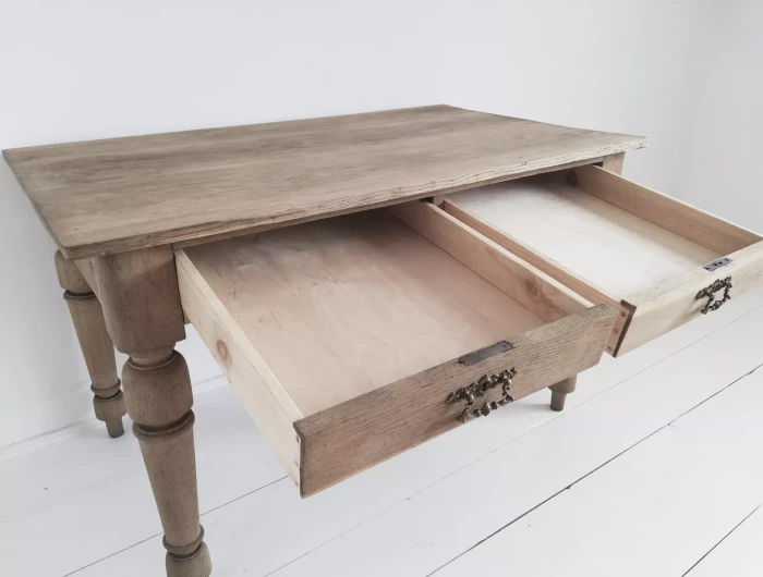 Stary dębowy stół który idealnie nadaje się jako biurko. Jest to polski mebel z duszą który ma swoją historie, został oczyszczony ze starej politury do surowego drewna co ujawniło przepiękne usłojenie. Całość jest bardzo stabilna, wszystko zostało rozkołkowane i złożone na nowo, wymienione spody szuflady i prowadnice.