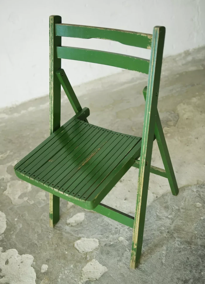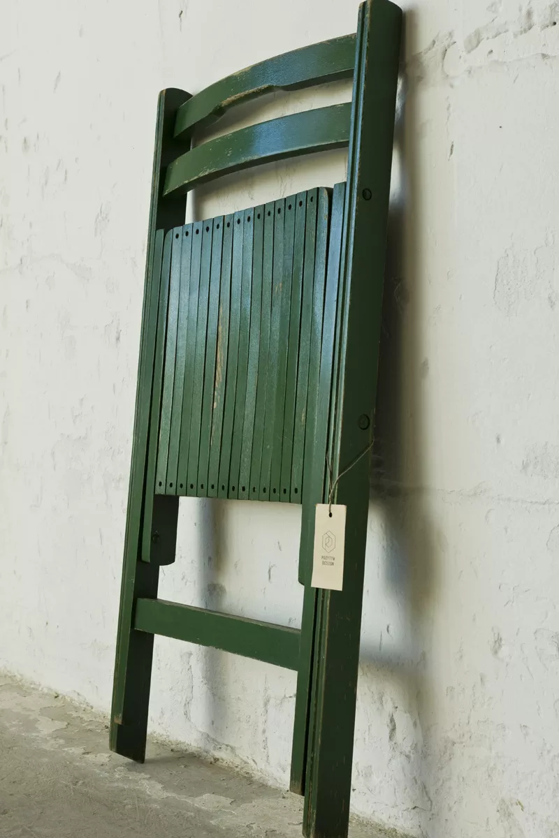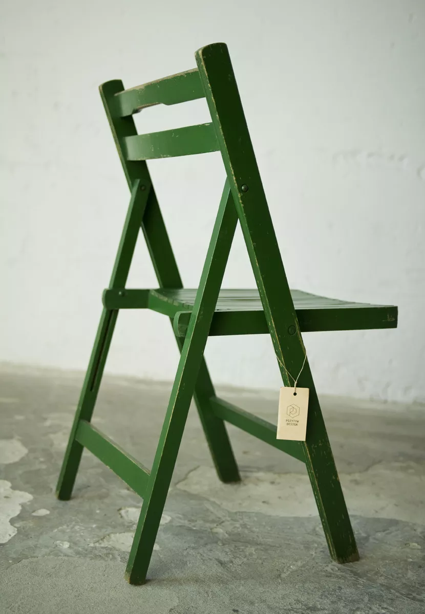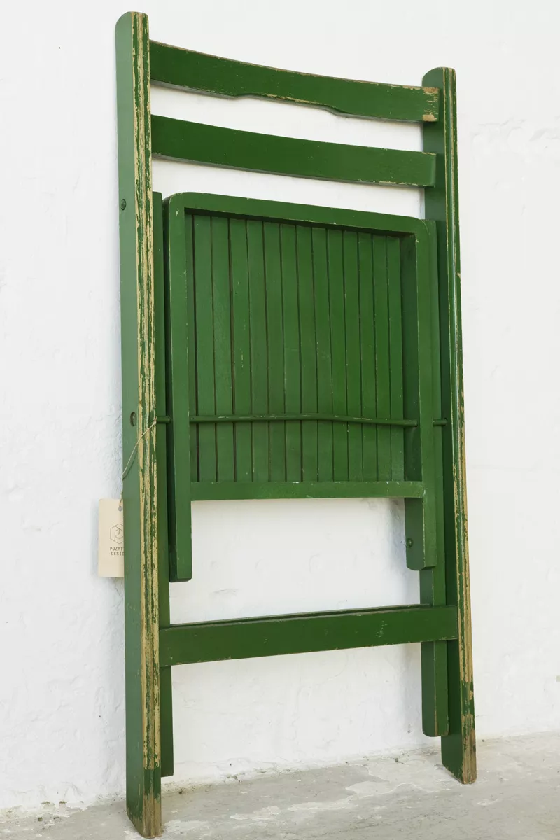 Składane drewniane krzesło z lat 60. Praktyczne i zajmujące niewiele miejsca o prostej i ponadczasowej formie. Konstrukcja wykonana jest z drewna bukowego. Krzesło jest w oryginalnym stanie vintage, posiada normalne ślady użytkowania w postaci rysek, zadrapań i delikatnych wgnieceń.