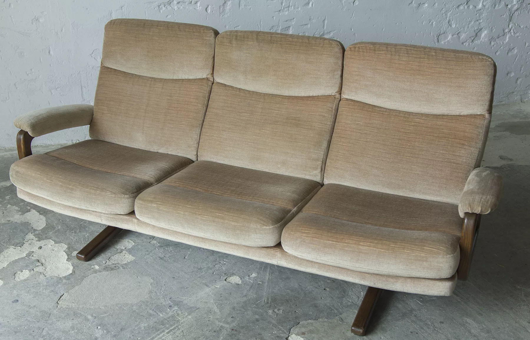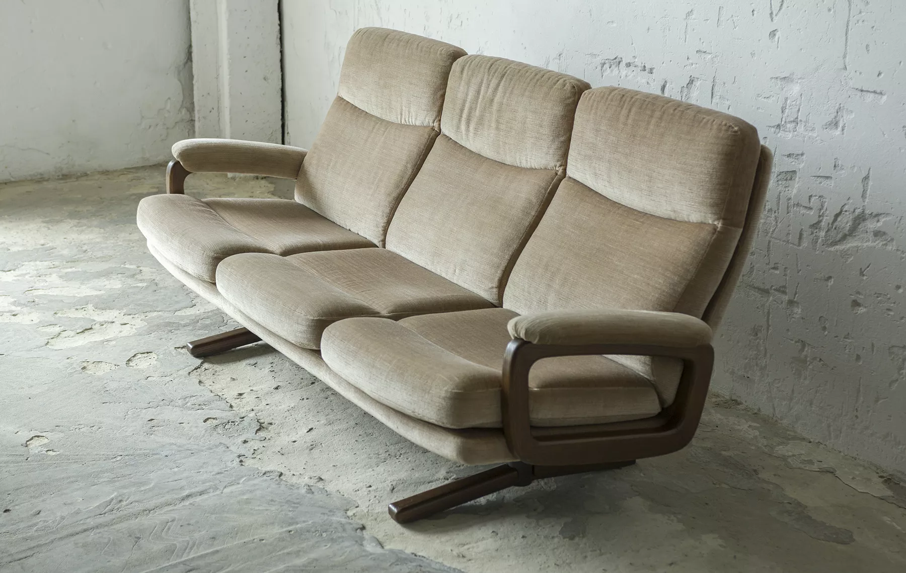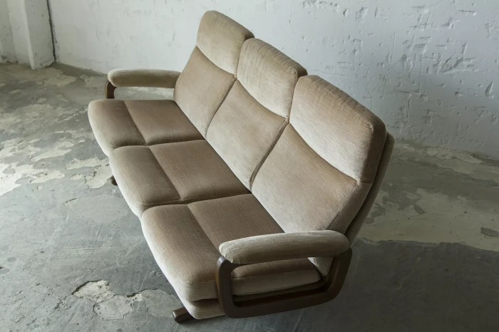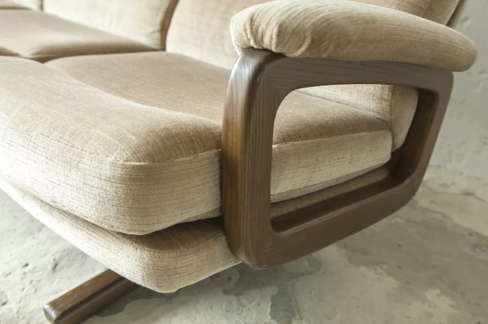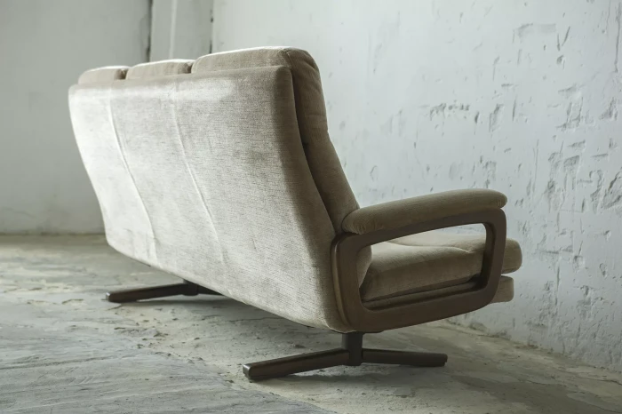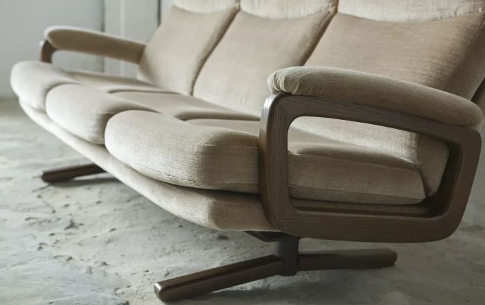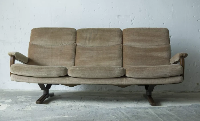 Ten model sofy trzyosobowej zaprojektowany został przez André Vandenbeucka dla szwajcarskiego producenta Strässle w latach 60. Jest kultowym klasykiem, ikoną światowego designu. Mebel zachowany jest w oryginalnym i bardzo dobrym stanie, materiałowa sztruksowa tapicerka jest bez dziur i przetarć. Sofa ma ciekawy kształt nawiązujący do stylu skandynawskiego. Osadzano jest na smukłych nóżkach co nadaje jej lekkiego wyglądu, jest stabilna i bardzo wygodna.