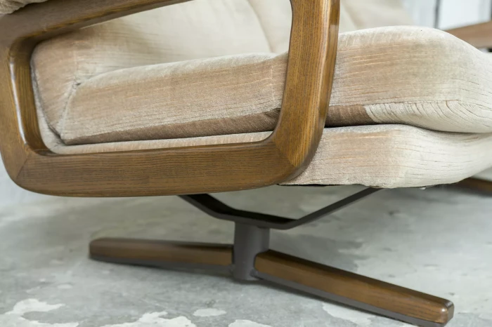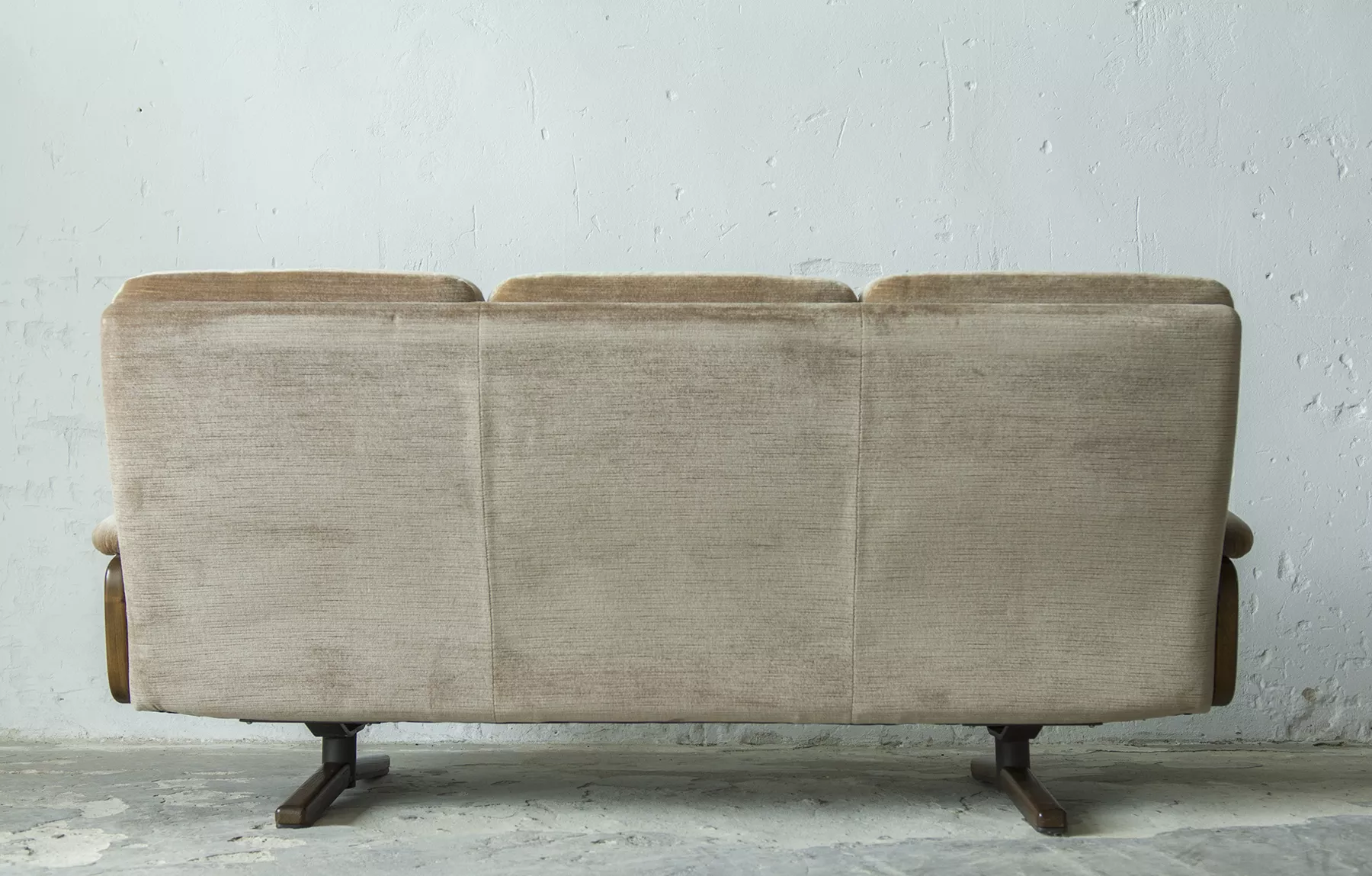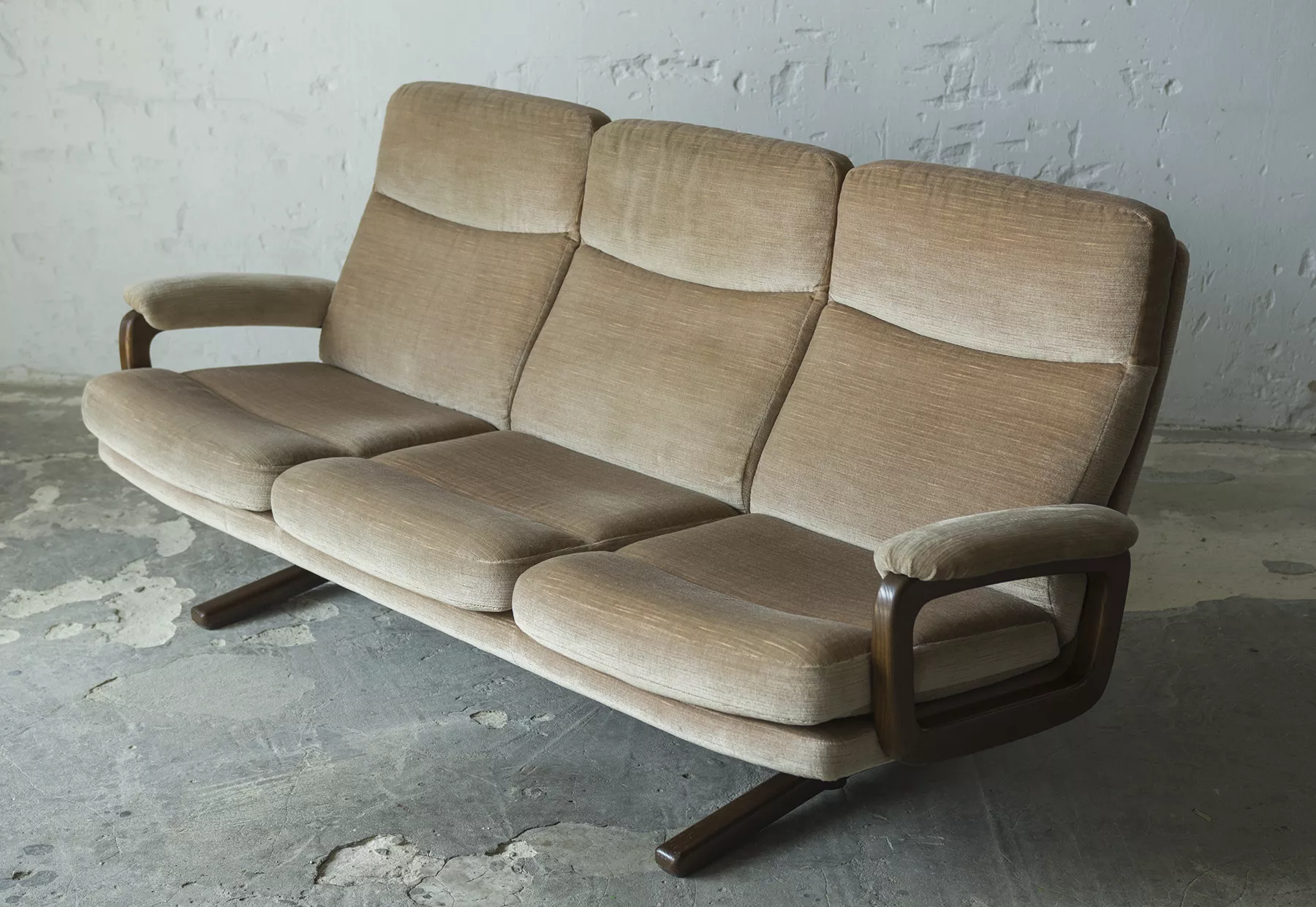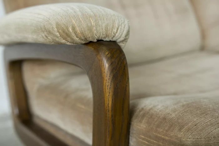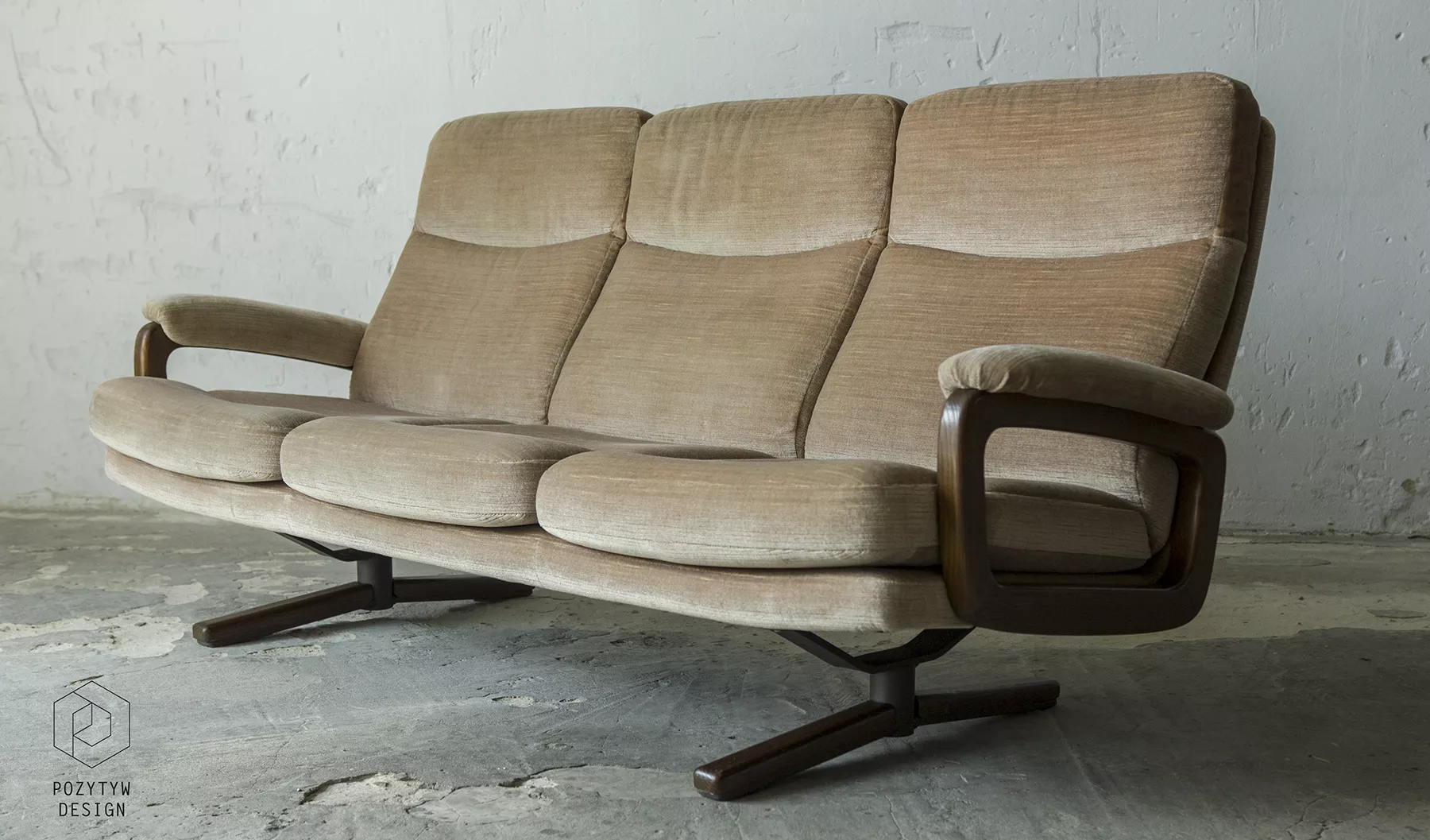 Ten model sofy trzyosobowej zaprojektowany został przez André Vandenbeucka dla szwajcarskiego producenta Strässle w latach 60. Jest kultowym klasykiem, ikoną światowego designu. Mebel zachowany jest w oryginalnym i bardzo dobrym stanie, materiałowa sztruksowa tapicerka jest bez dziur i przetarć. Sofa ma ciekawy kształt nawiązujący do stylu skandynawskiego. Osadzano jest na smukłych nóżkach co nadaje jej lekkiego wyglądu, jest stabilna i bardzo wygodna.