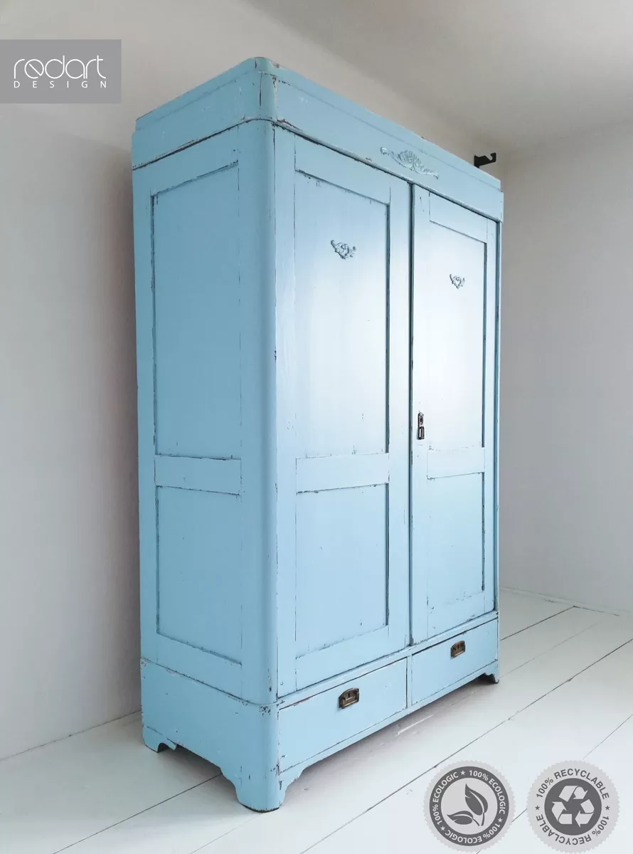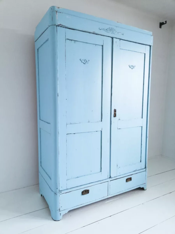 też dwie pojemne szuflady. Z zewnątrz wykończenie w stylu vintage w błękitnym kolorze z delikatnymi przecierkami. Mebel bez zawilgocenia i nieprzyjemnych zapachów, gotowa do użytku.