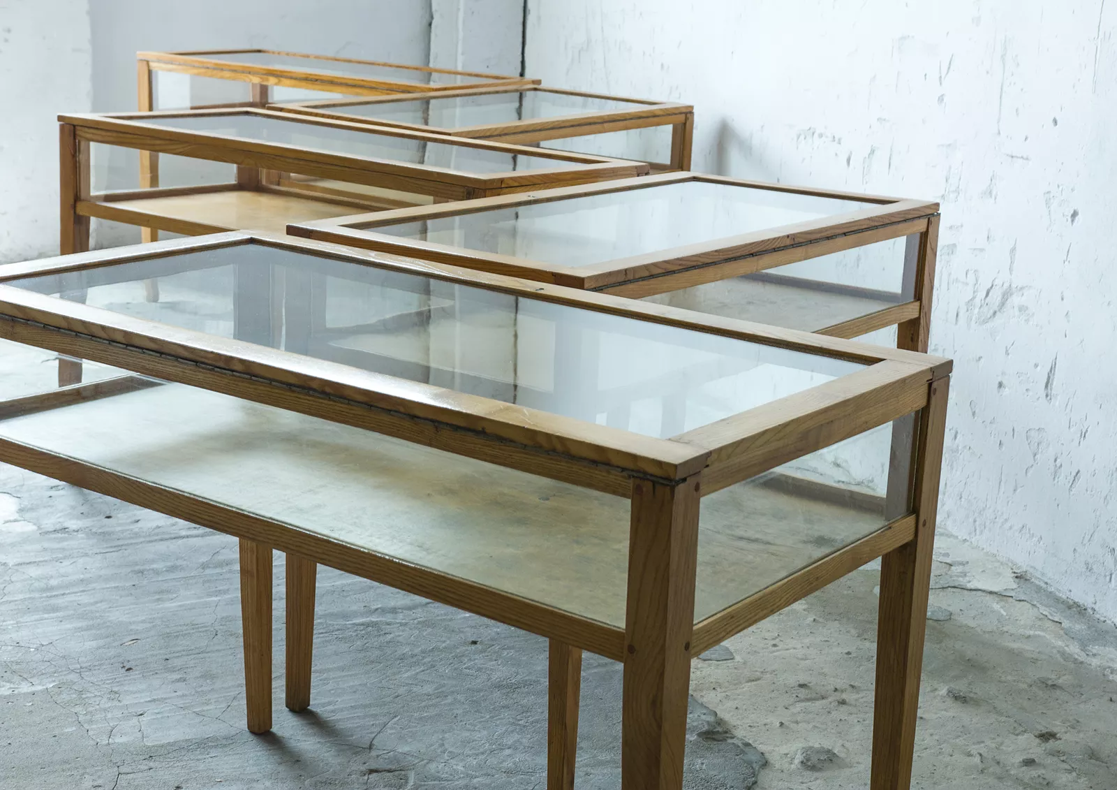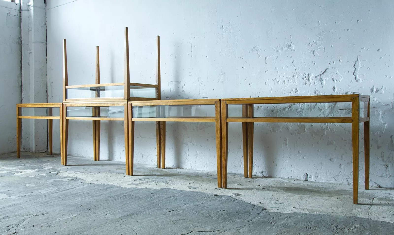 Stare przeszklone gabloty muzealne z lat 60. Wykonane z twardego drewna jesionowego, które zapewnia wysoką trwałość. Otwierane do góry i zamykane na zamek. Ich smukła konstrukcja i dobrze przemyślana proporcja sprawia, że prezentują się wyjątkowo dobrze i elegancko. Gabloty zachowane są w oryginalnym i bardzo dobrym stanie vintage, posiadają otarcia, zadrapania i obicia, które powstały przez długie lata użytkowania, ale to tylko świadczy o ich autentyczności i nadaje im charakteru. Konstrukcja jest stabilna a drewno suche bez zawilgocenia i nieprzyjemnych zapachów. Szyby są bez pęknięć, jedynie posiadają zarysowania spowodowane użytkowaniem. Jest to uniwersalny mebel, który może służyć jako witryna z biżuterią, lada sklepowa, lub jako konsola do eksponowania ukochanych przedmiotów.