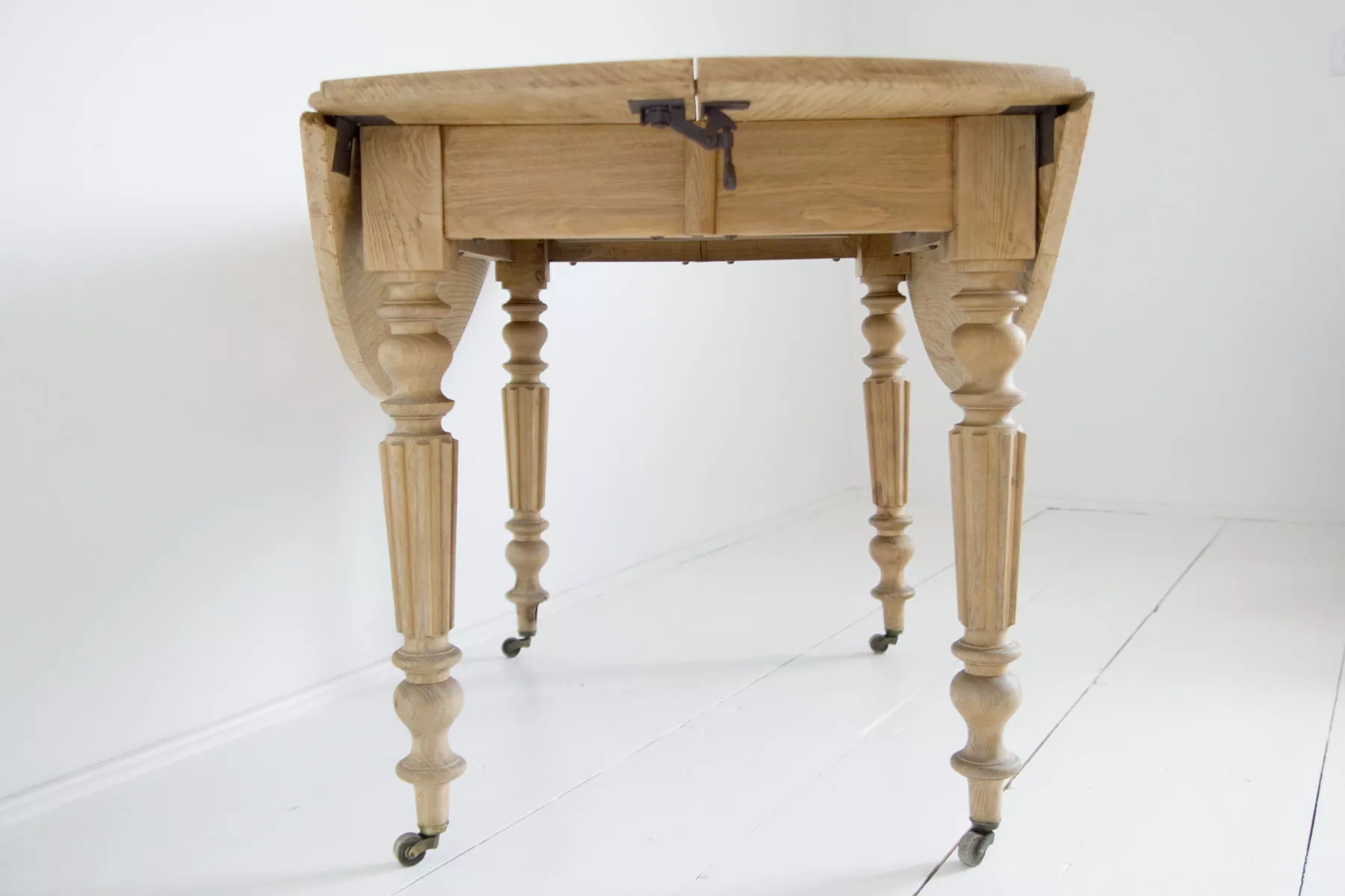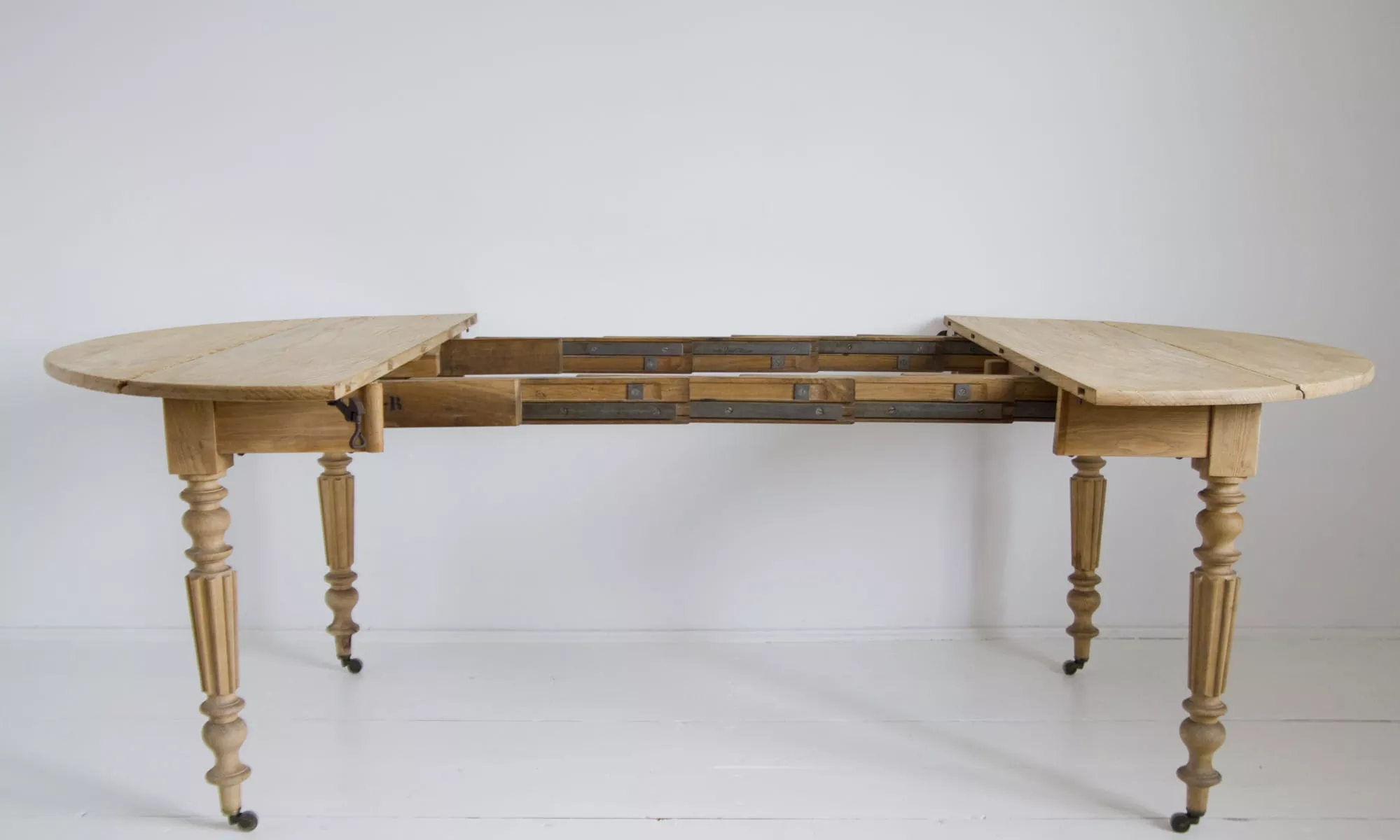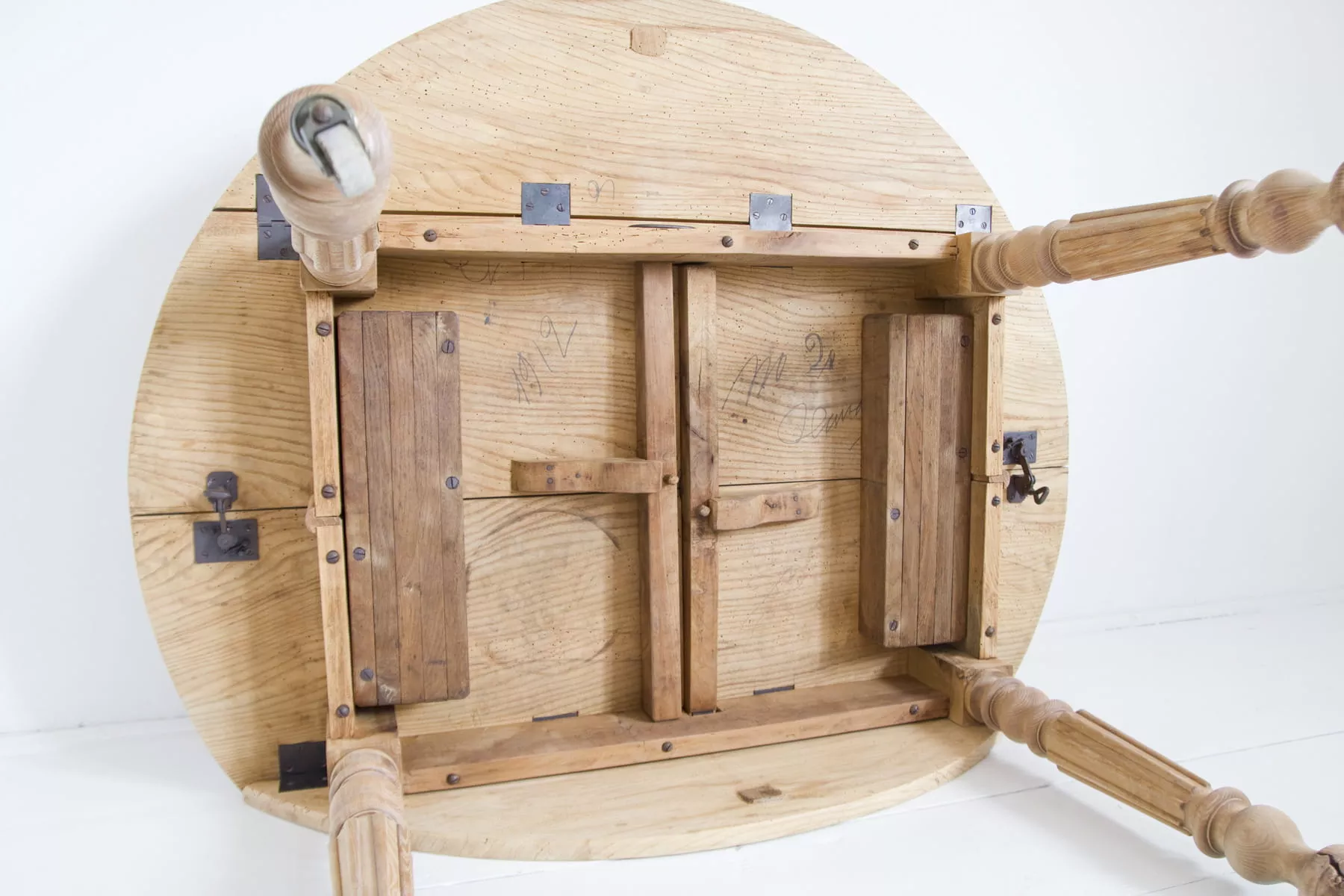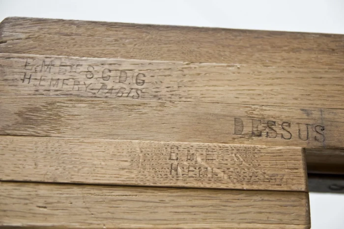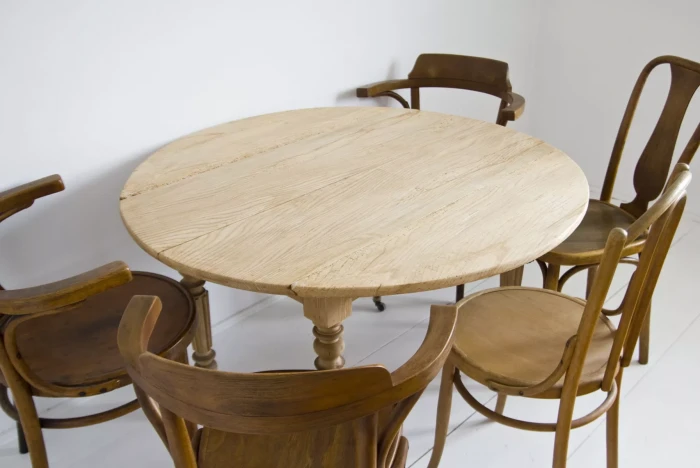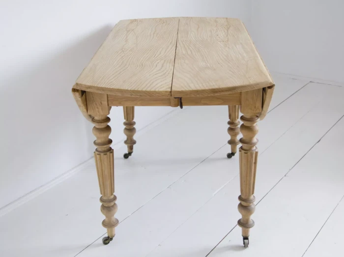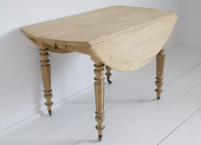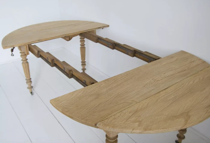 Stół rozkładany z 1912 r. Sygnowany '' E.M.Bte S.G.D.G H.EMERY PARIS. DESUS ''.Wykonany z drewna jesionowego w bardzo dobrym stanie jak na swoje lata, jedynie blat został trochę zaatakowany przez kornika, całość jest po oczyszczeniu w surowym wykończeniu. Mebel jest unikatowy, ponieważ jest wielofunkcyjny, jako złożony z opuszczonymi klapami może pełnić funkcje konsoli lub stolika salonowego, po rozłożeniu klap można użyć go jak biurka lub stołu kuchennego, a po dołożeniu dostawki przekształci się w duży stół salonowy na osiem osób. Stół jest gotowy do użytku lub indywidualnego wykończenia, na tym etapie można jeszcze zmienić odcień lub pozostawić tak jak jest.