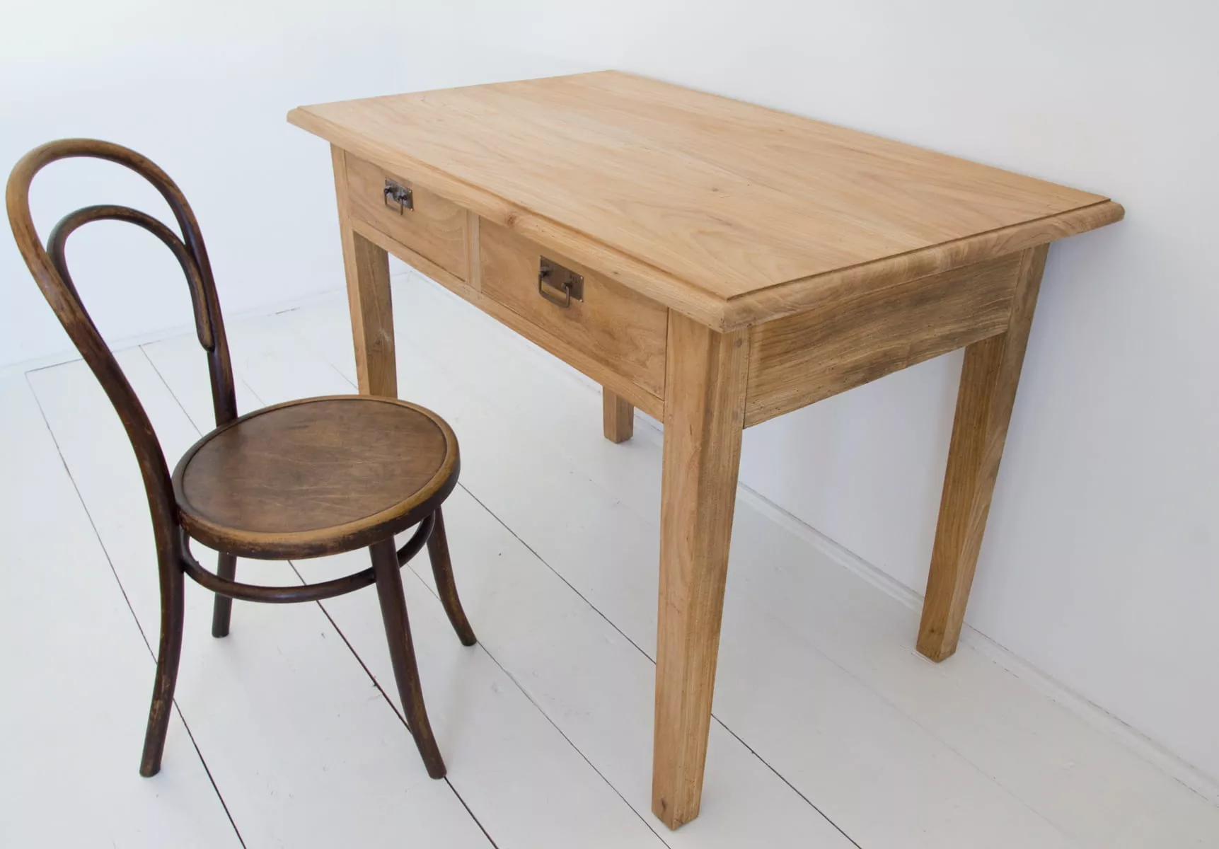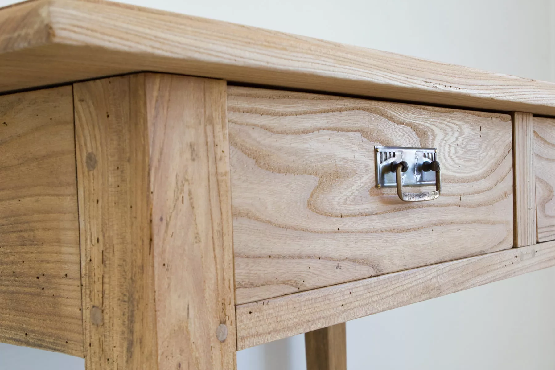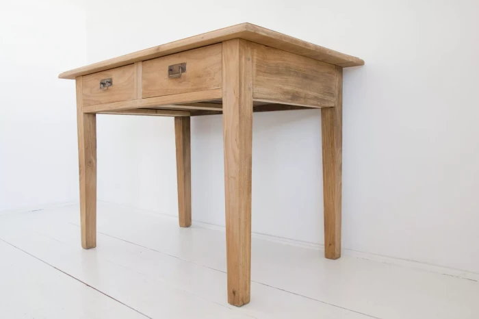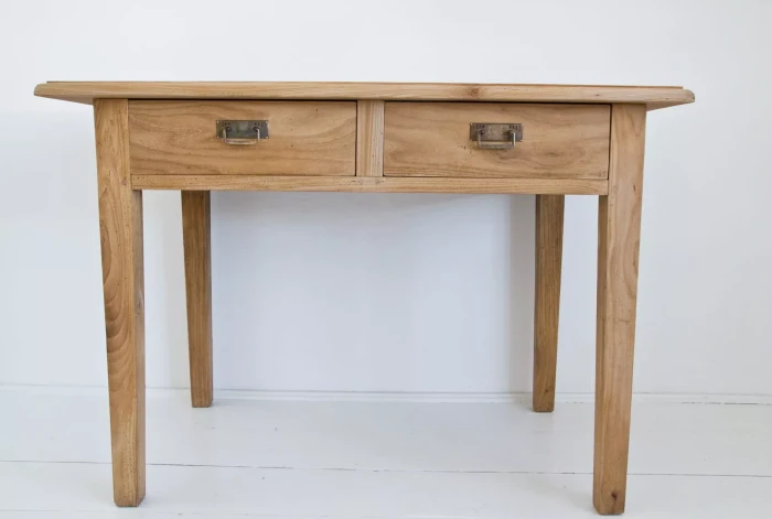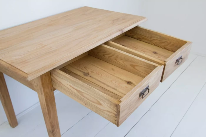 Masywny stół vintage z pojemnymi szufladami. Mebel wykonany jest z litego drewna jesionowego z pięknym usłojeniem, została usunięta politura i wymienione prowadnice od szuflad na nowe. Drewno jest suche i bez zapachu stęchlizny, konstrukcja bardzo stabilna. Całość jest gotowa do użytku lub indywidualnego wykończenia, na tym etapie można jeszcze zmienić odcień lub pozostawić tak jak jest.