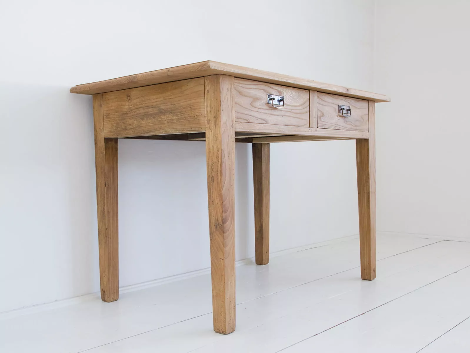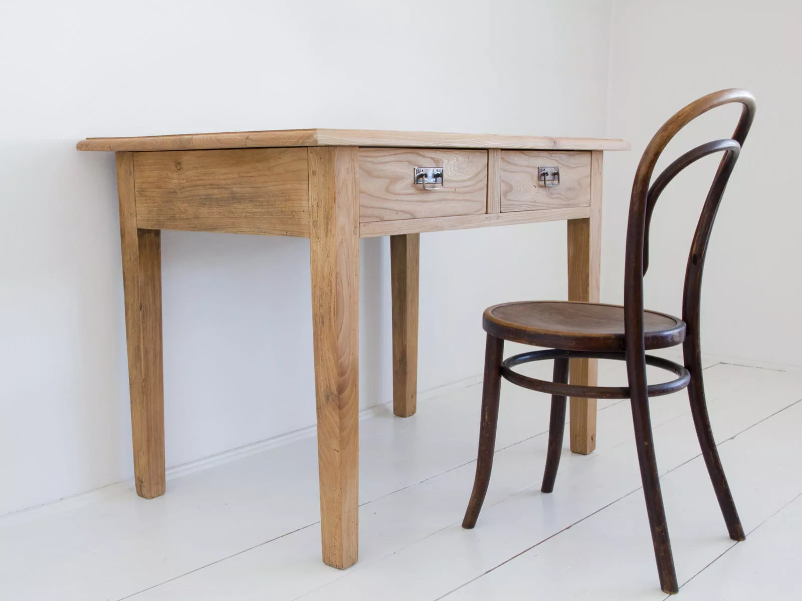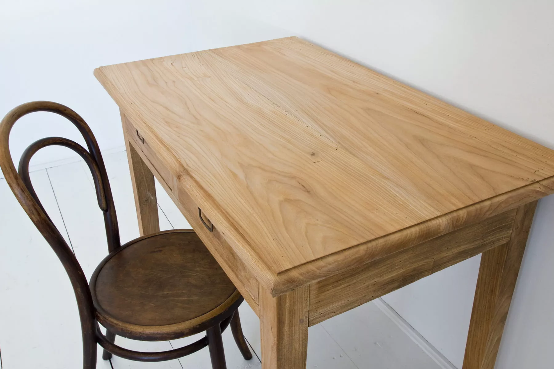 Masywny stół vintage z pojemnymi szufladami. Mebel wykonany jest z litego drewna jesionowego z pięknym usłojeniem, została usunięta politura i wymienione prowadnice od szuflad na nowe. Drewno jest suche i bez zapachu stęchlizny, konstrukcja bardzo stabilna. Całość jest gotowa do użytku lub indywidualnego wykończenia, na tym etapie można jeszcze zmienić odcień lub pozostawić tak jak jest.