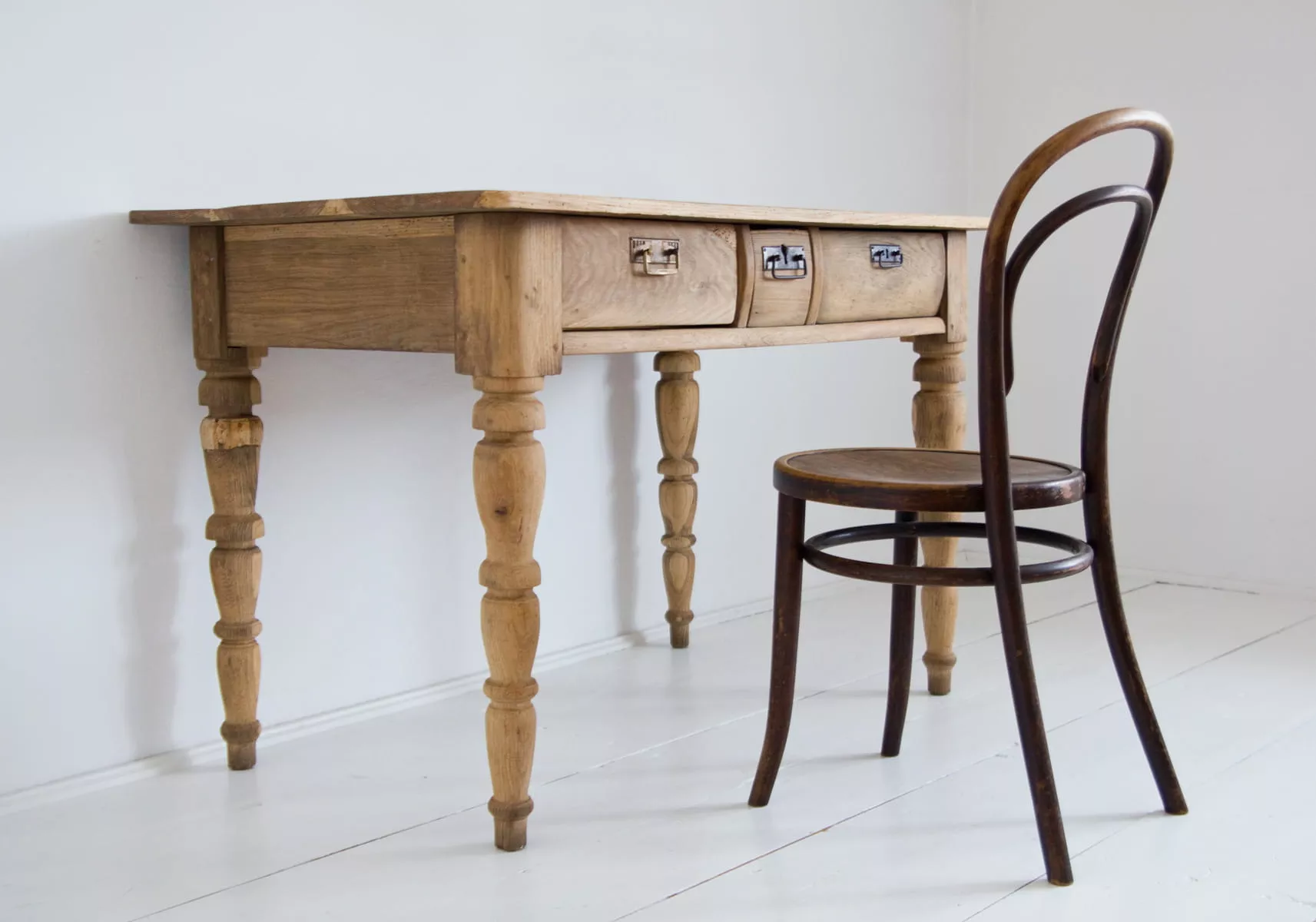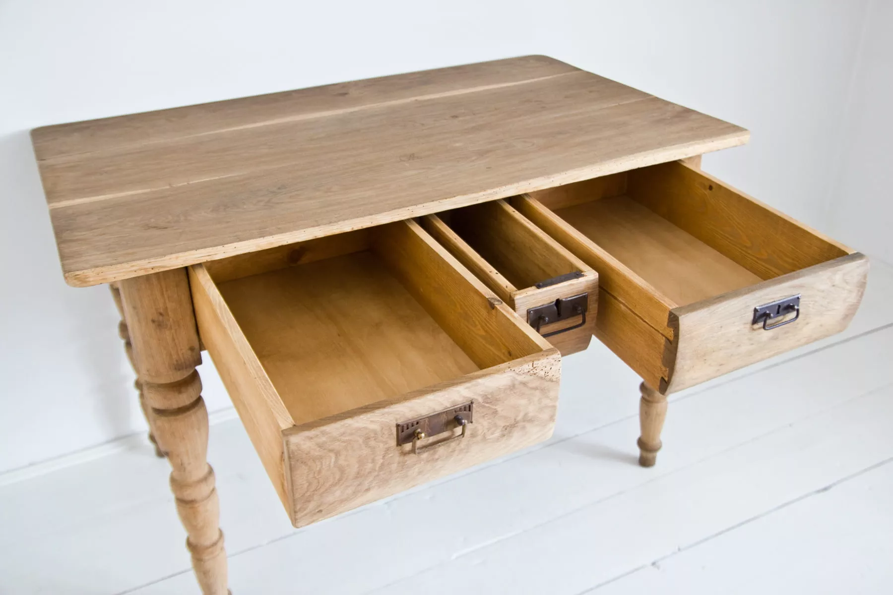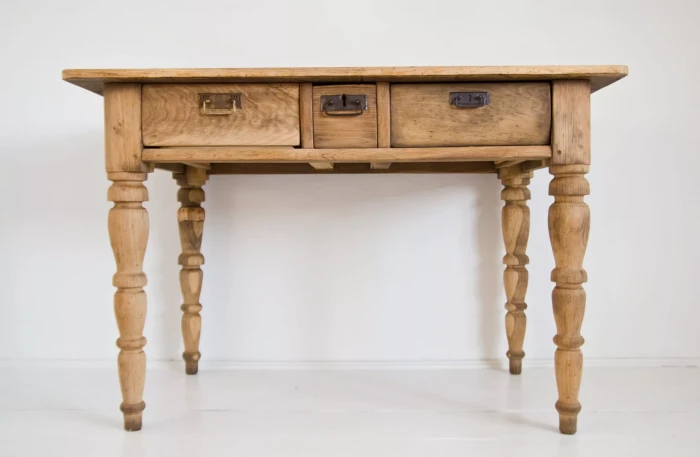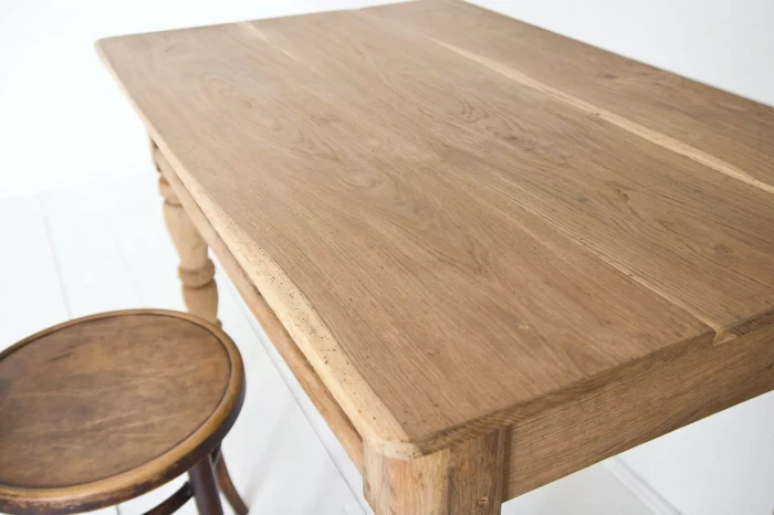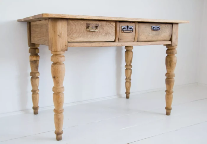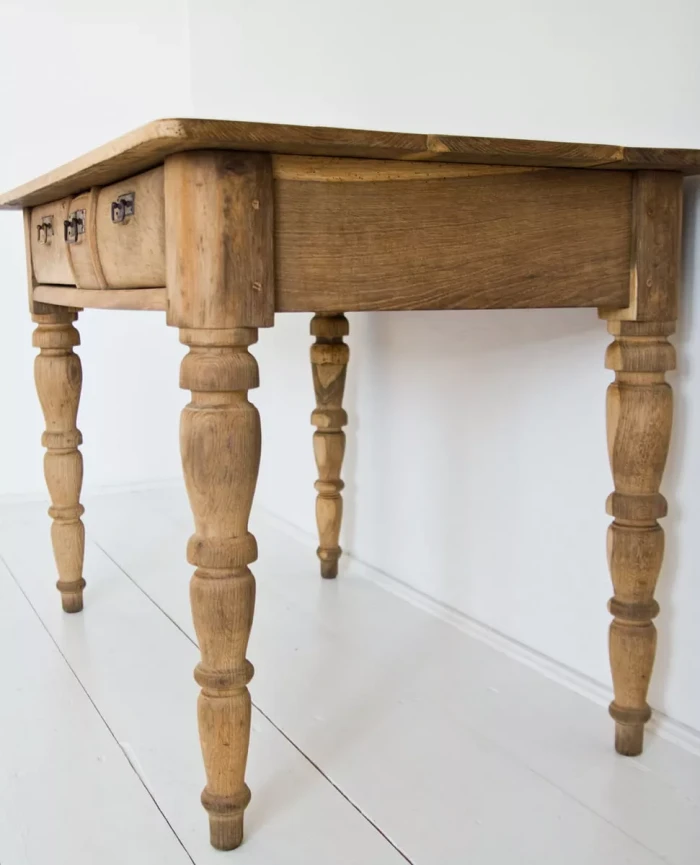 Stary stół dębowy na toczonych nogach z pojemnymi szufladami. W meblu zostały naprawione szuflady, reszta jest oryginalna. Drewno zostało oczyszczone i teraz jest w matowym wykończeniu. Stół jest stabilny bez zawilgocenia i nieprzyjemnych zapachów. Całość jest gotowa do użytku lub indywidualnego wykończenia, na tym etapie można jeszcze zmienić odcień lub pozostawić tak jak jest.
