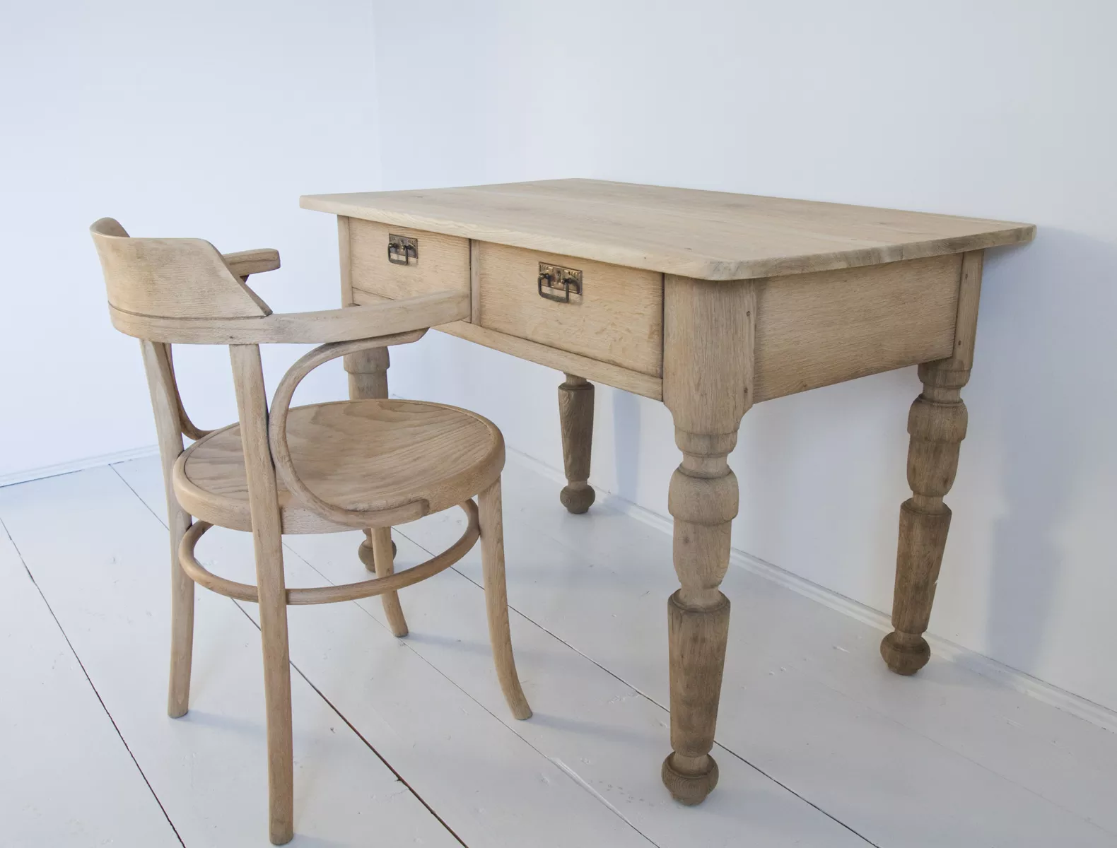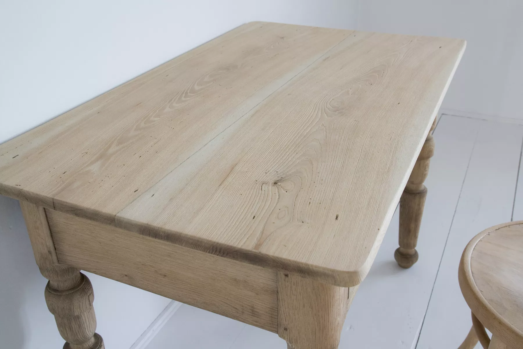 Polski dębowy stół z toczonymi nogami, drewno po oczyszczeniu. Całość jest bardzo stabilna, dwie pojemne szuflady wyłożone suknem. Stół jest gotowy do użytku lub indywidualnego wykończenia.