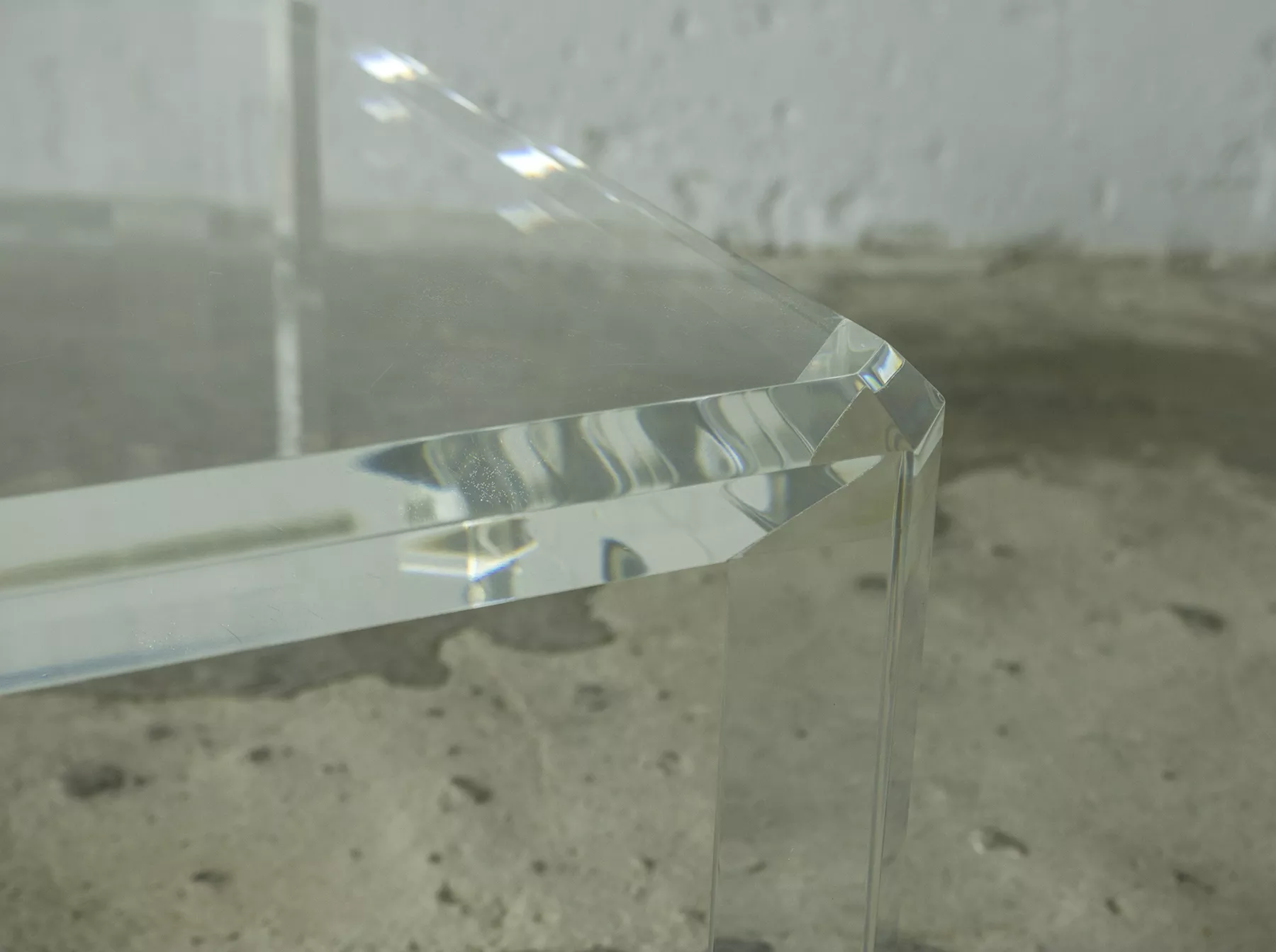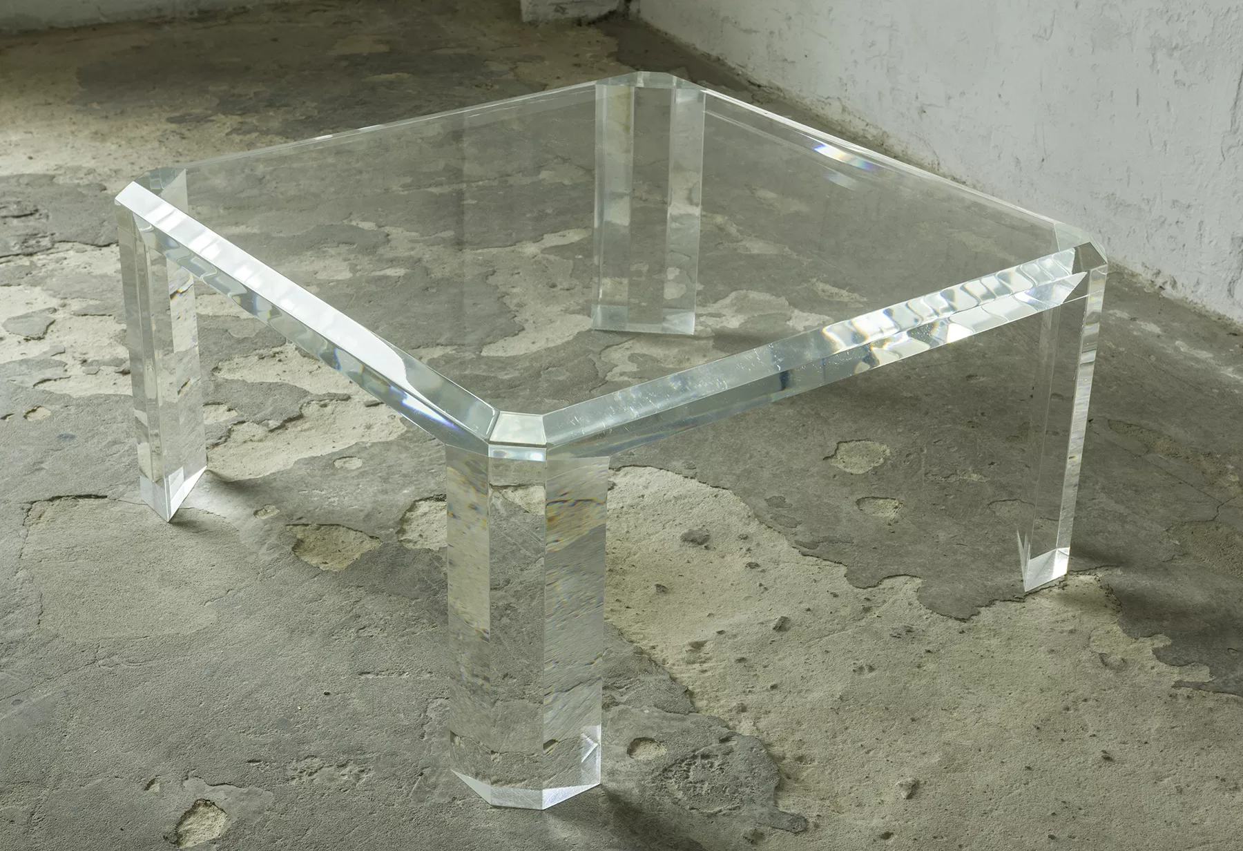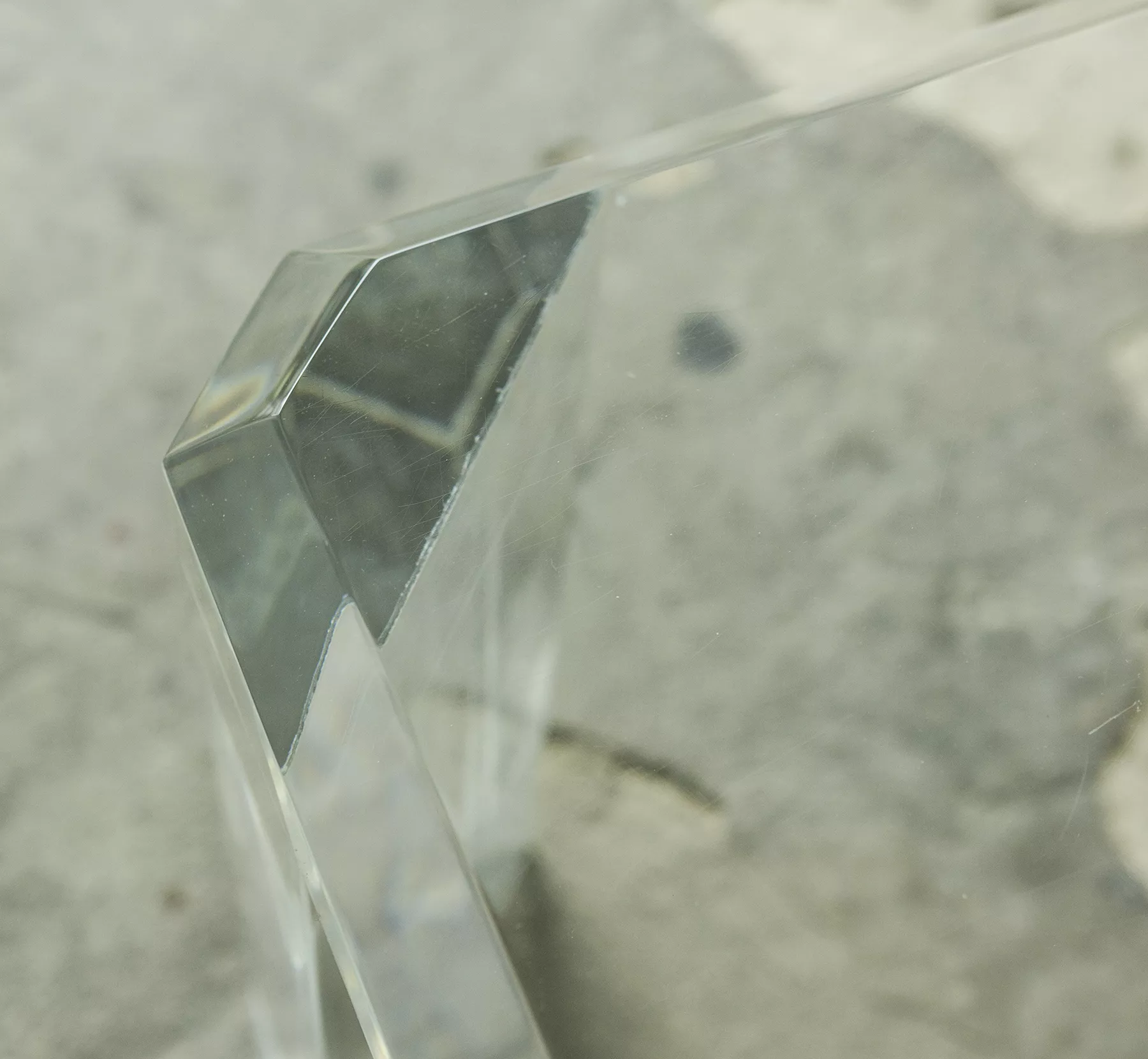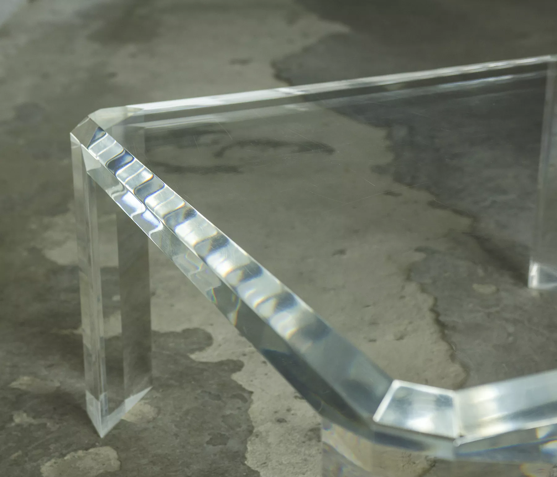 Geometryczny stolik wykonany z "lucite" potocznie zwany akrylem lub plexiglasem z lat 70, autorstwa znanego projektanta Charlesa Hollisa Jonesa. Ten ponadczasowy mebel charakteryzuje się eleganckim i minimalistycznym wzornictwem, przezroczysty materiał lucite dodaje nowoczesnego i lekkiego charakteru, a solidna konstrukcja z bardzo grubego akrylu zapewnia trwałość i stabilność. Dzięki ściętym narożnikom i krawędziom stolik działa jak pryzmat, przepięknie załamuje i rozczepia światło na kolory tęczy. Zachowany jest w oryginalnym i bardzo dobrym stanie. Posiada nieliczne zadrapani i obicia związane z latami użytkowania.
