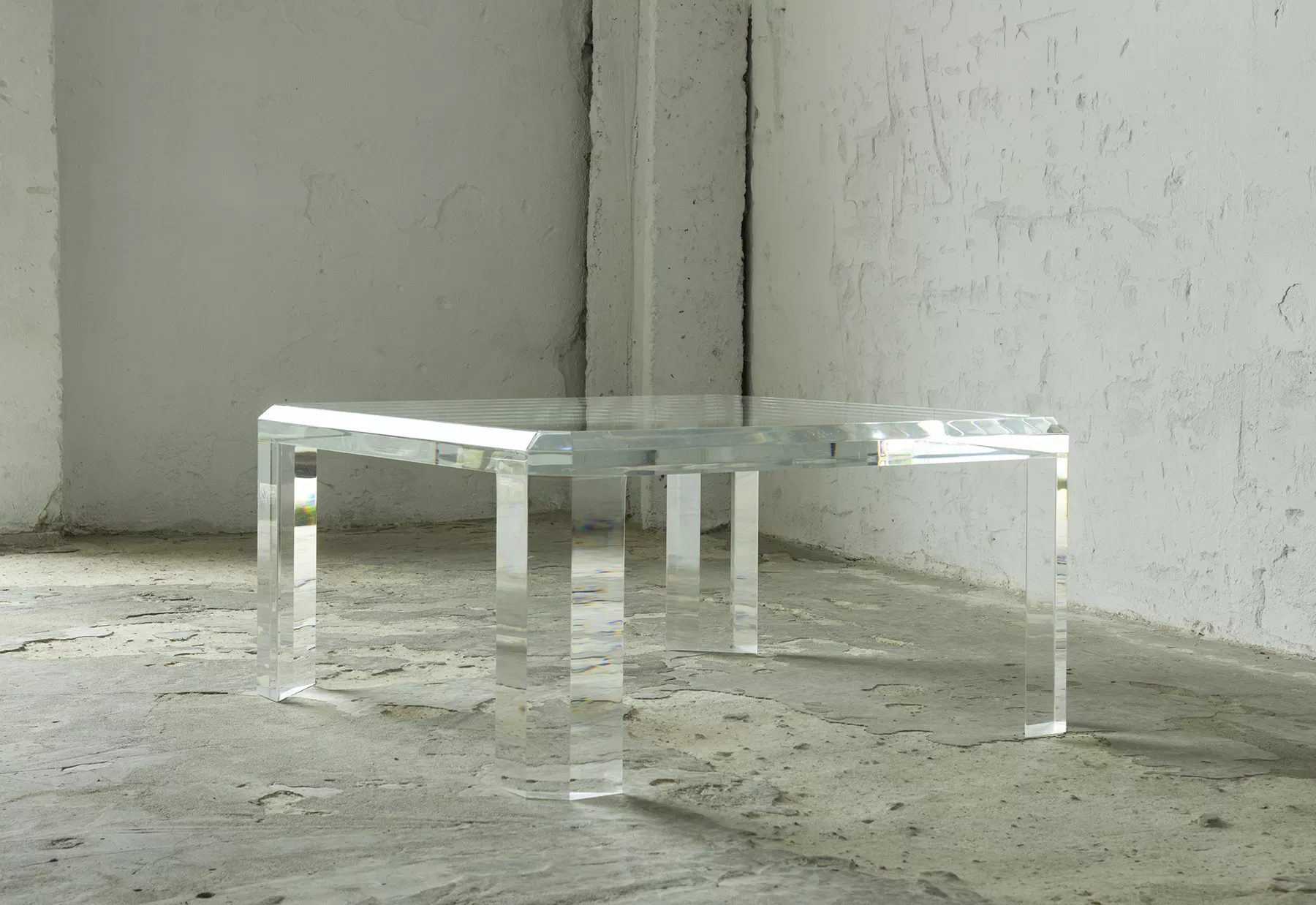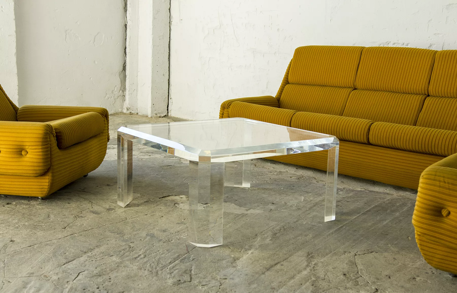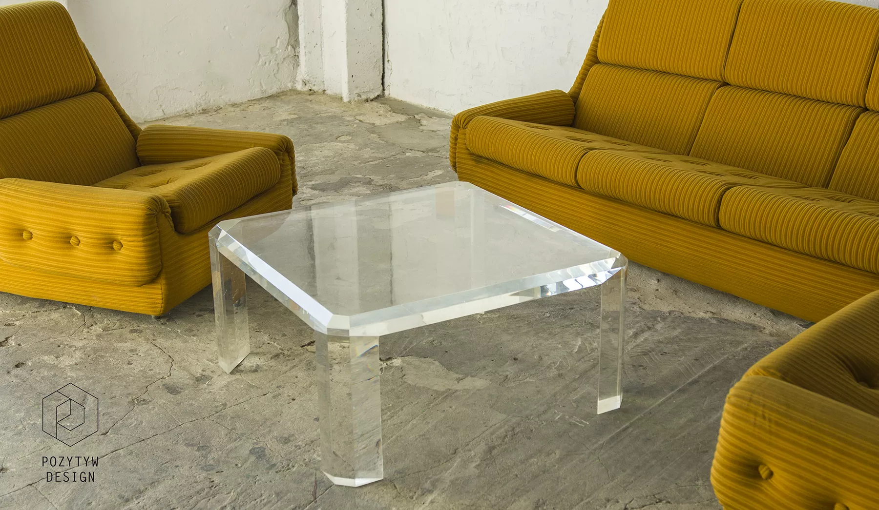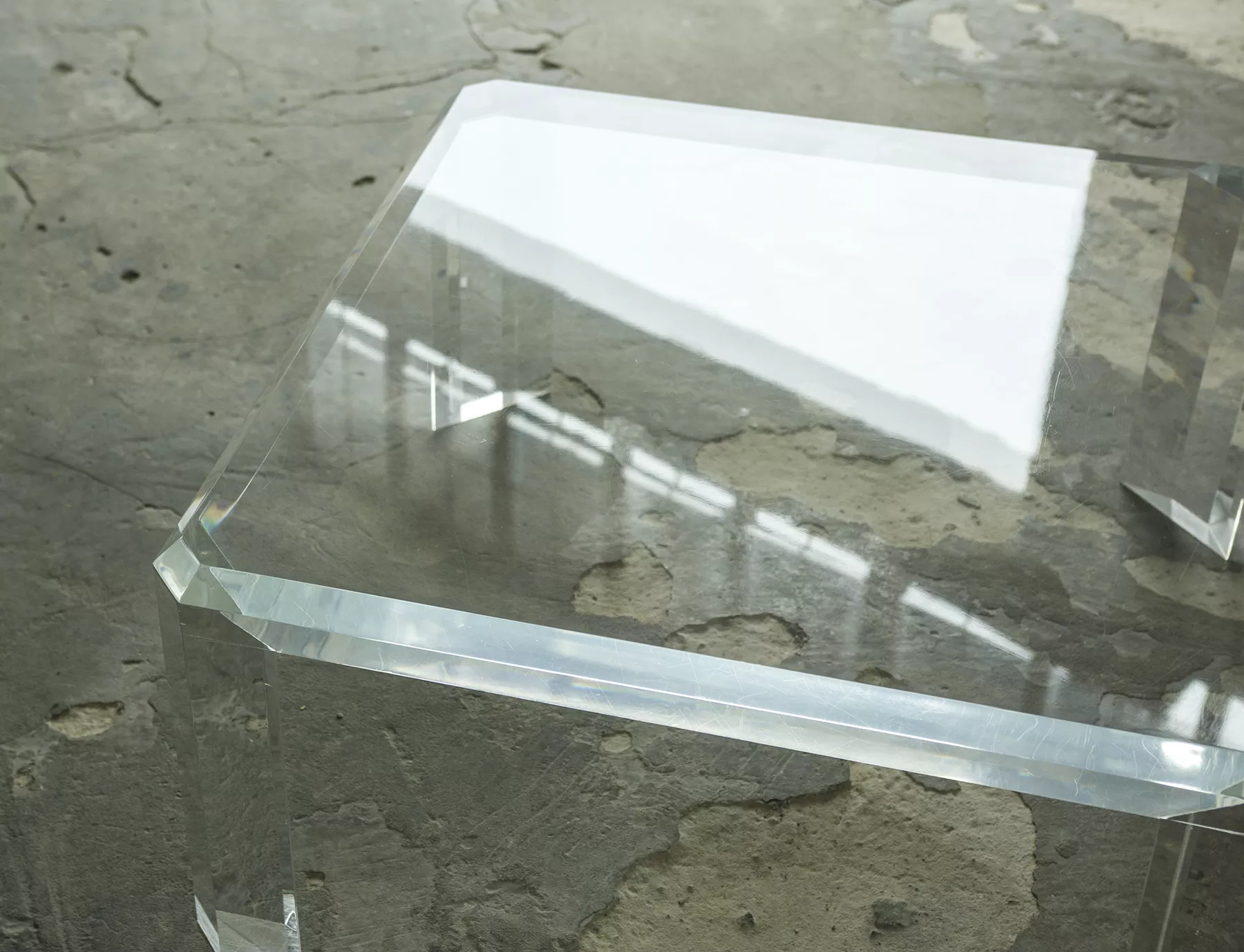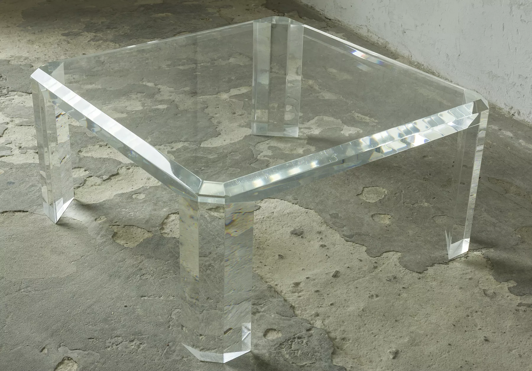 Geometryczny stolik wykonany z "lucite" potocznie zwany akrylem lub plexiglasem z lat 70, autorstwa znanego projektanta Charlesa Hollisa Jonesa. Ten ponadczasowy mebel charakteryzuje się eleganckim i minimalistycznym wzornictwem, przezroczysty materiał lucite dodaje nowoczesnego i lekkiego charakteru, a solidna konstrukcja z bardzo grubego akrylu zapewnia trwałość i stabilność. Dzięki ściętym narożnikom i krawędziom stolik działa jak pryzmat, przepięknie załamuje i rozczepia światło na kolory tęczy. Zachowany jest w oryginalnym i bardzo dobrym stanie. Posiada nieliczne zadrapani i obicia związane z latami użytkowania.
