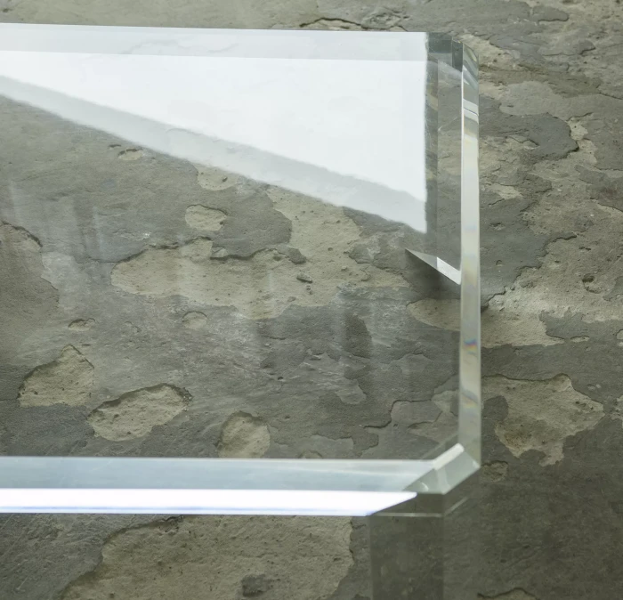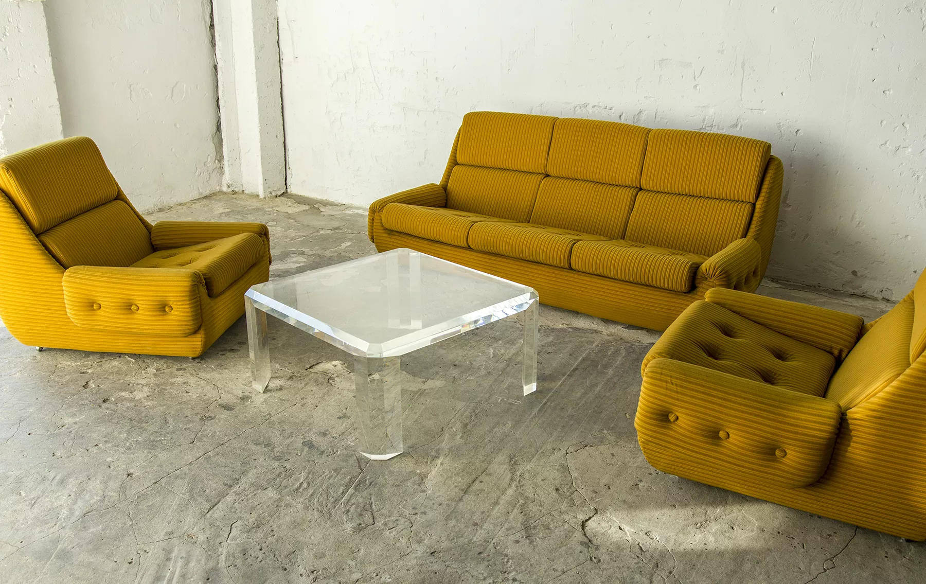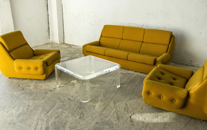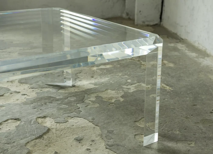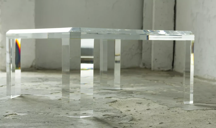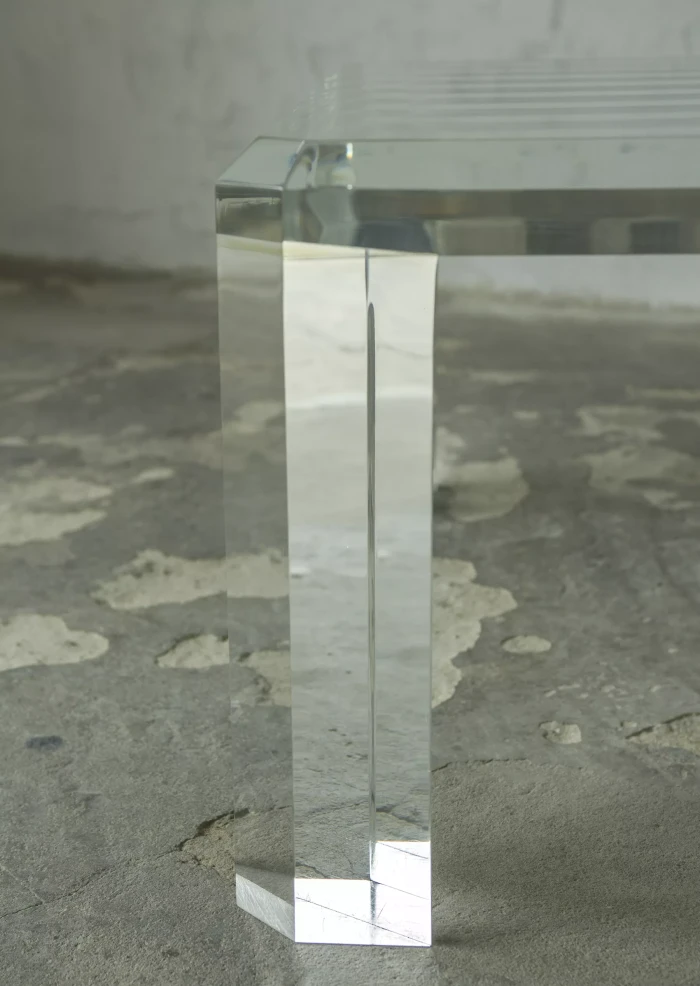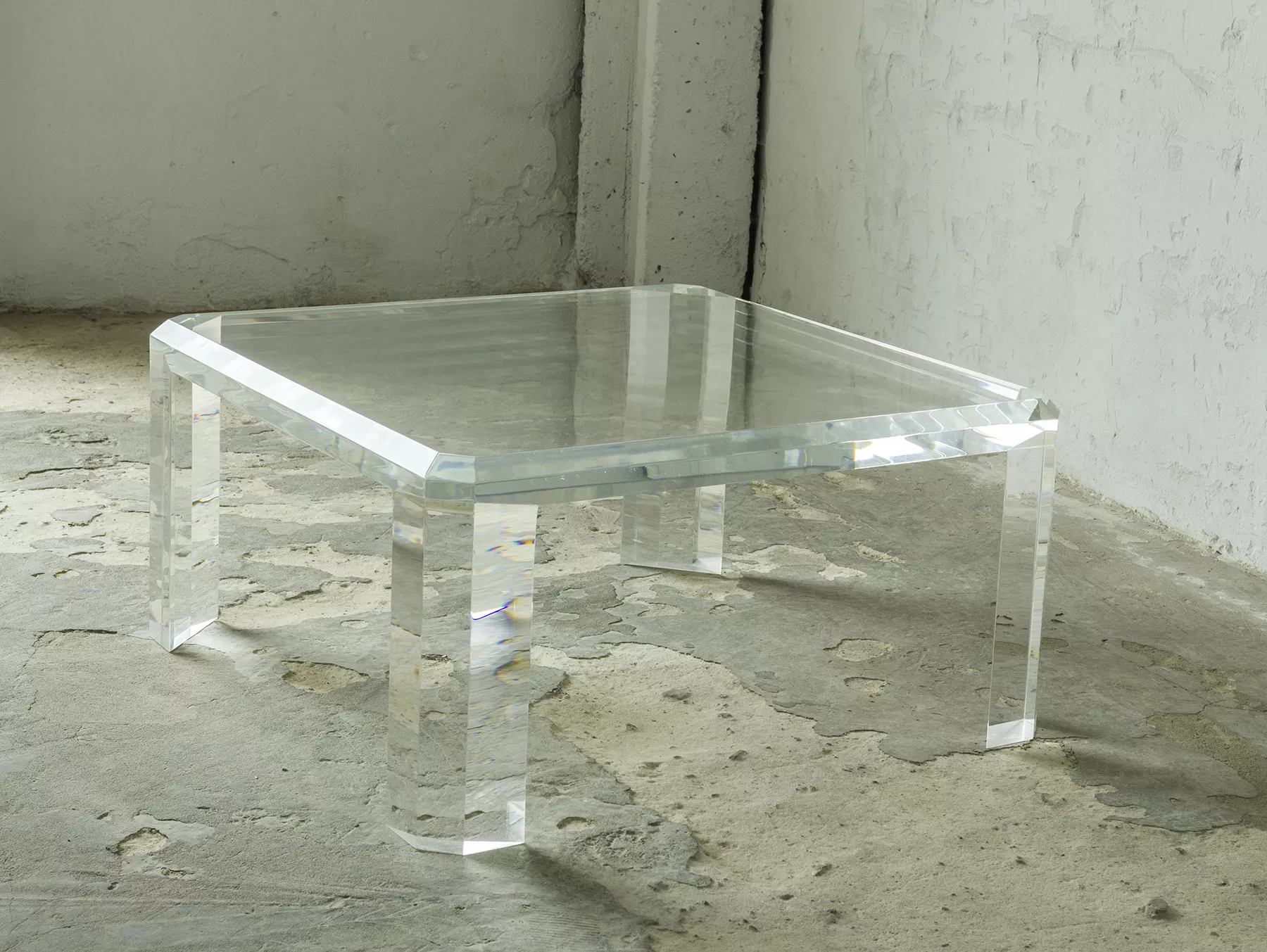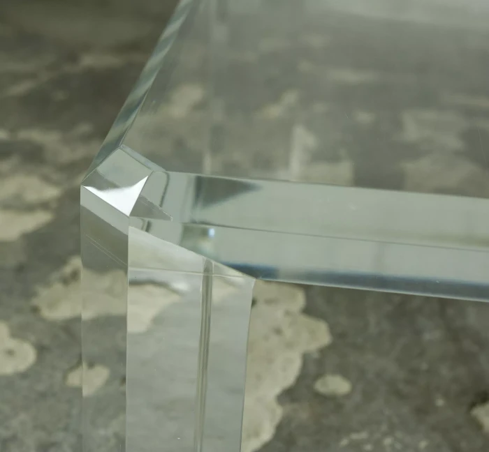 Geometryczny stolik wykonany z "lucite" potocznie zwany akrylem lub plexiglasem z lat 70, autorstwa znanego projektanta Charlesa Hollisa Jonesa. Ten ponadczasowy mebel charakteryzuje się eleganckim i minimalistycznym wzornictwem, przezroczysty materiał lucite dodaje nowoczesnego i lekkiego charakteru, a solidna konstrukcja z bardzo grubego akrylu zapewnia trwałość i stabilność. Dzięki ściętym narożnikom i krawędziom stolik działa jak pryzmat, przepięknie załamuje i rozczepia światło na kolory tęczy. Zachowany jest w oryginalnym i bardzo dobrym stanie. Posiada nieliczne zadrapani i obicia związane z latami użytkowania.